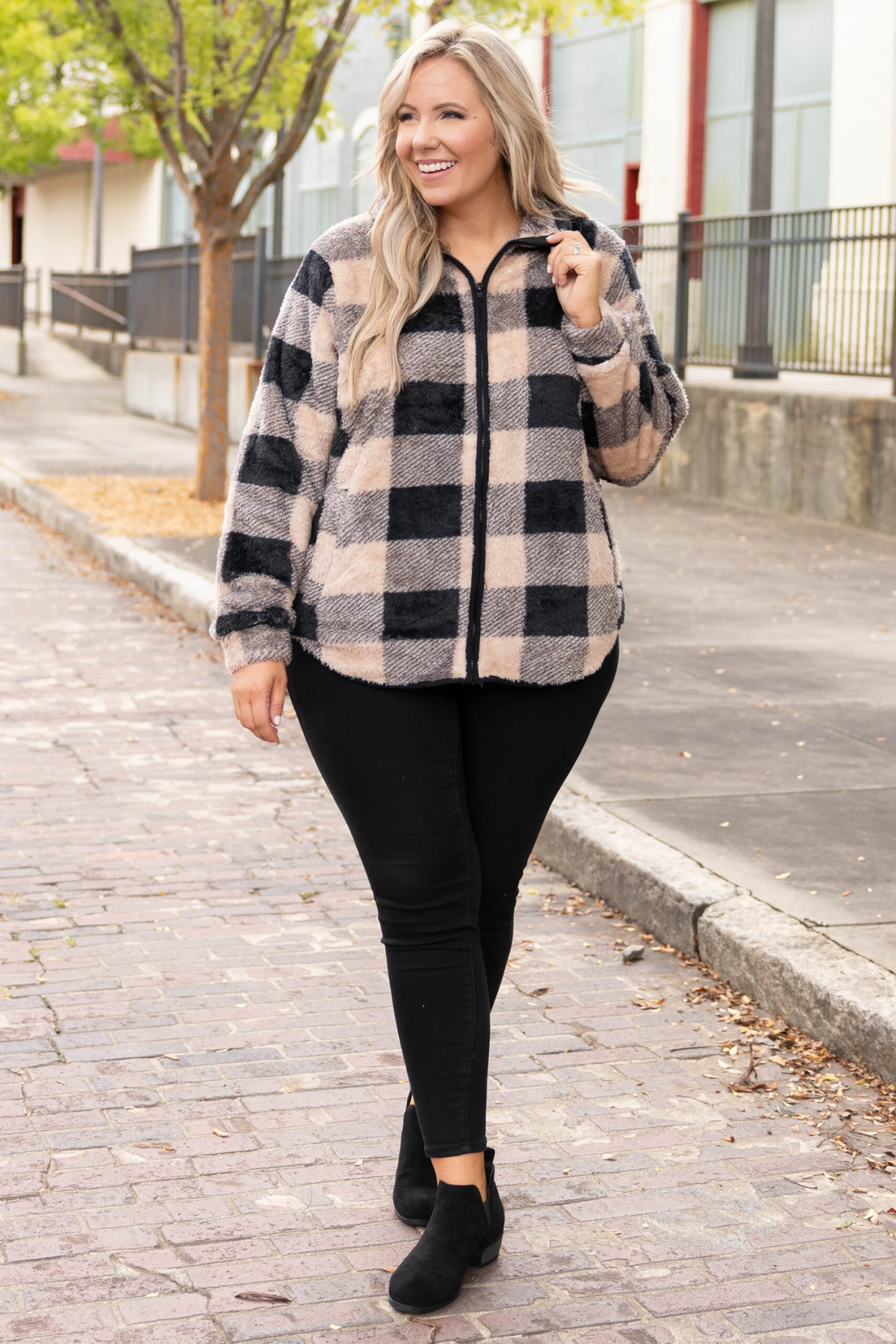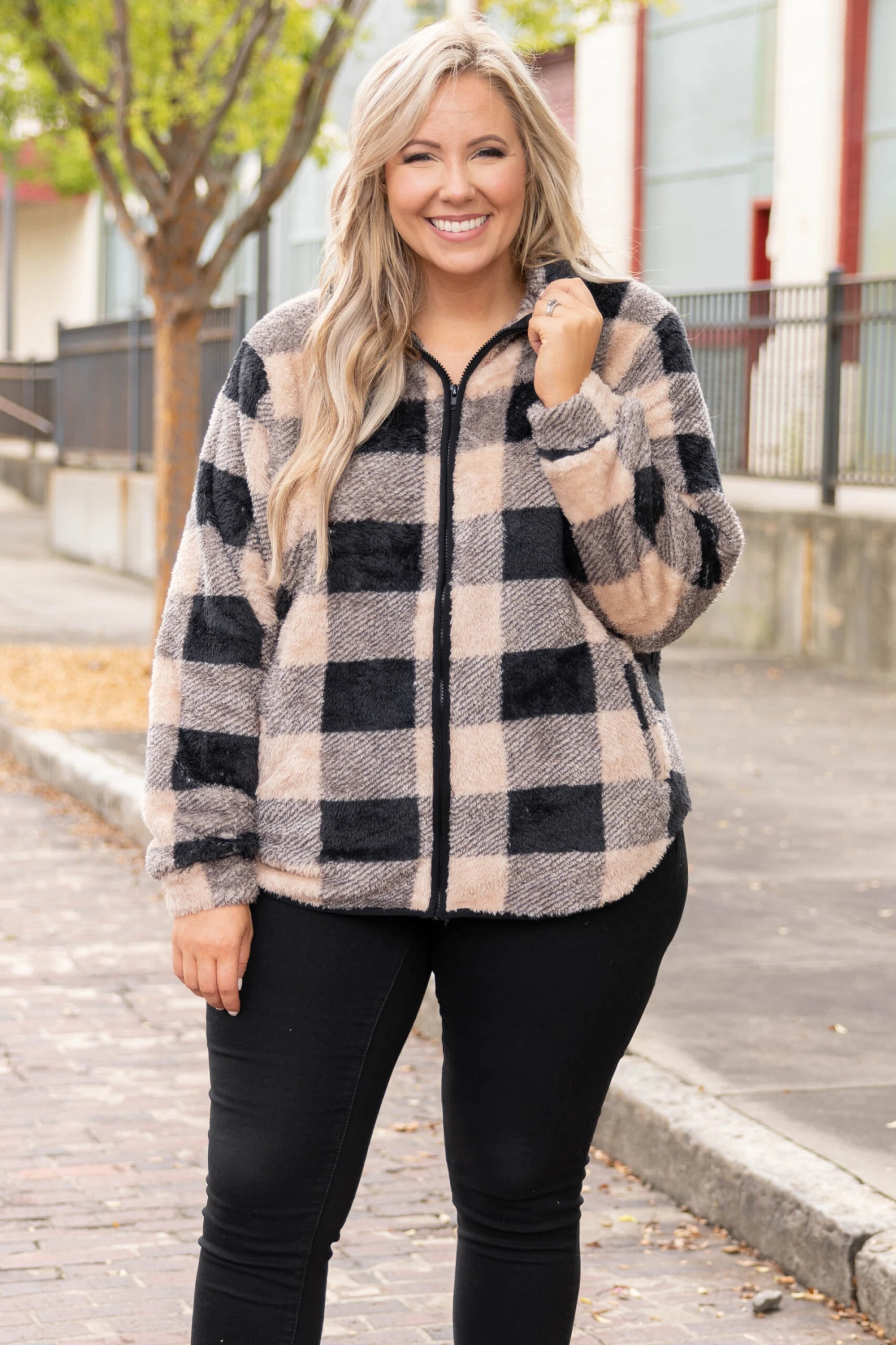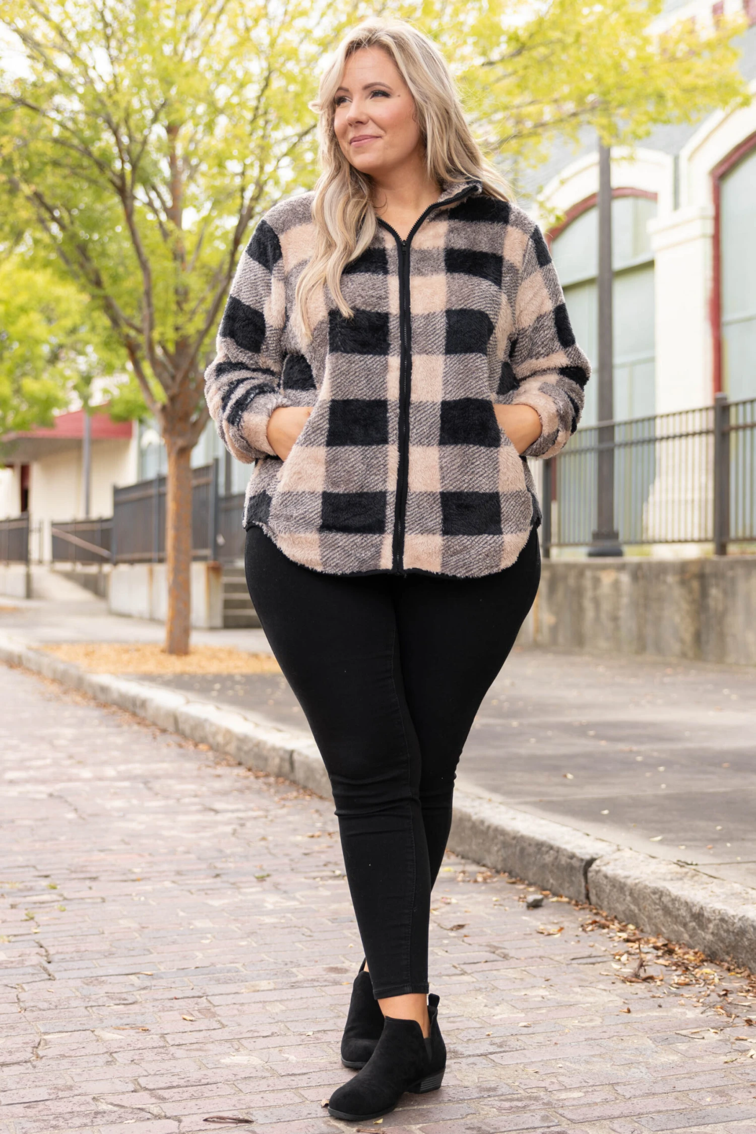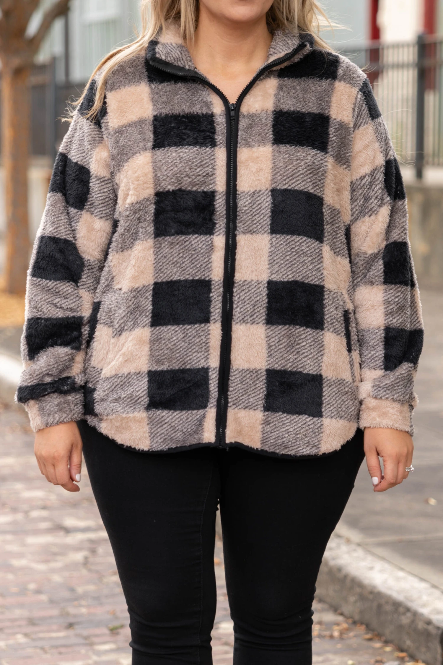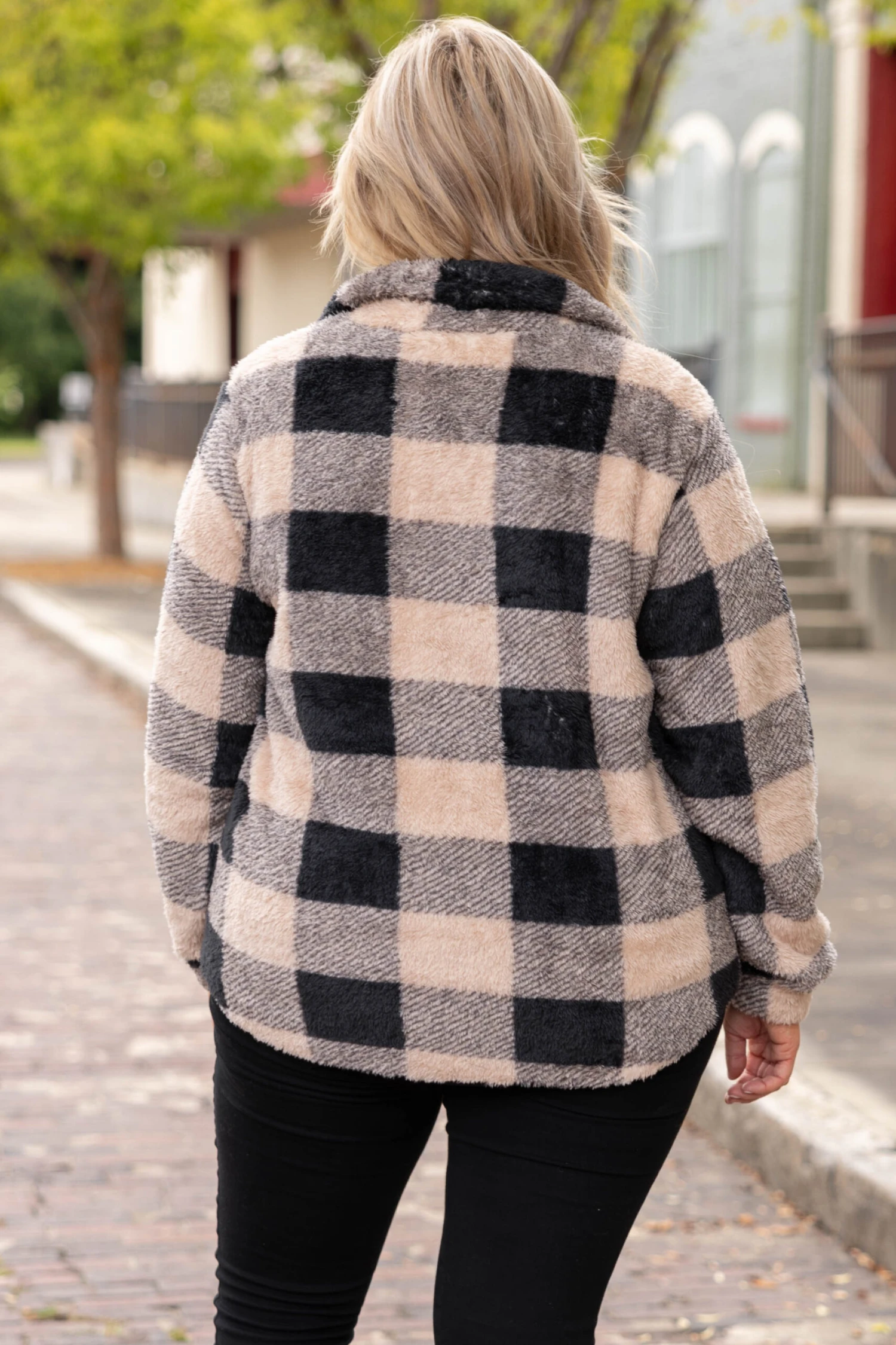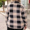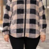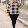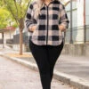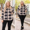 We simply love this adorable jacket! This jacket has a lovely black base color and a plaid pattern that is SO chic! The cozy material and functional pockets make this the perfect layering piece for the season!Â