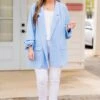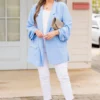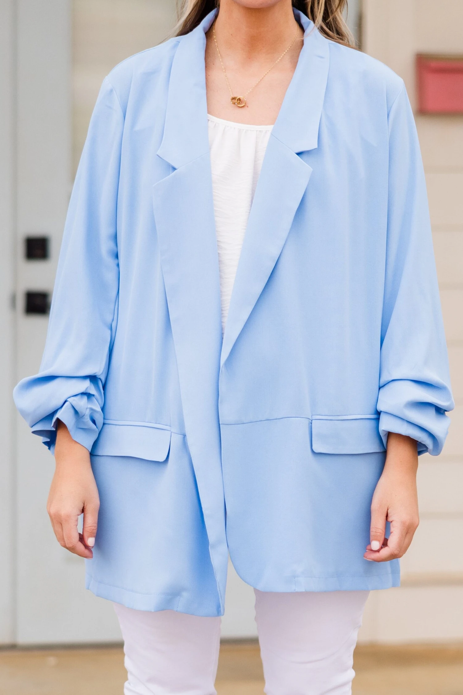 Delight in having this beauty in your wardrobe! Expertly designed for fashion-forward individuals, this blazer features elegant ruched sleeves and a stunning sky blue color! Perfect for layering over a dress or denim for a sophisticated and chic look! Elevate your style game with this must-have blazer!
