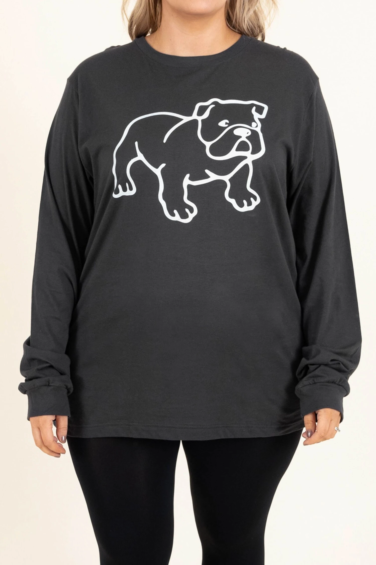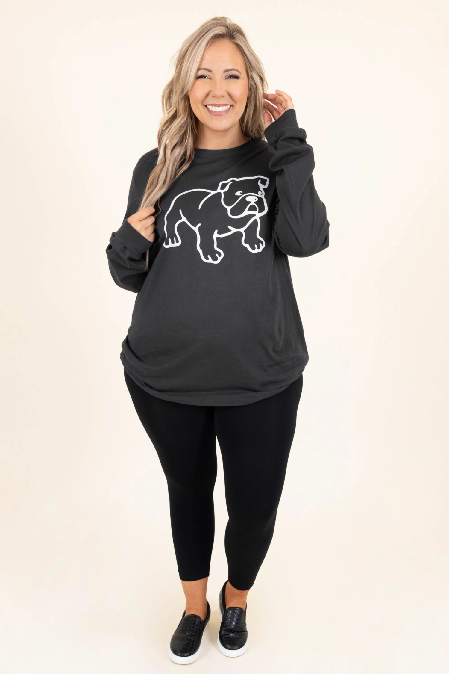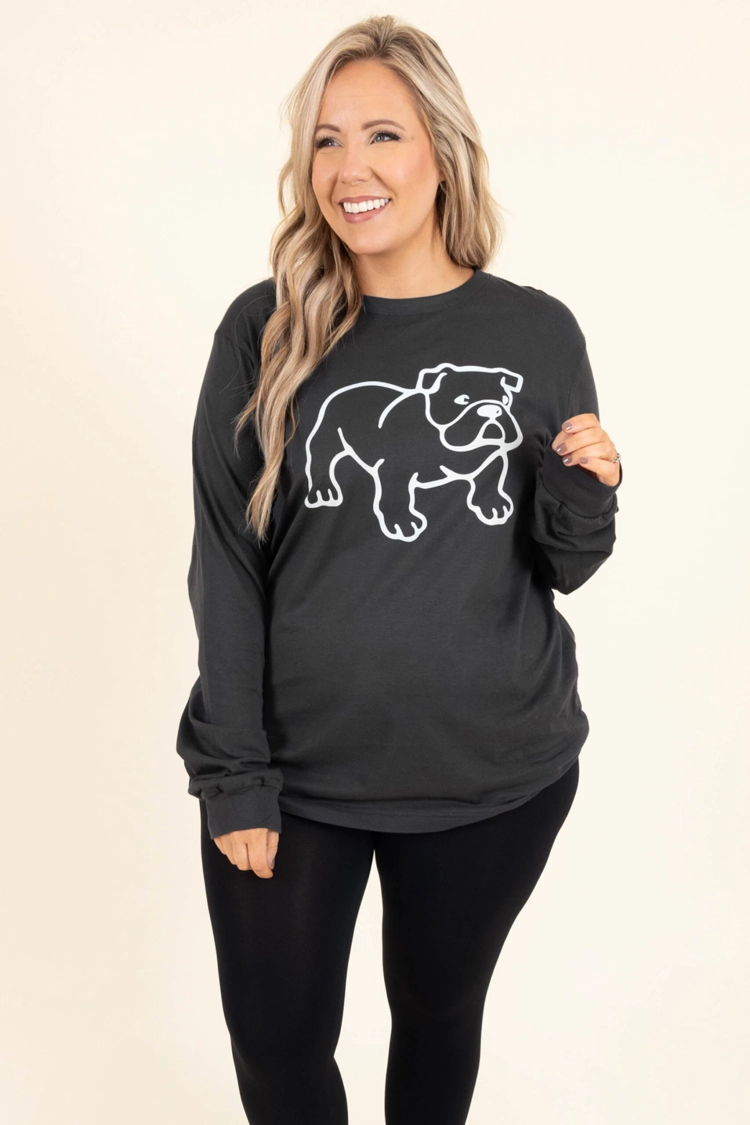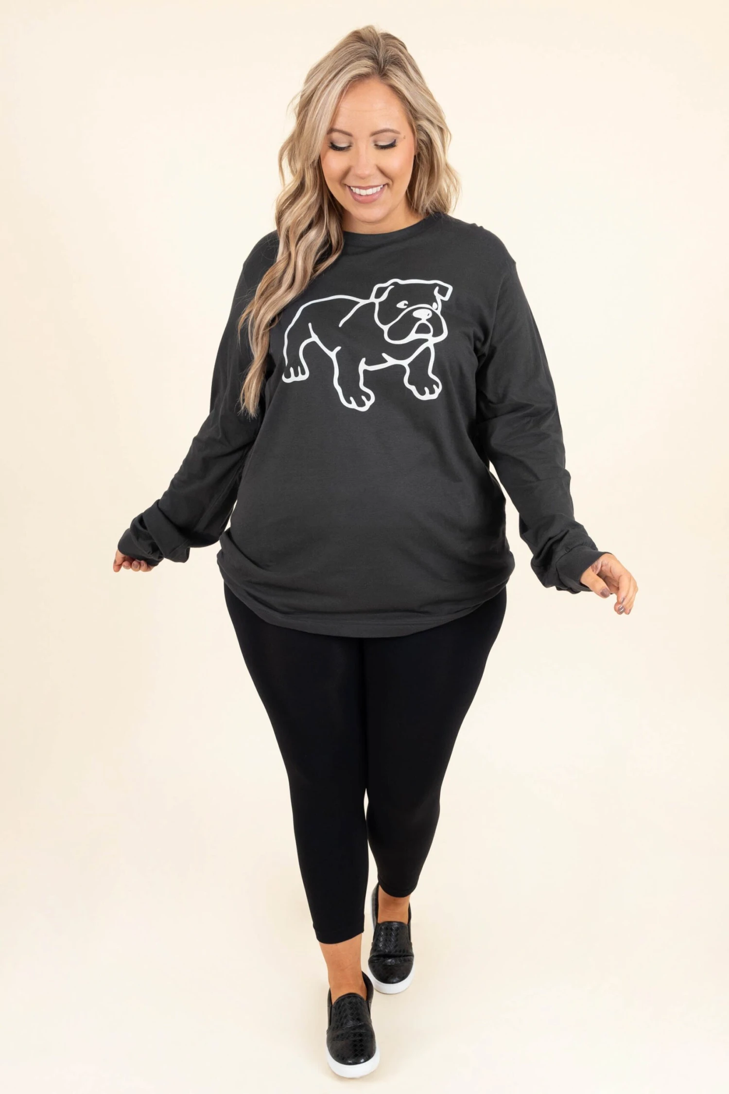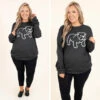 This top is definitely one of our favorites! The adorable graphic and stretchy material are the perfect combo for your new every day fave top! Simply style this top with some leggings and slides for a casual, chic look!