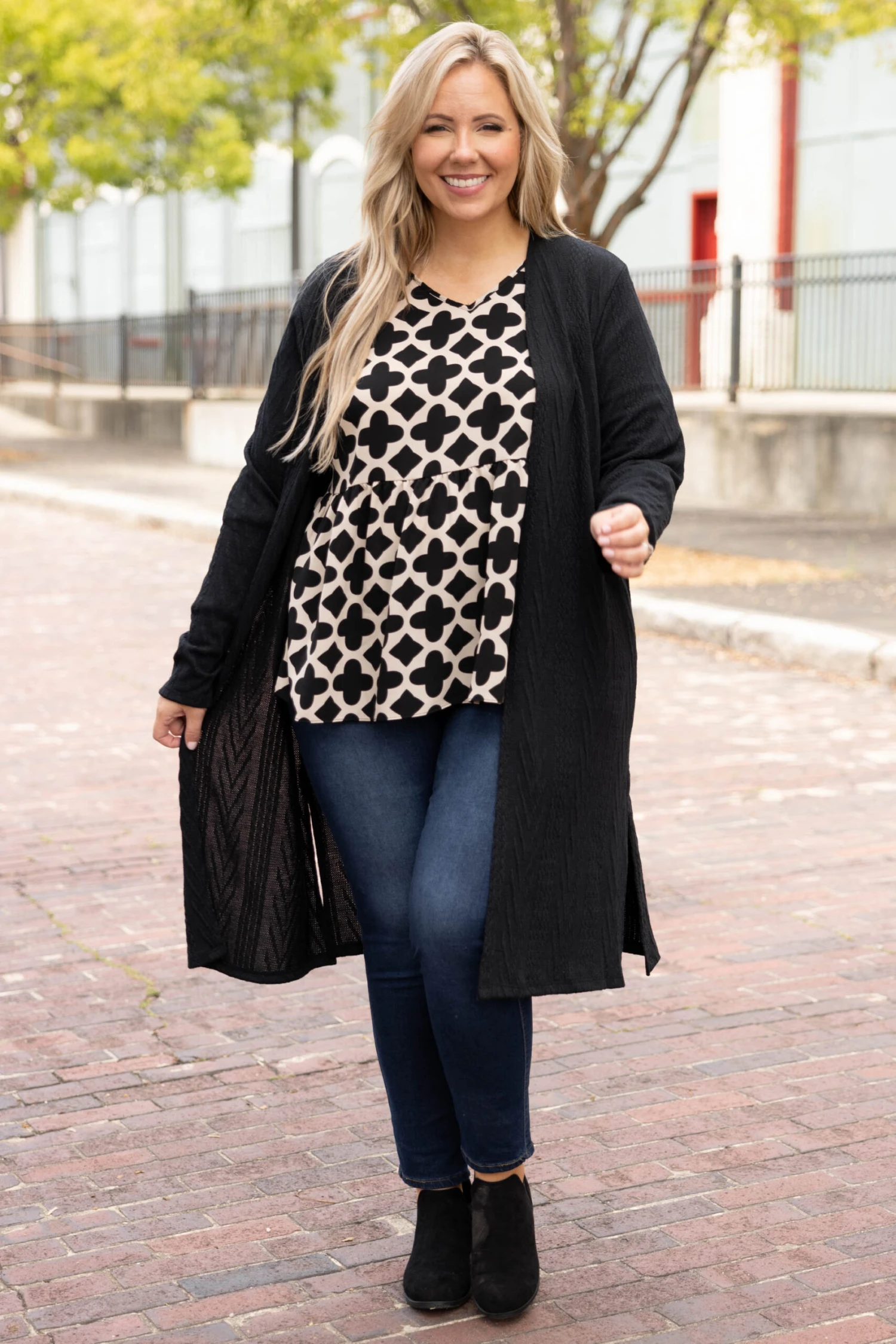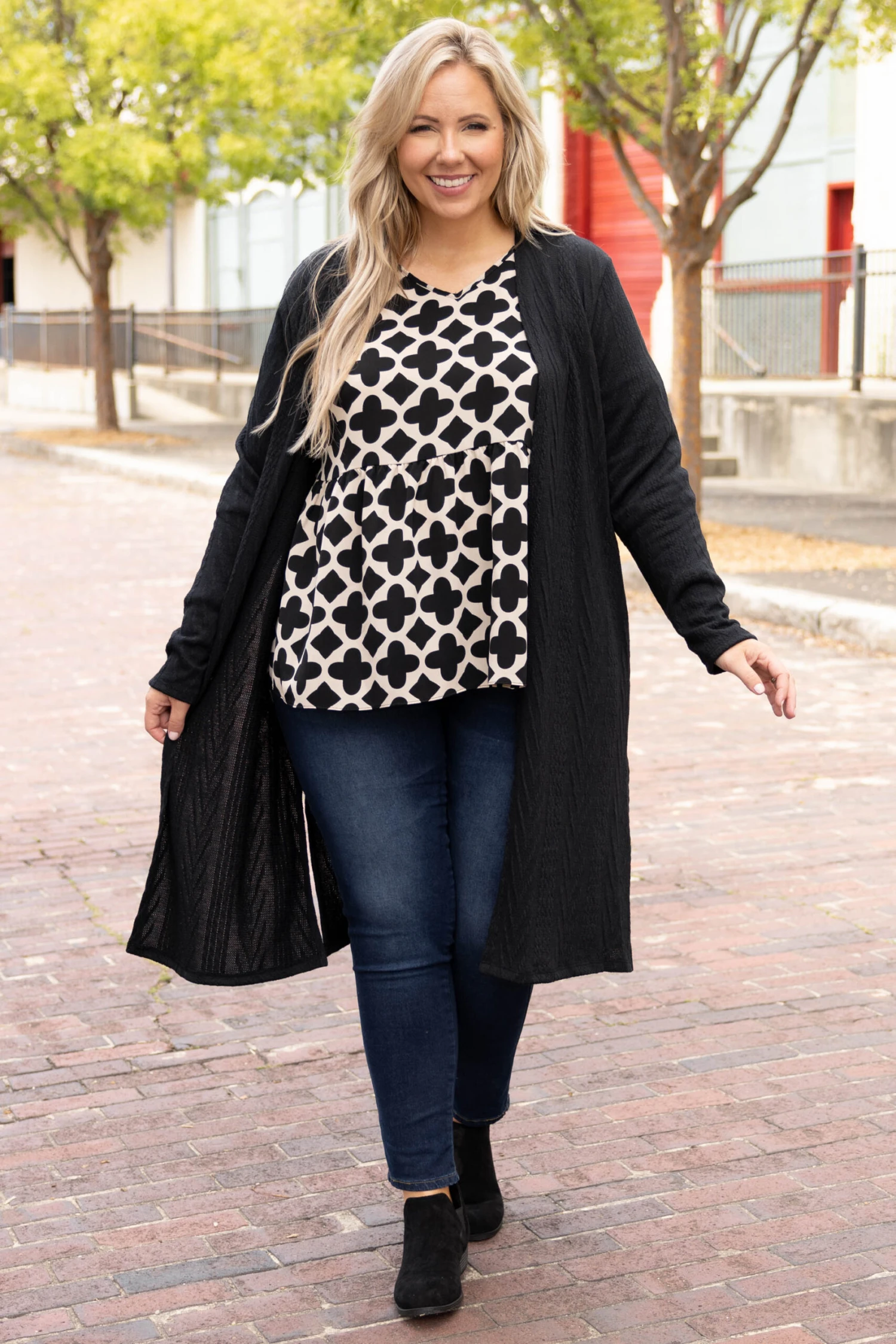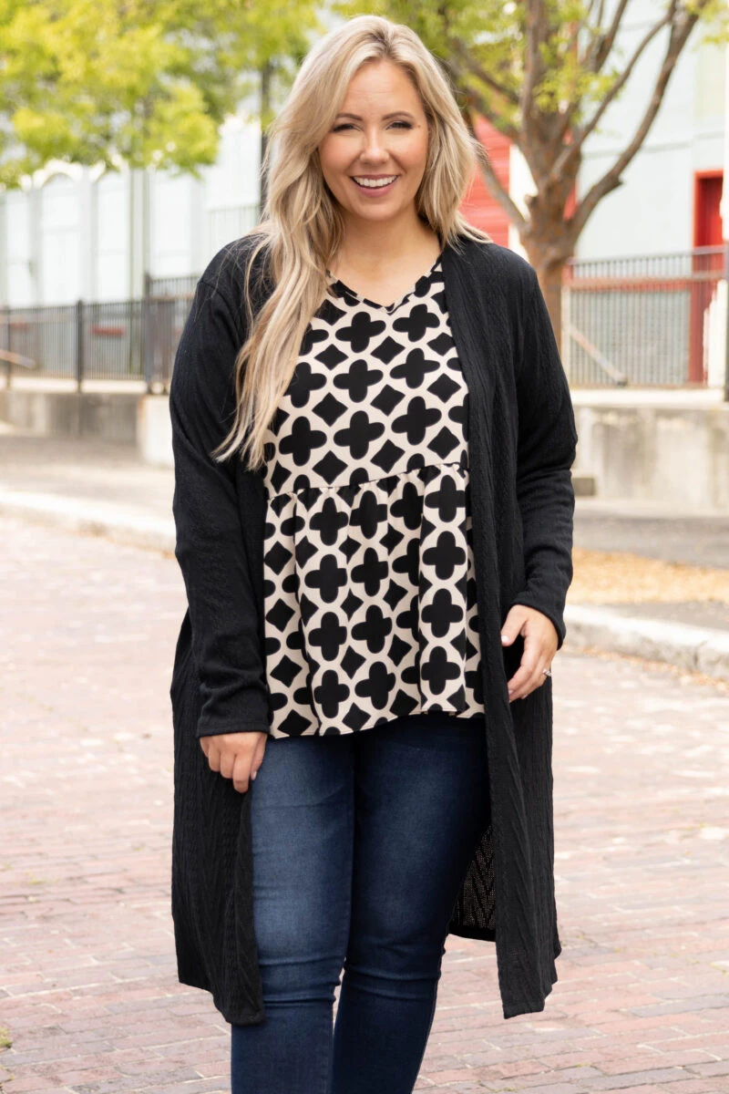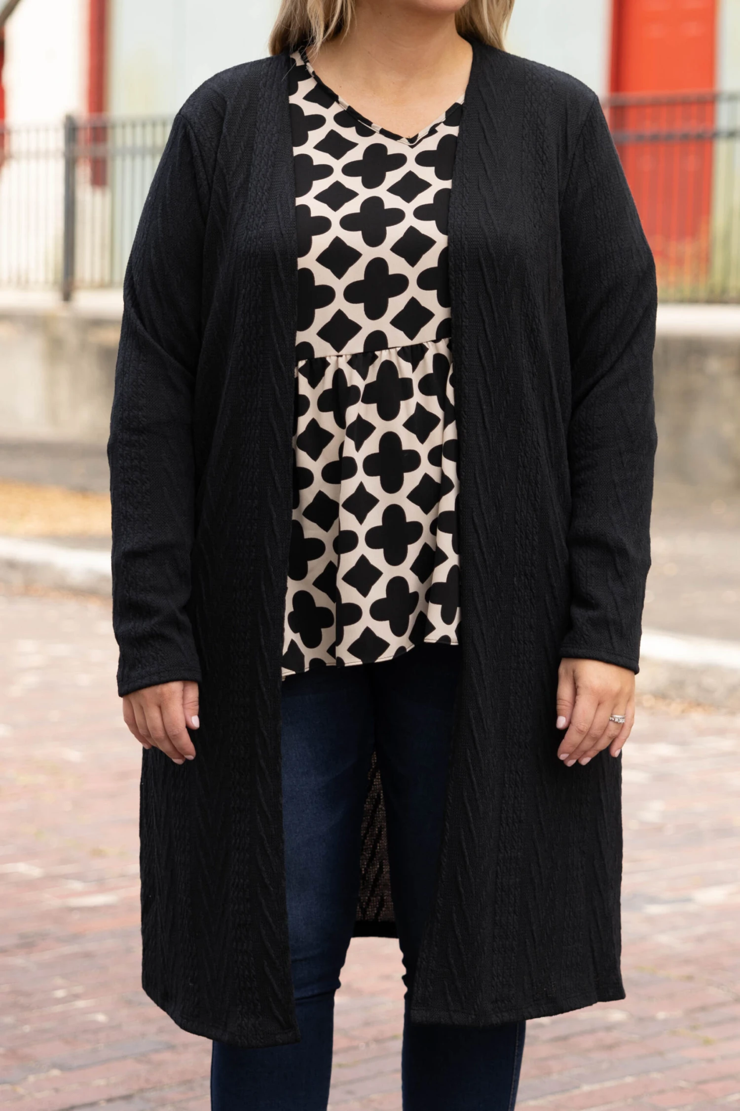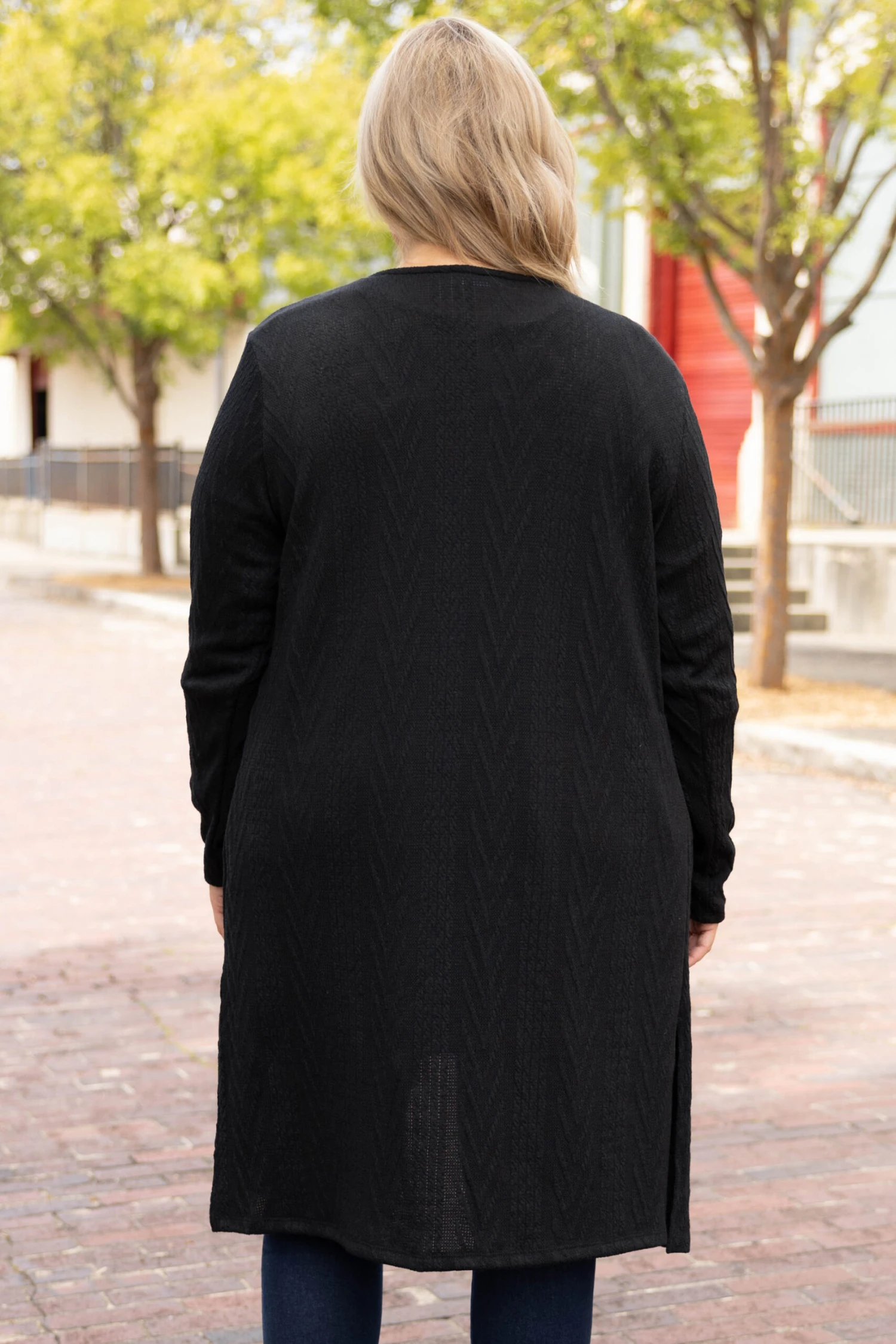 Grab this beauty and create some new memories! This lightweight cardigan has a classic, black color that is perfect to pair with all of your favorite outfits this season! The ribbed texture and flowy fit is SO sweet! Style this cardigan with a sassy dress or a cute top and skinnies for a classic, chic look!Â