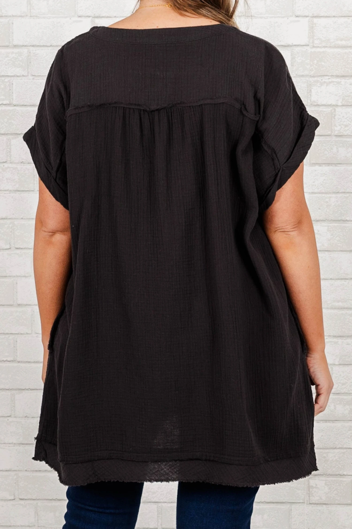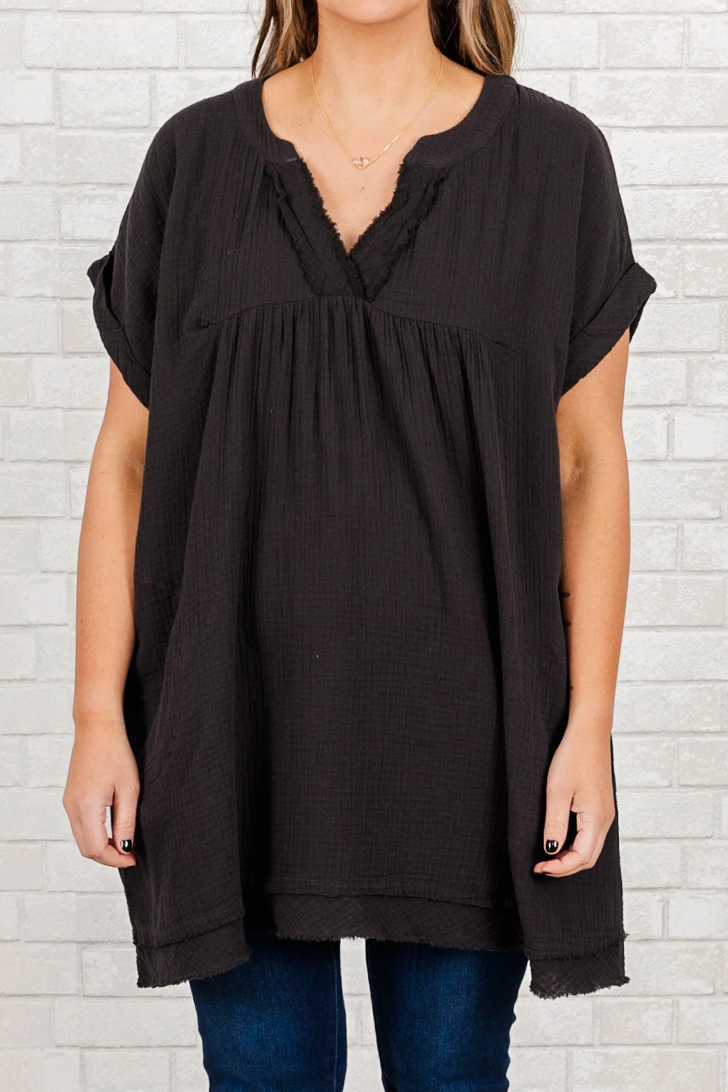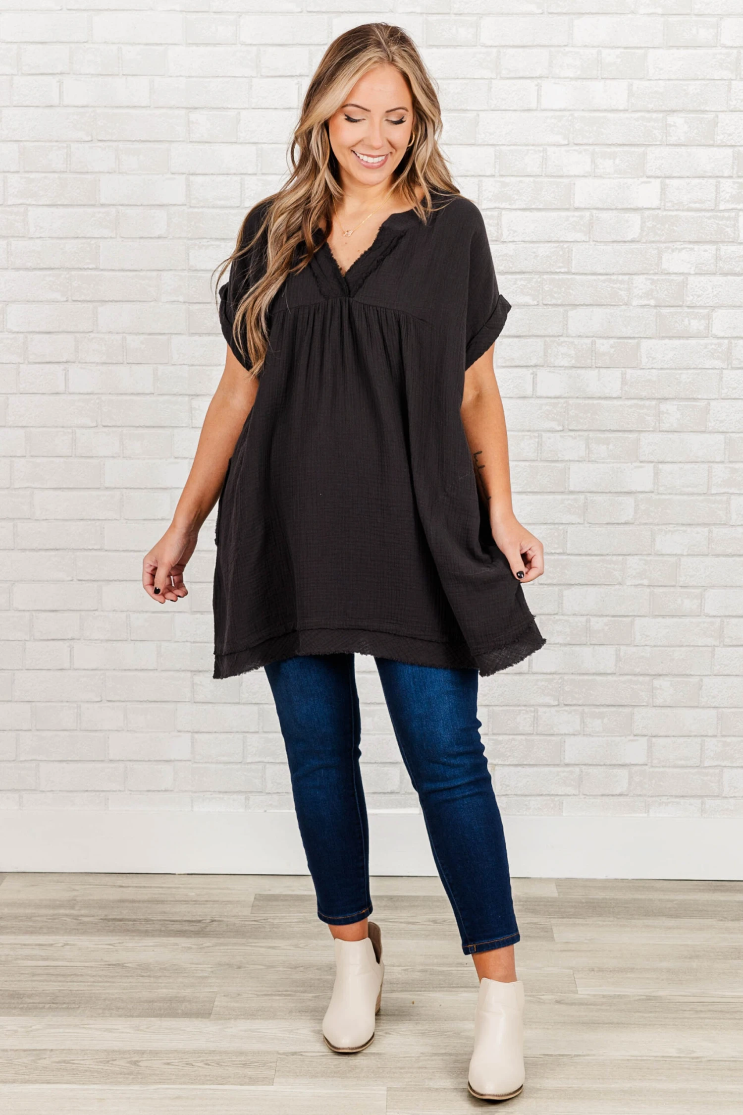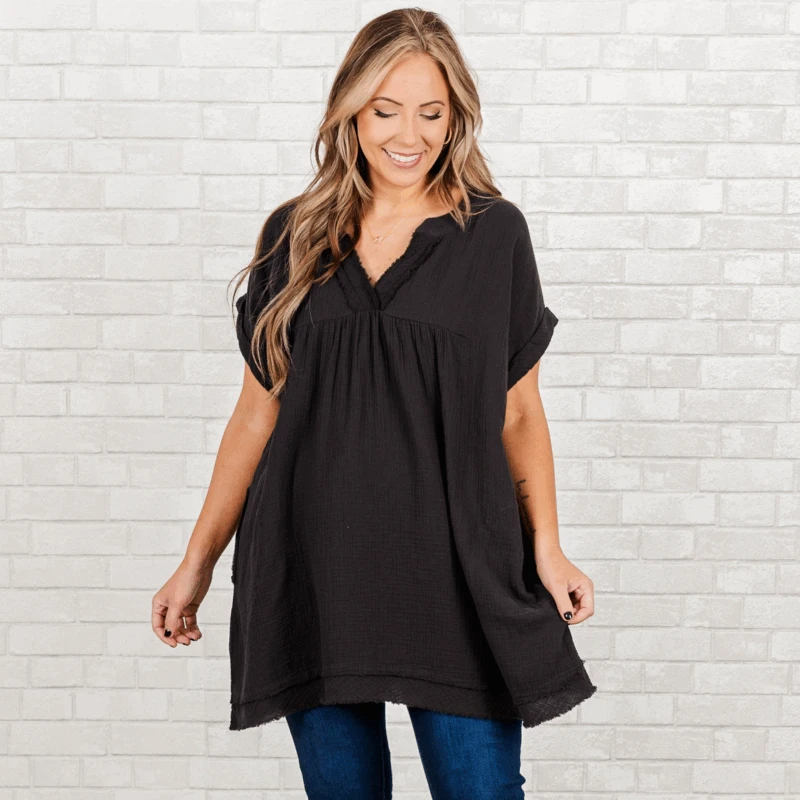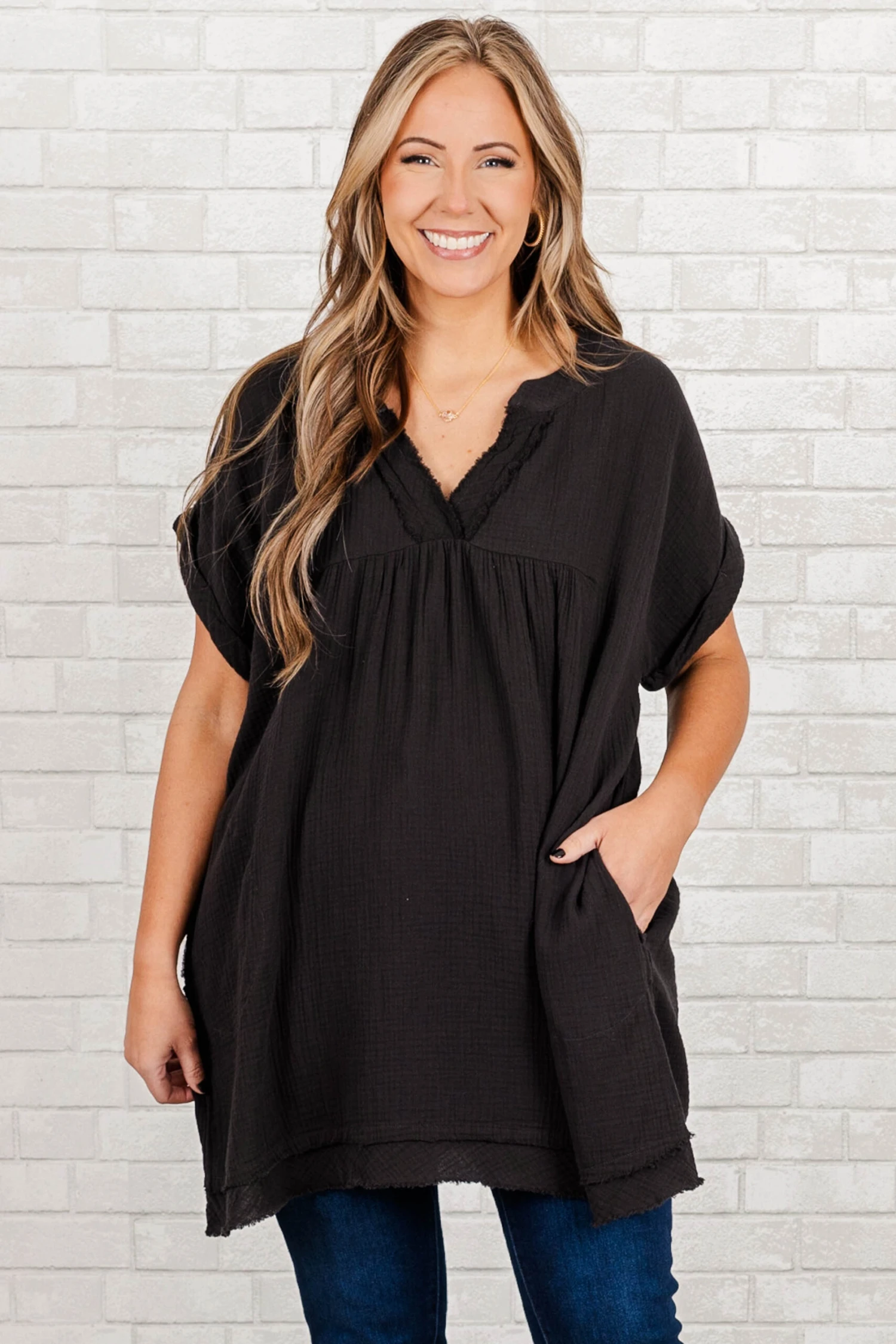 Your love for this top will grow every time you wear this beauty! The neutral black color and frayed detailing add chic accents to this versatile piece! With functional pockets, it seamlessly combines fashion and function for a stylish and practical look!