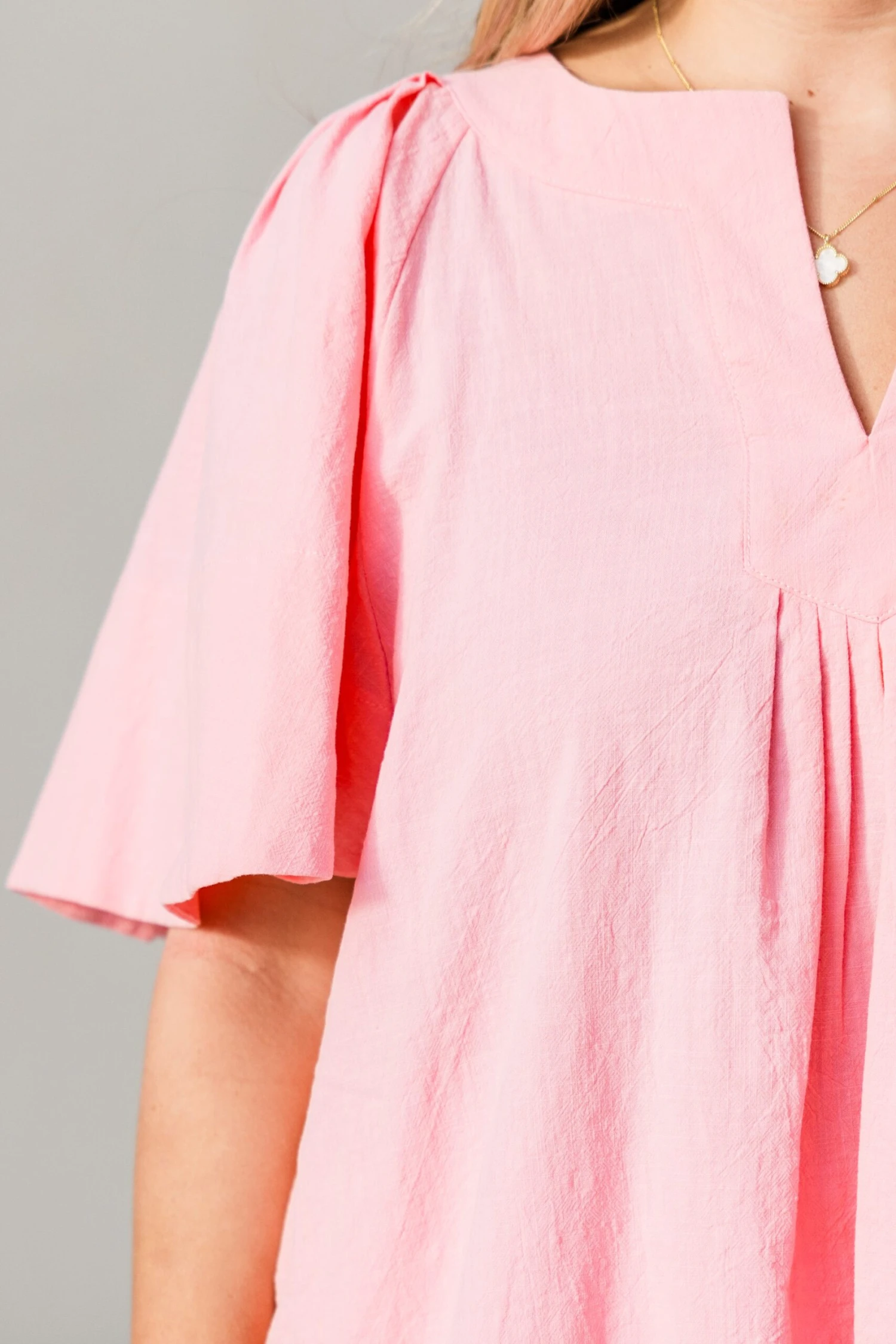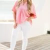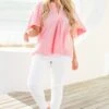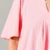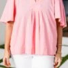 Embrace a touch of elegance with this top in pink! Featuring a split v-neckline, short flutter sleeves, and delicate pleated detailing, this top exudes sophistication and charm! Perfect for any occasion, it’s a must-have addition to your wardrobe!