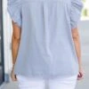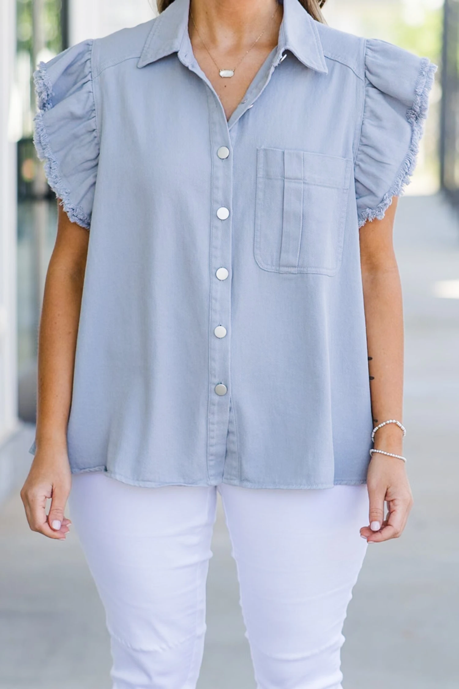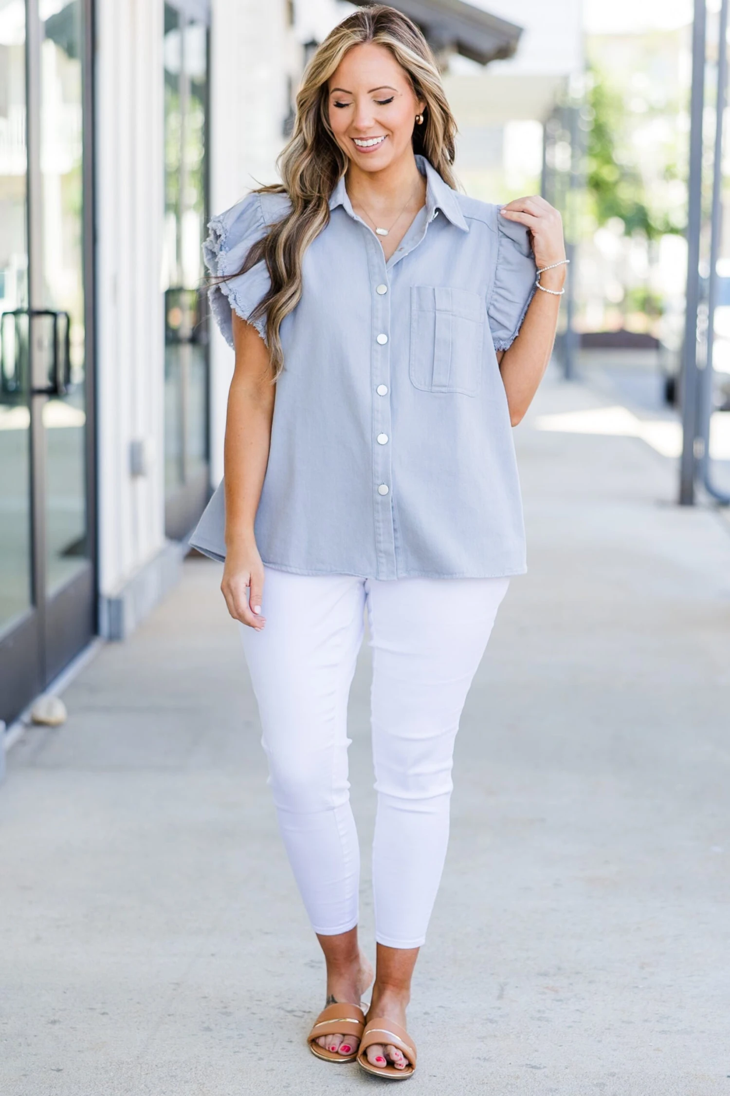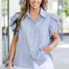 Elevate your style with this top in grey! The frayed flutter sleeves and functional buttons add a touch of femininity and practicality to this on-trend top. Perfect for staying on top of the fashion game while never letting your look down!