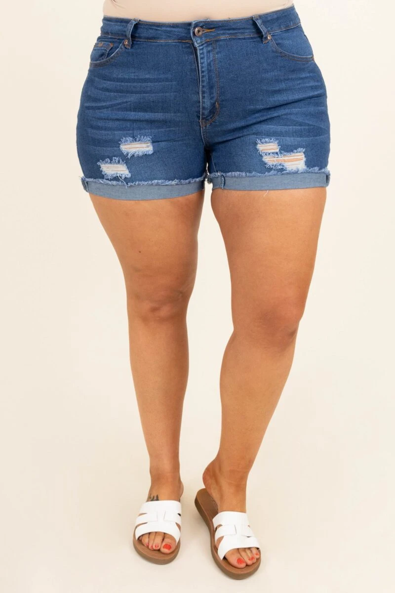 We never will get over how cute these shorts are! The dark blue color is so classic and can match anything! The cuffed hem is so cute and gives these something extra while the distressed look is so trendy! Style them with any top you want for a perfect outfit every time!Â