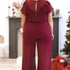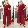 This is no ordinary jumpsuit! The red color is always in style and the sheer stye is so trendy! We love the ruffles on the sleeves and the cinched waist that will flatter any body type! Style this jumpsuit with wedges for the perfect look at your next event!Â
