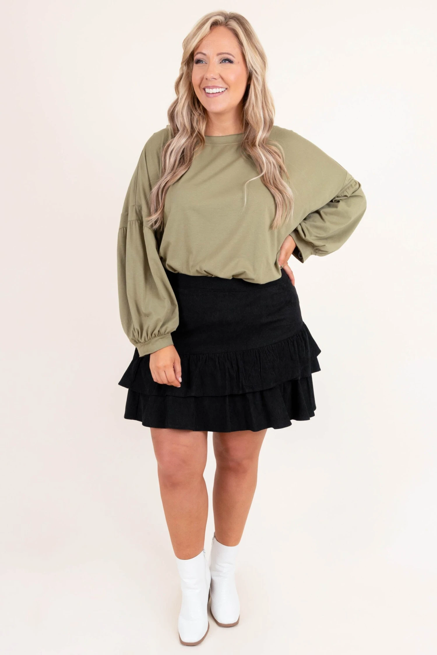 Looking stylish definitely won’t be a problem with this top! The high neckline and bubble sleeves are just in time for the season! The gorgeous olive color and figure flattering fit are exactly what you need to look and feel great! Simply style this top with a cute skirt or skinnies for a fun, trendy look!Â