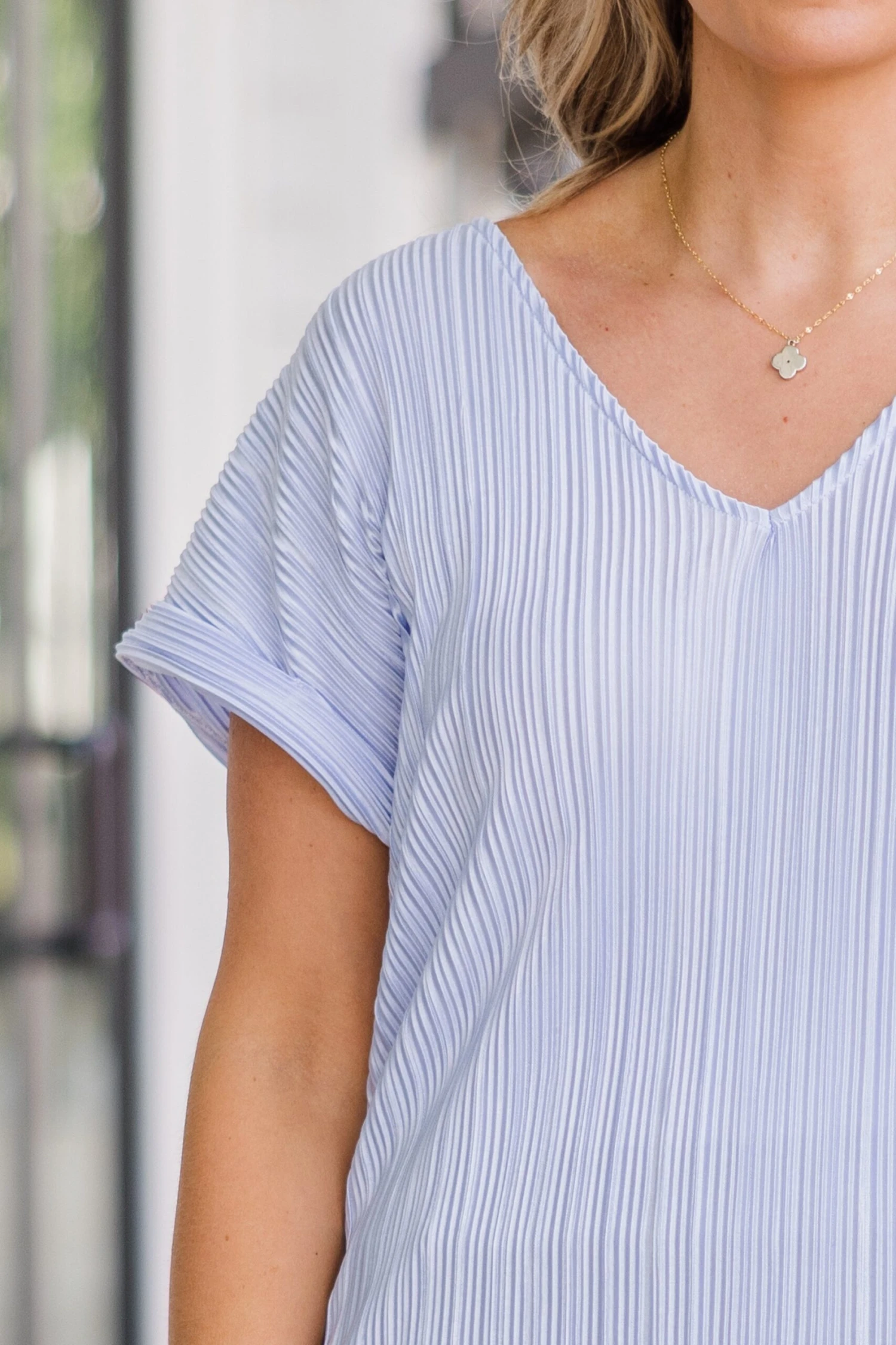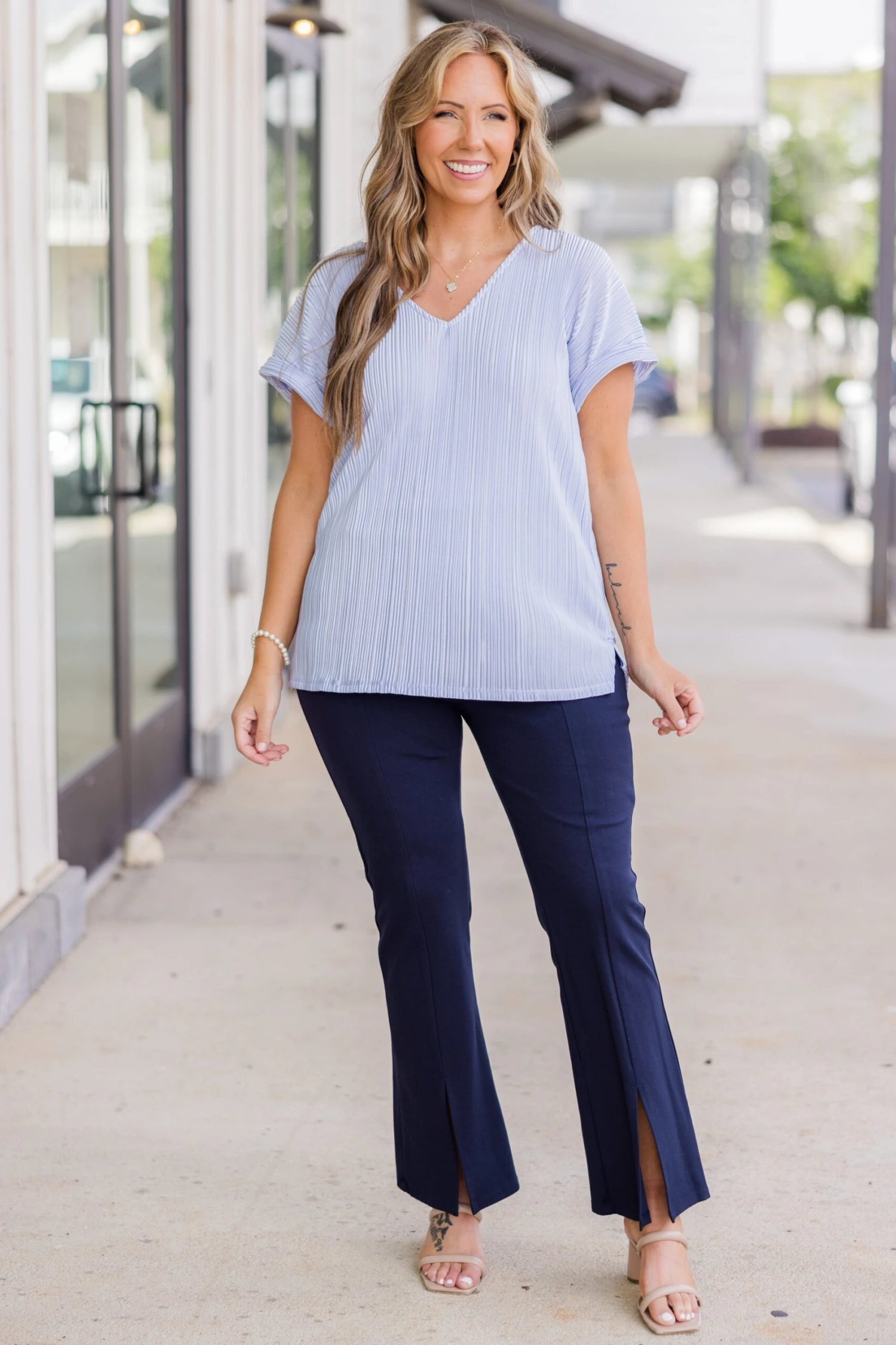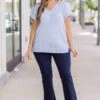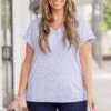 Flaunt your style with the Not Right Now Babe top in light blue! The silky ribbed fabric adds a touch of elegance while the v-neckline and cuffed sleeves elevate your look. Feel confident and chic in this must-have top!
