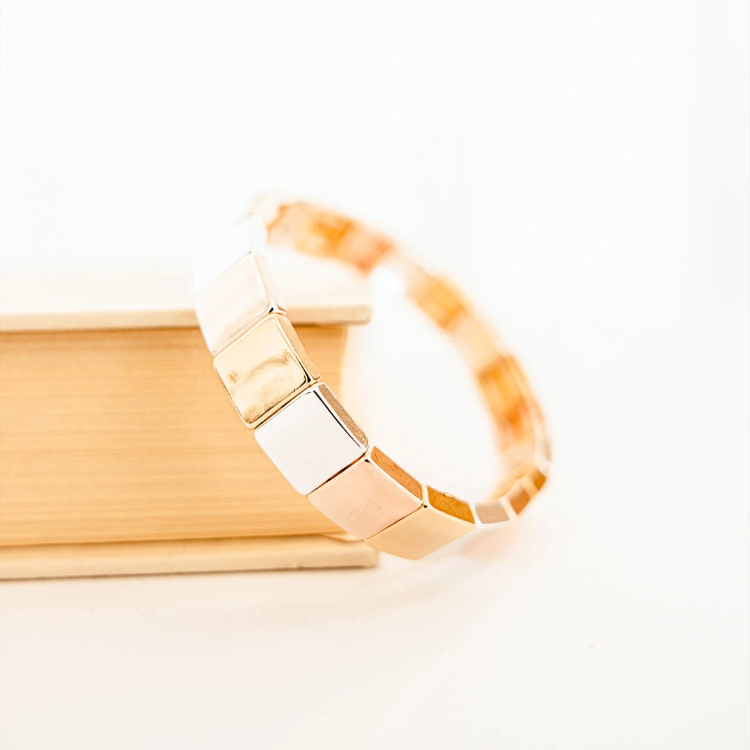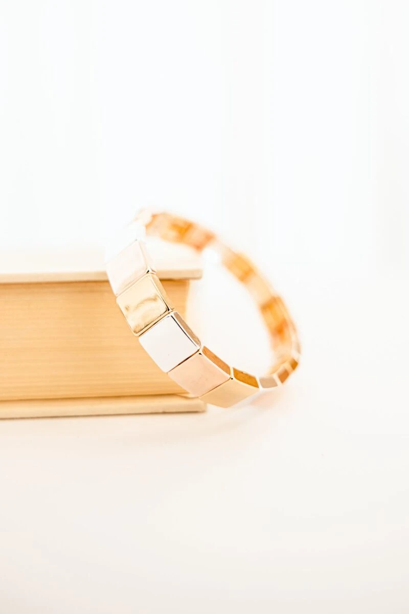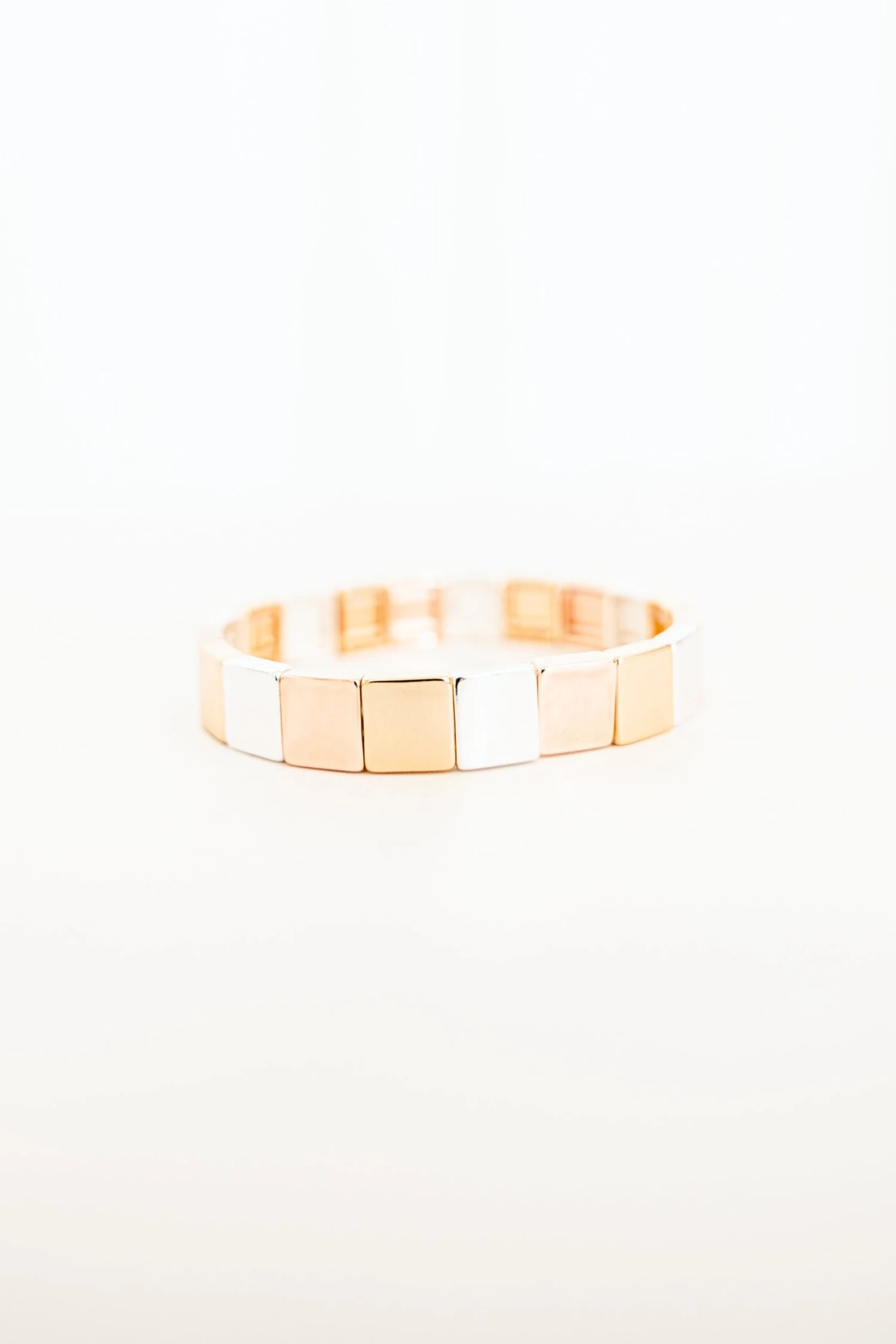 We adore this gorgeous bracelet! It is crafted from a tritone color material, making it a classy piece for any type of outfit! It features a durable stretch material, making it easy to slip on and secure! Ideal for any occasion, you won’t be disappointed with this statement piece!