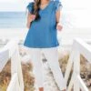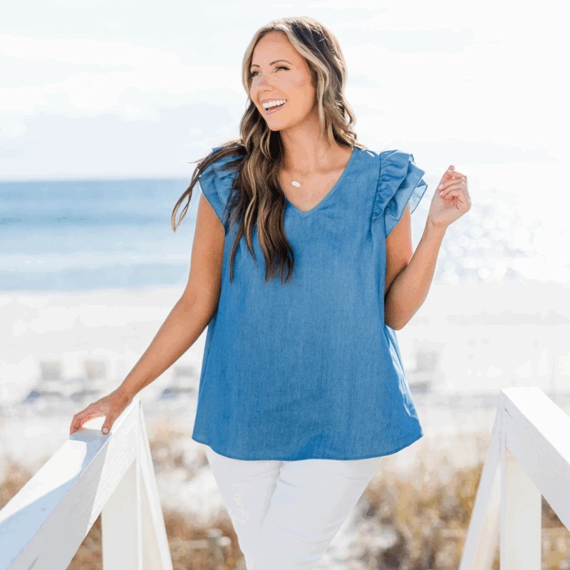 This light blue top is truly unmatched! With its versatile white denim pairing and the ability to effortlessly match with sandals or wedges, nothing comes close to its style and versatility! Perfect for any occasion, this top is a must-have in any wardrobe!