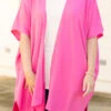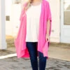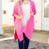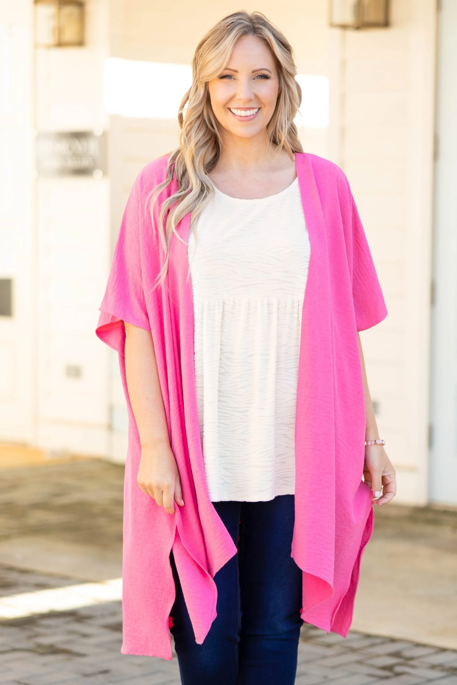 Walk with confidence in this gorgeous kimono! The bold hot pink color is so eye catching and easy to pair with a sassy patterned dress or a solid top and skinnies for a casual chic look!