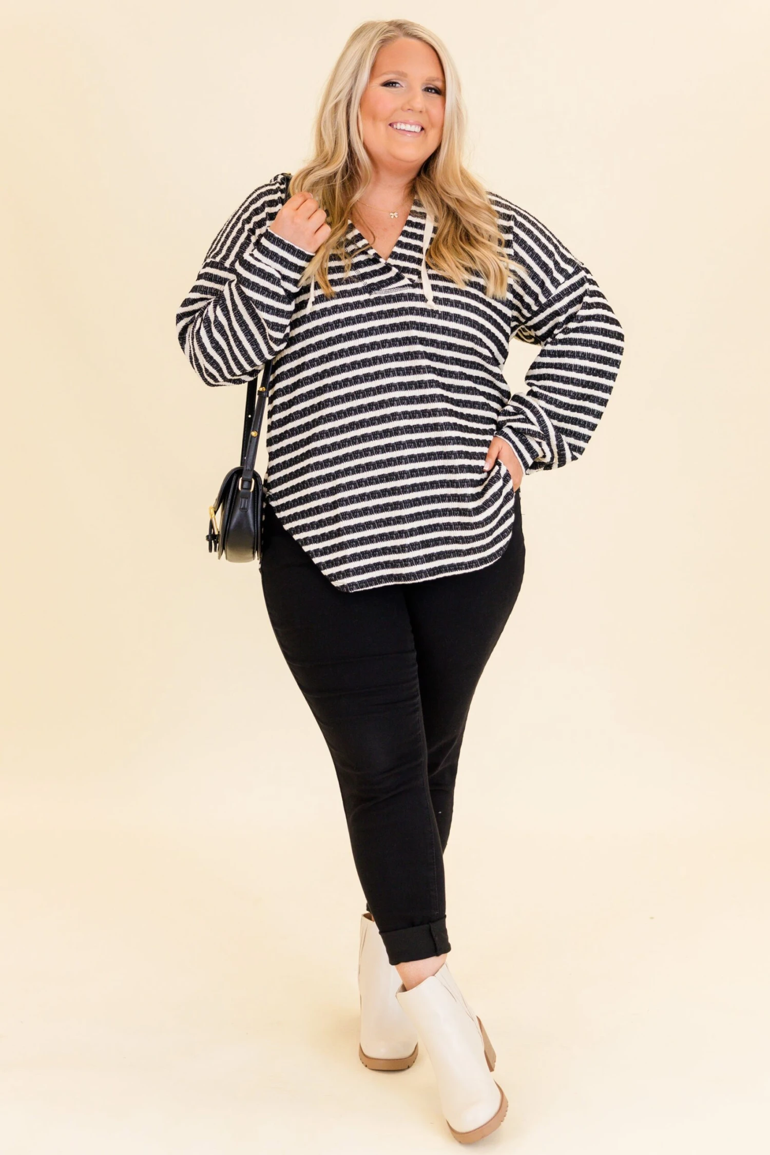Stay warm and stylish with this hoodie! This hoodie features a black and white textured design with a comfortable v-neck! Perfect for cooler days, this hoodie will keep you warm and looking great!