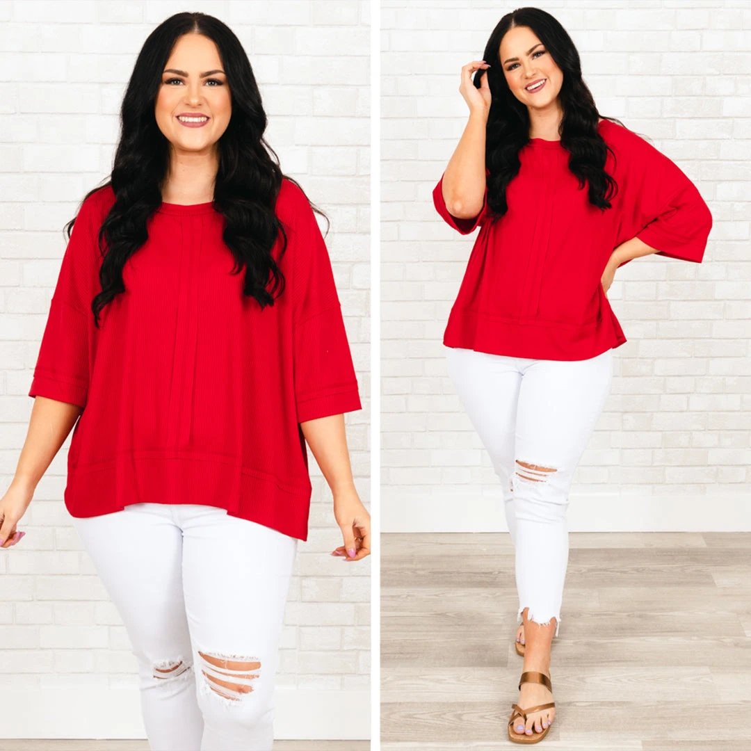 Of course you need this beauty in your wardrobe! This top has a lovely ruby color with a stretchy, figure flattering fit that is great for paring with all of your faves throughout the season! Style this top with some white denim and sandals for a casual chic look!