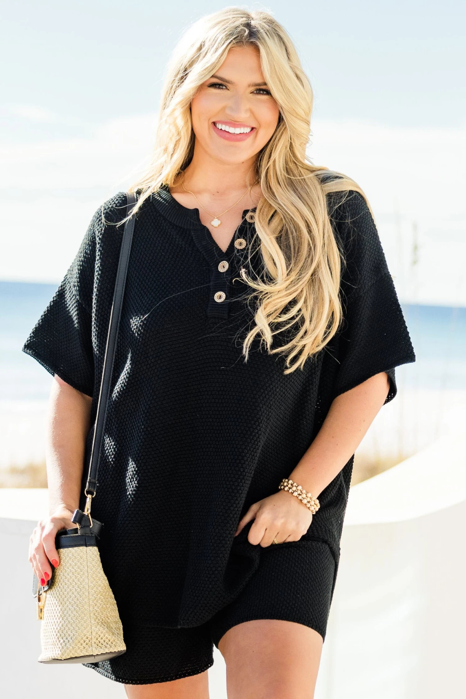 Indulge in paradise with this lightweight sweater set in black! The perfect combination of comfort and style, it pairs effortlessly with your favorite sneakers! Casual yet cute, the elastic waistband shorts add a trendy touch! Made of a soft sweater knit material, we’re beyond in love with this set!