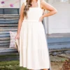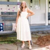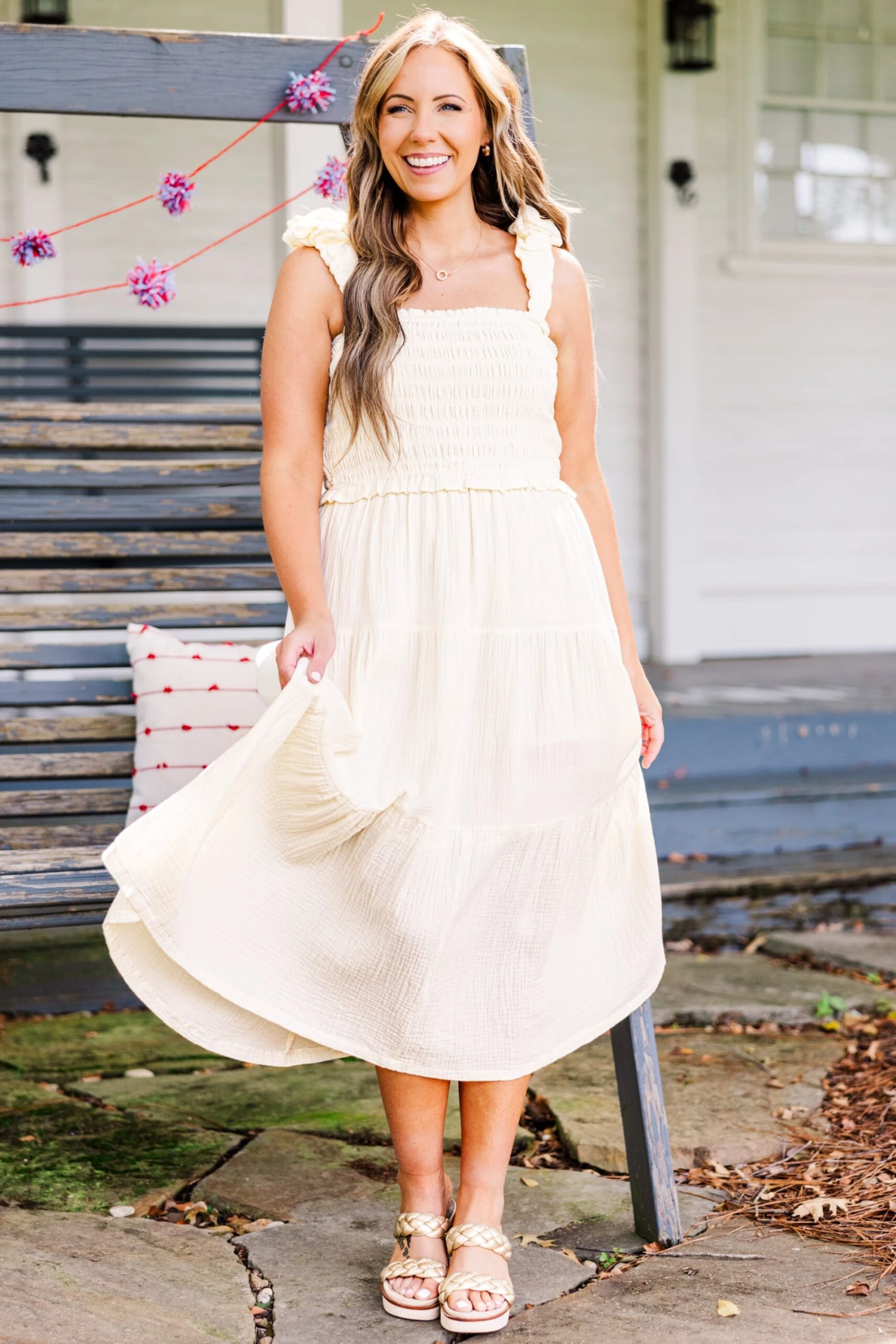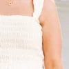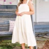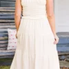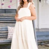 This dress in cream is a must-have for your summer wardrobe! With its elastic straps and smocked bodice, it offers a comfortable and flattering fit! The tiered skirt adds a touch of whimsy and movement, perfect for any sun-filled adventure! Don’t miss out on this versatile and stylish dress!