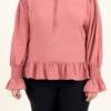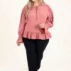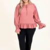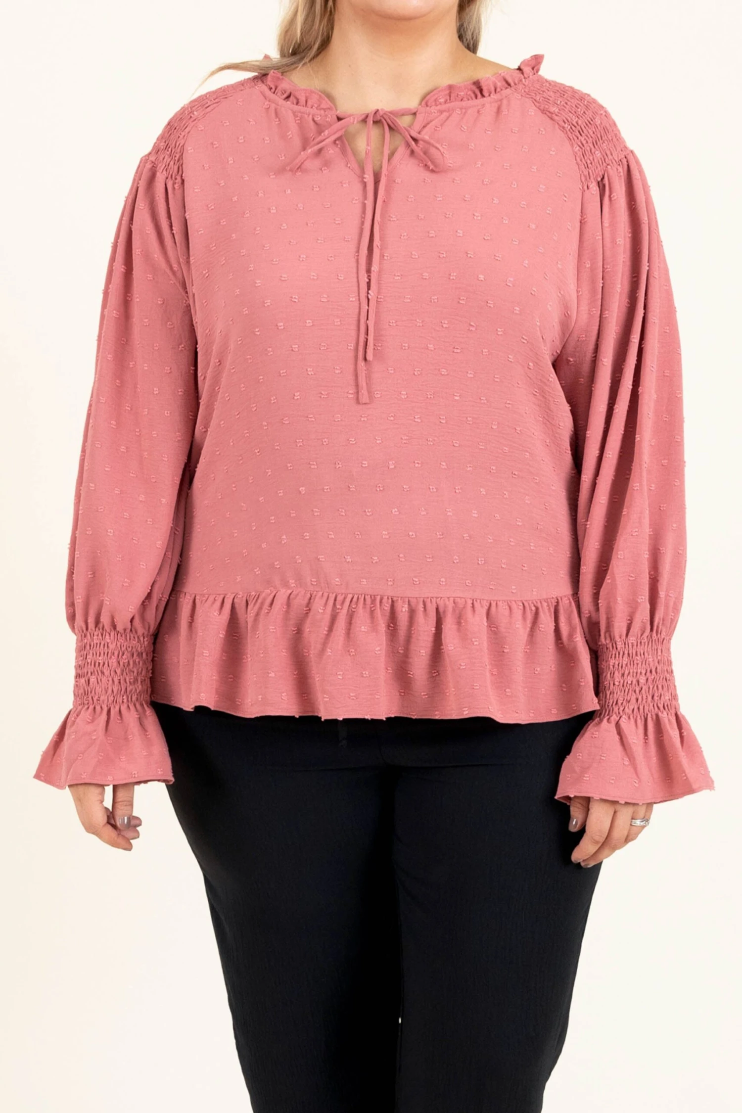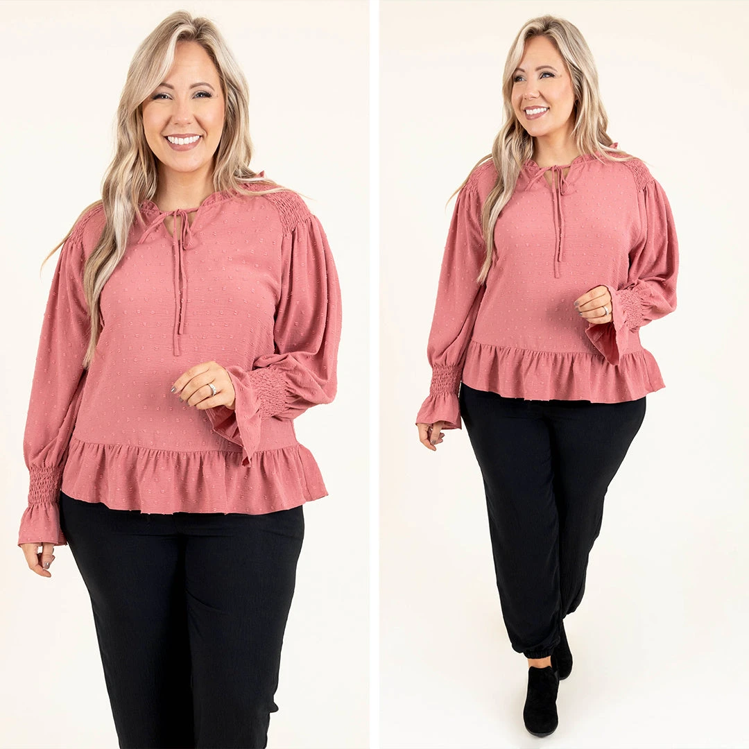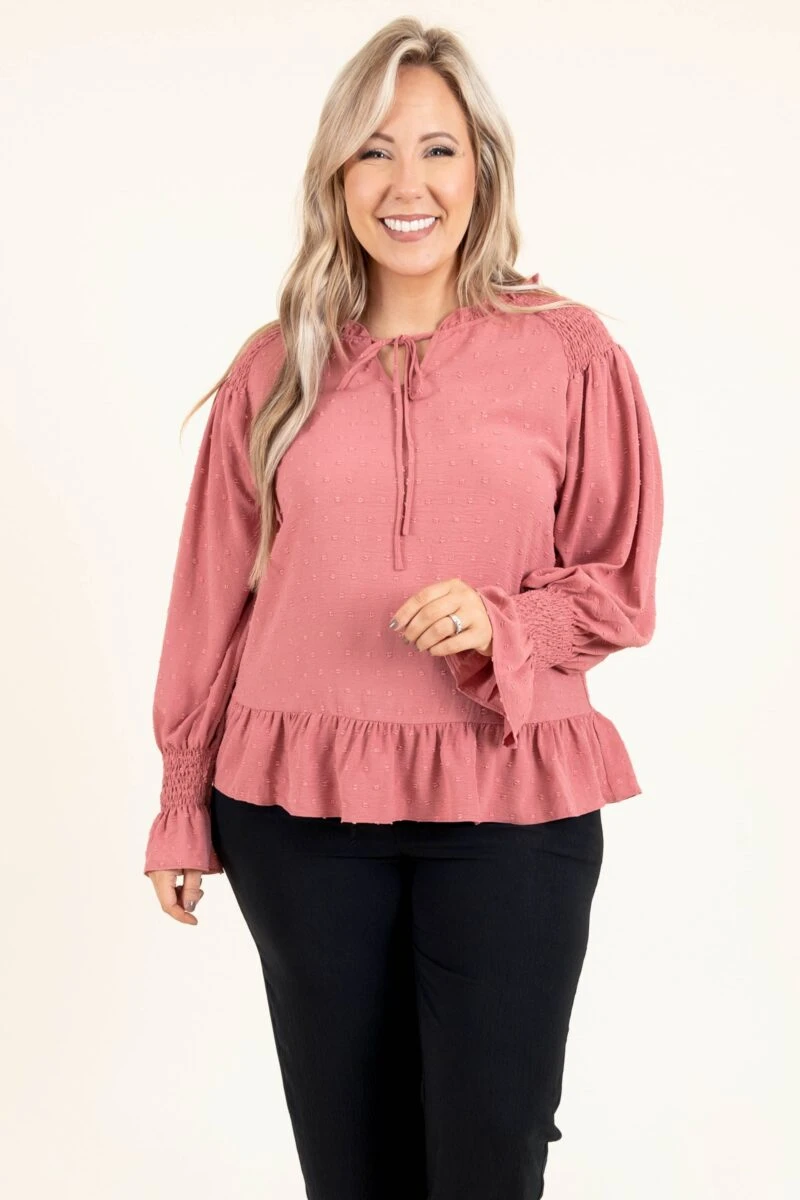 It’s okay to add this beauty to your wardrobe for the season! This top has a beautiful mauve color and a trendy, polka dot pattern that is SUPER sweet! The keyhole tie and ruffles along the hemline and bottom of the sleeves are simply chic! Style this top with some patterned pants or skinnies for a classy, trendy look!