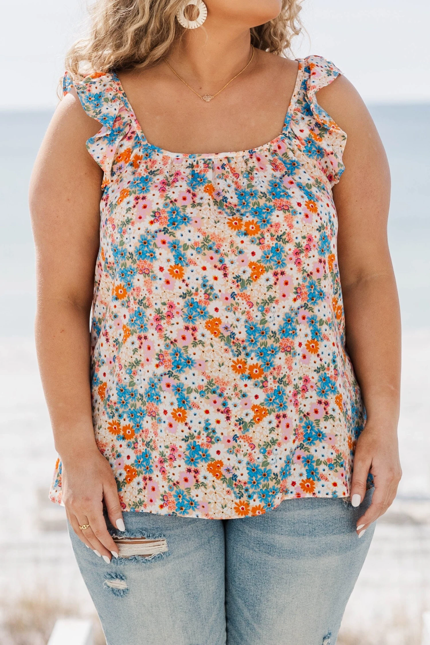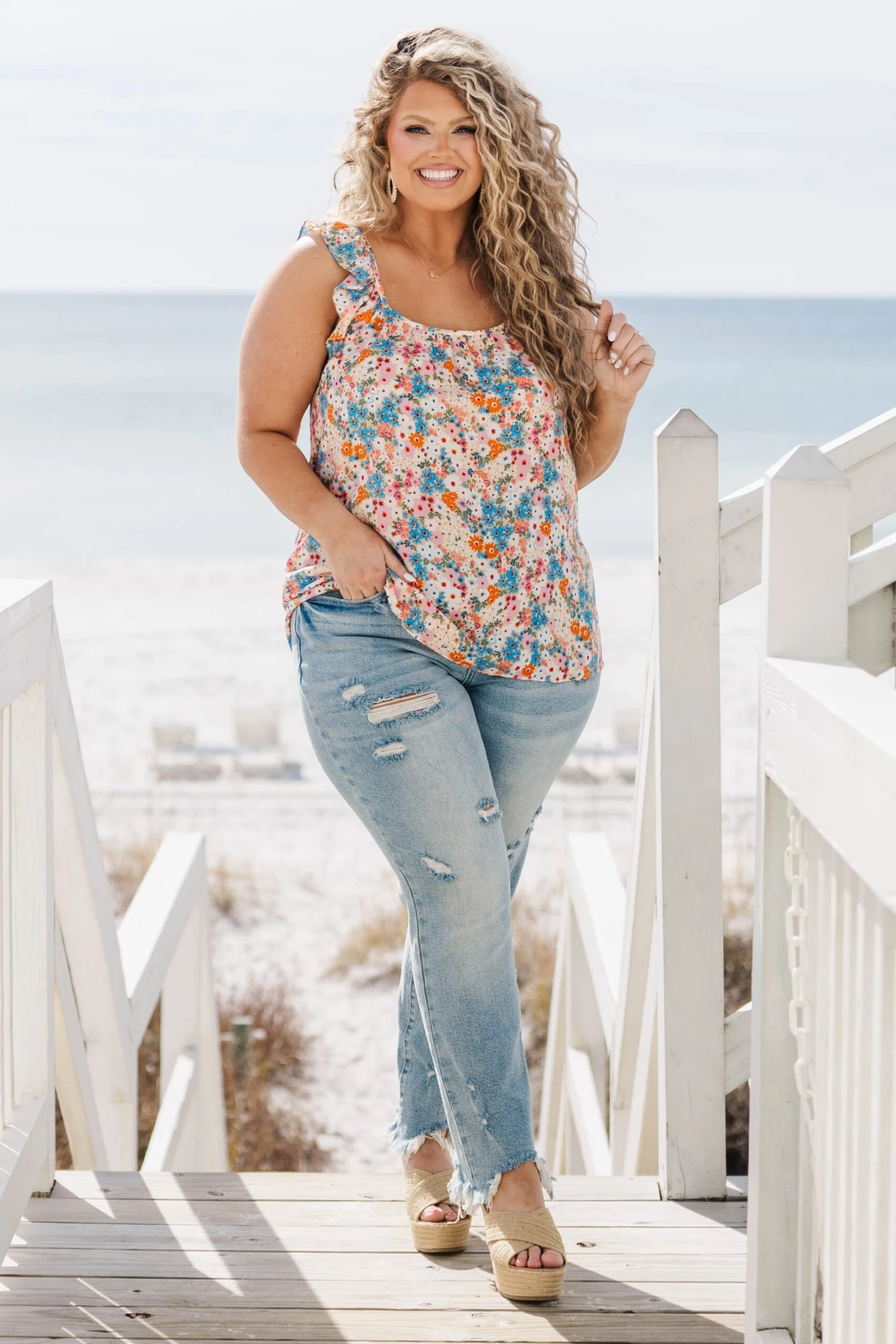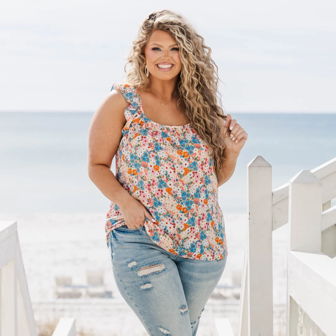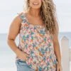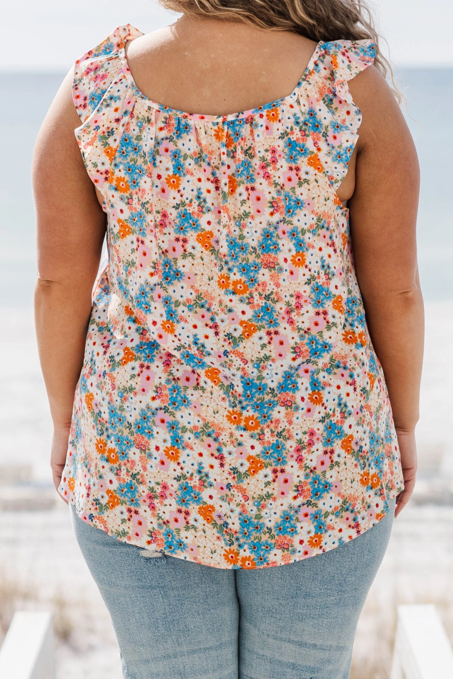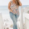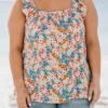 Elevate your style with this adorable tank in a FAB georgia peach color! Featuring flutter sleeves and a beautiful floral pattern, this tank is perfect for any casual occasion! Pair it with distressed denim and wedges for a sassy chic look!