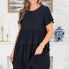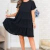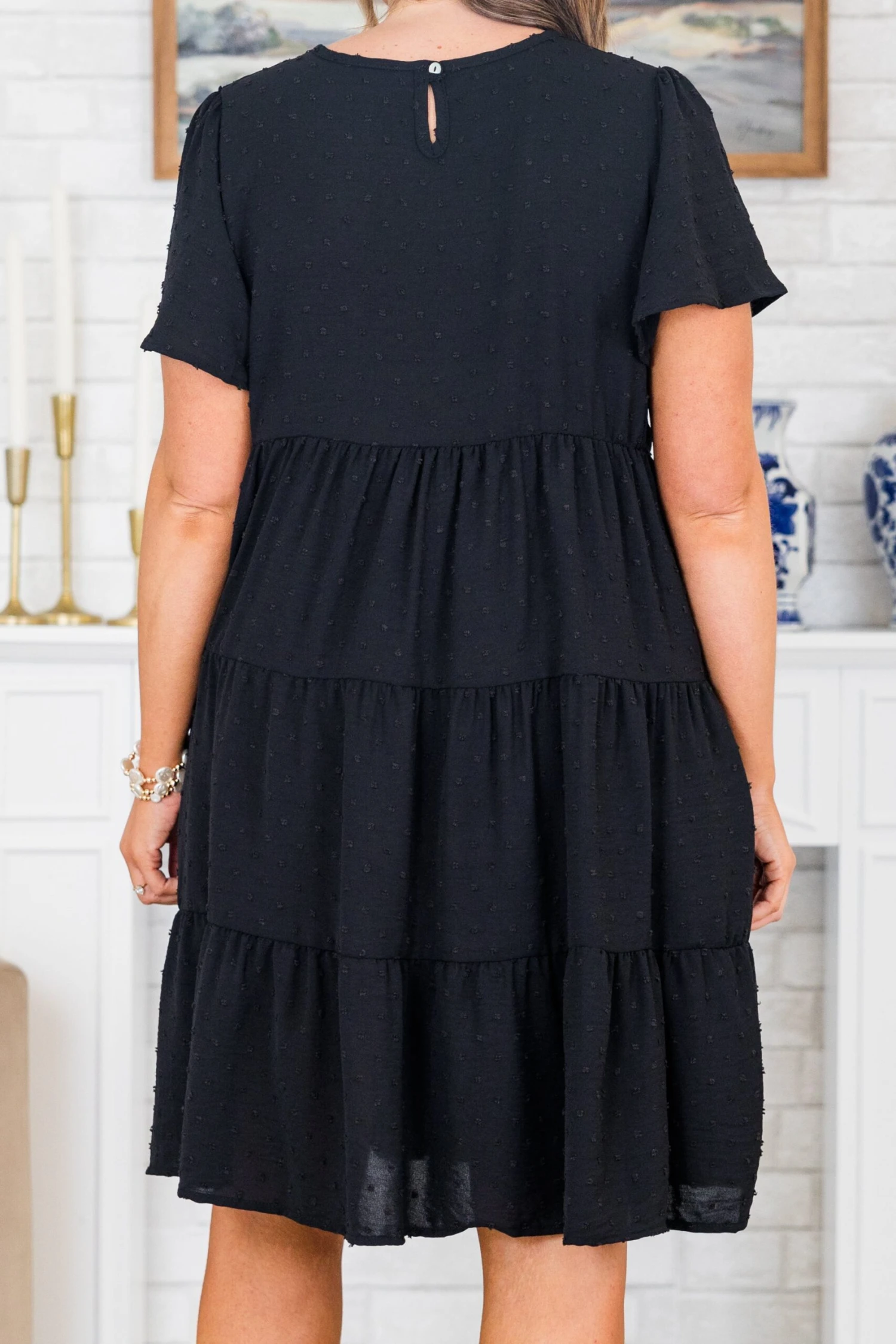 Expertly crafted, this dress is a must-have for any wardrobe! The swiss dot pattern and classic black color make it a standout piece! Its babydoll design and figure-flattering fit offer both comfort and style! Add this dress to your collection for a versatile and chic look!
