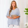 Run to the checkout with this gorgeous top! It has a lovely ash blue color that is perfect for the season and a flattering fit that is a must-have! The stretchy, comfy material pairs well with skinnies or shorts for a casual chic look!
