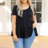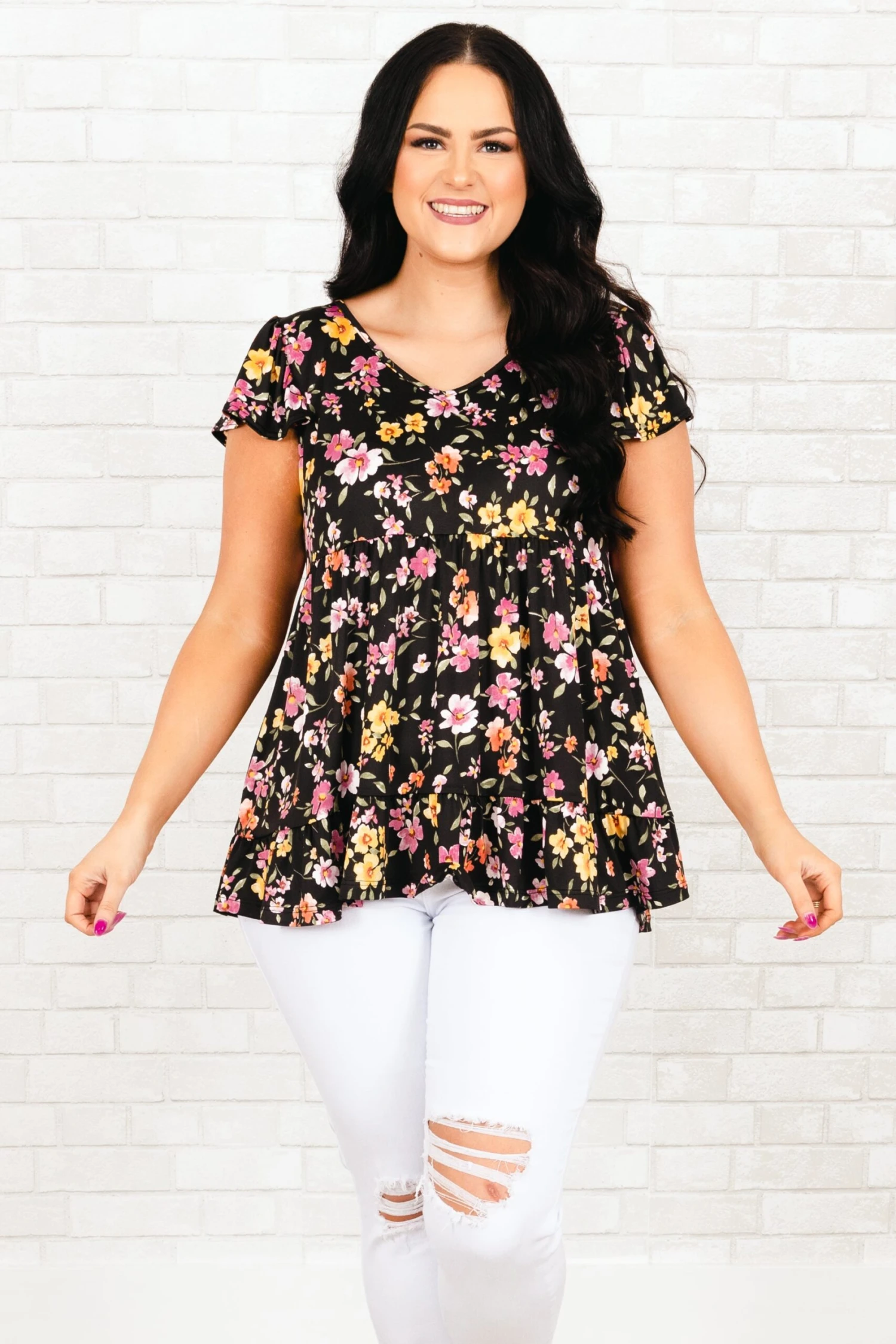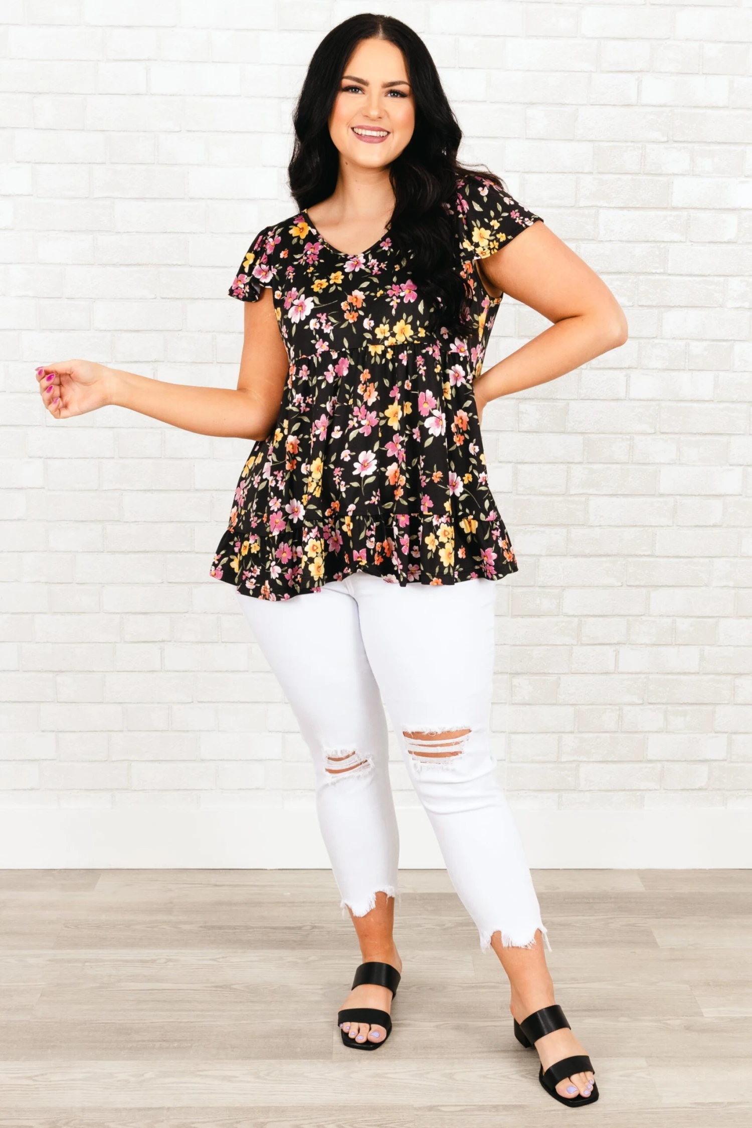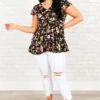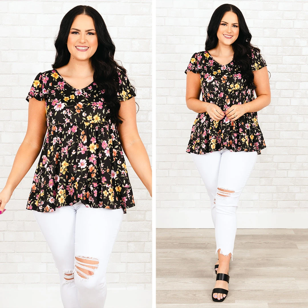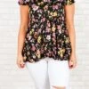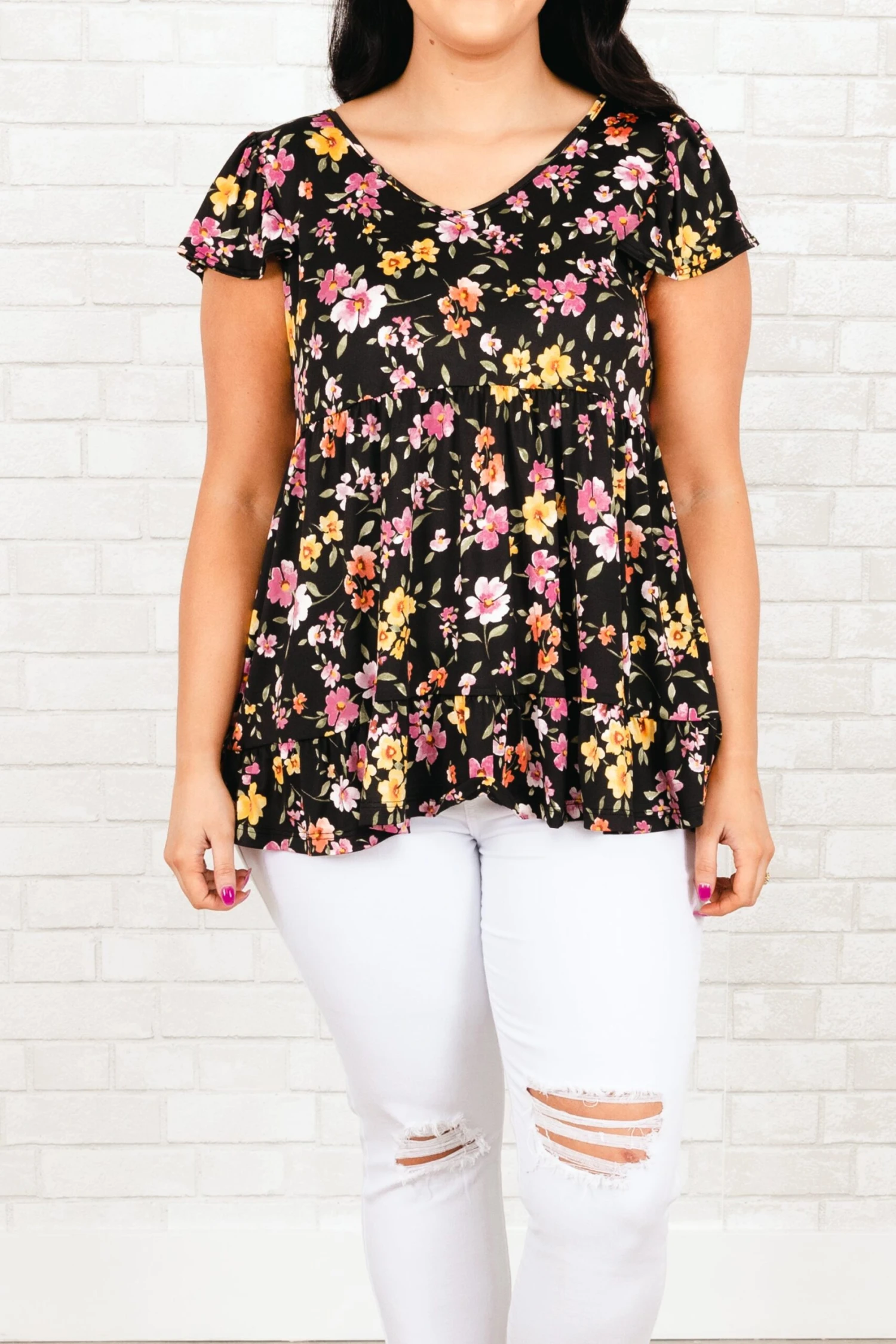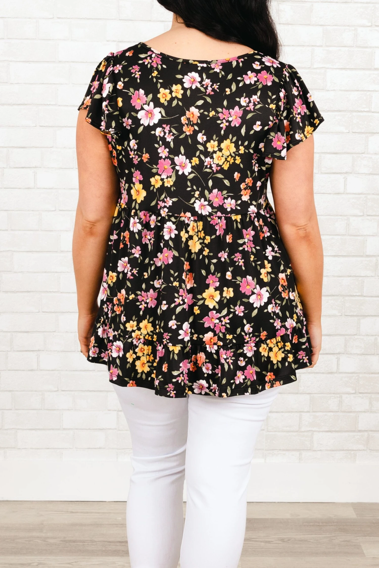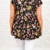 This striking black top features a beautiful floral pattern and a flowy design, complete with stylish flutter sleeves! The light material and comfortable fit will keep you looking and feeling great all day!Â