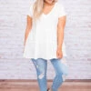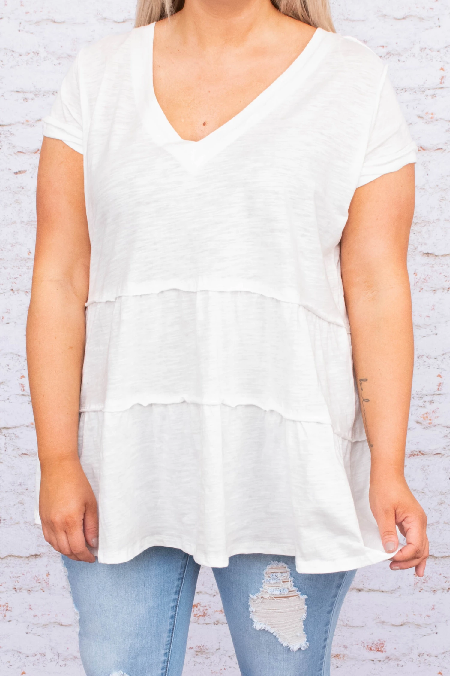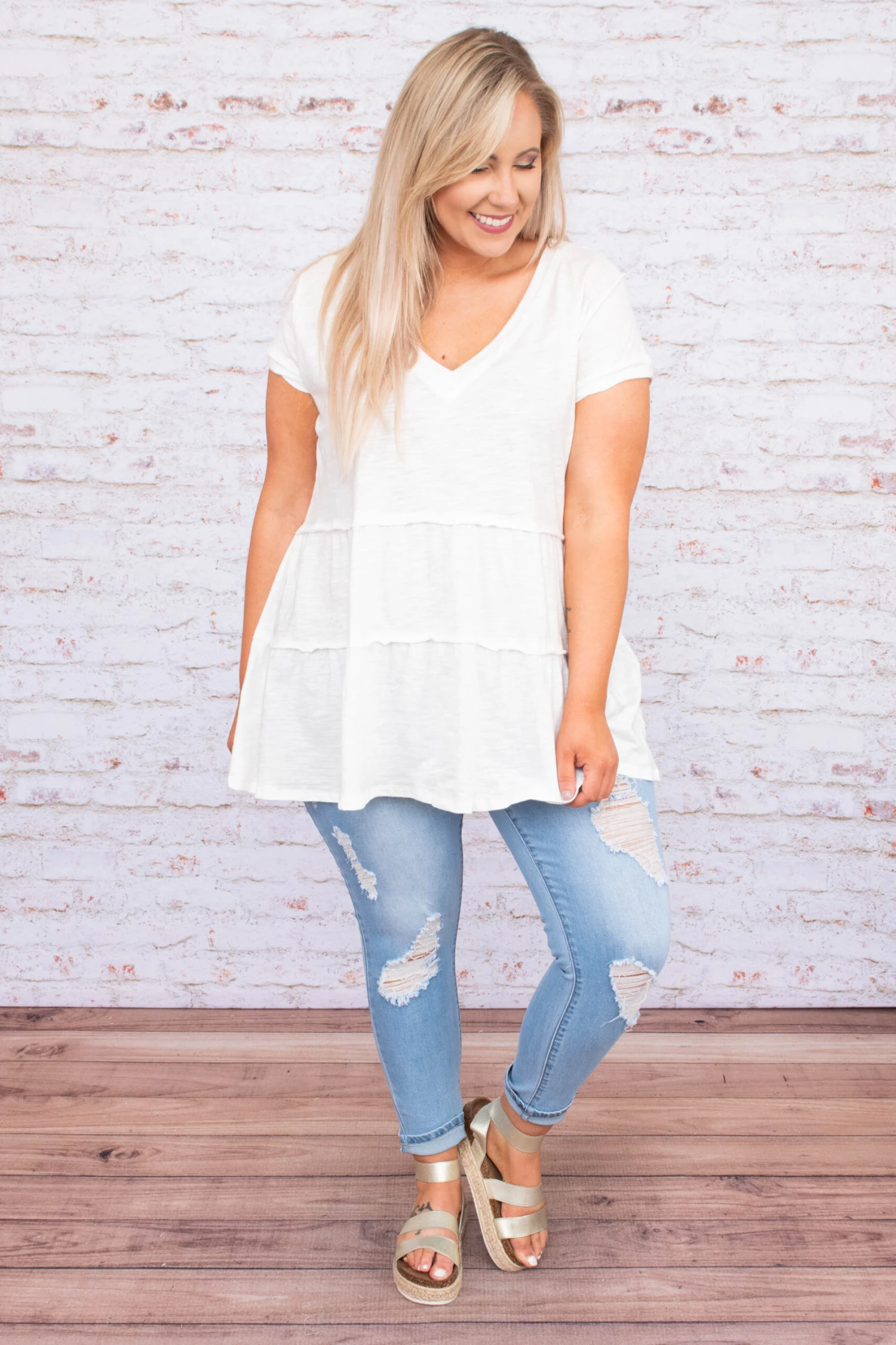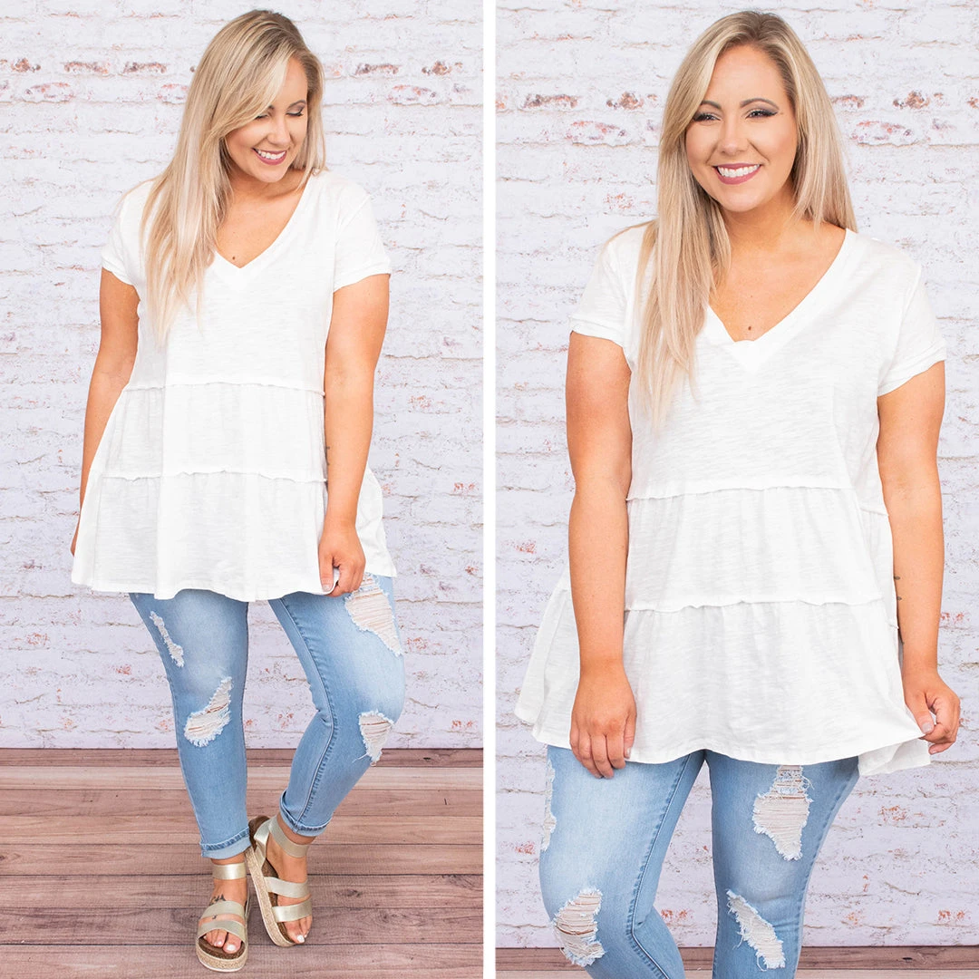 Wear this tunic everyday if you’d like – we won’t judge! This tunic has a solid neutral color you can dress up or down and style with everything in your closet! It’s comfortable for all day wear, has a classic baby doll fit to flatter your figure, and features the cutest v-neck design for the ultimate trend! Simply, pair this tunic with skinnies and wedges for an effortlessly chic look!Â