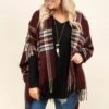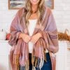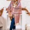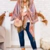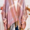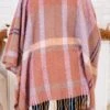 Stay warm in style with this poncho in mauve! The perfect addition to your wardrobe, this mauve poncho features a unique mauve and orange plaid pattern! Keep cozy and stand out from the crowd with this playful and trendy piece!