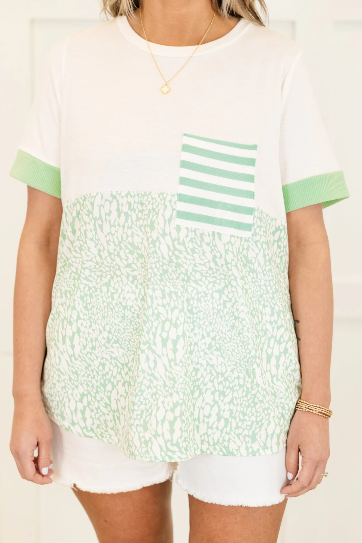 Introducing our One Of Those Times Top in mint! This must-have top features a trendy color block design and a convenient striped front pocket! Elevate your wardrobe with this versatile and stylish piece!