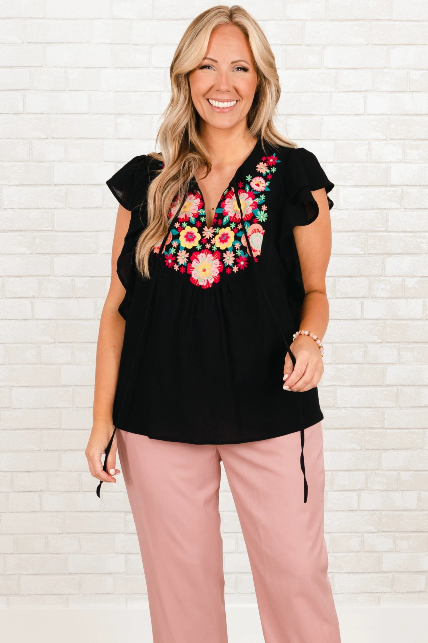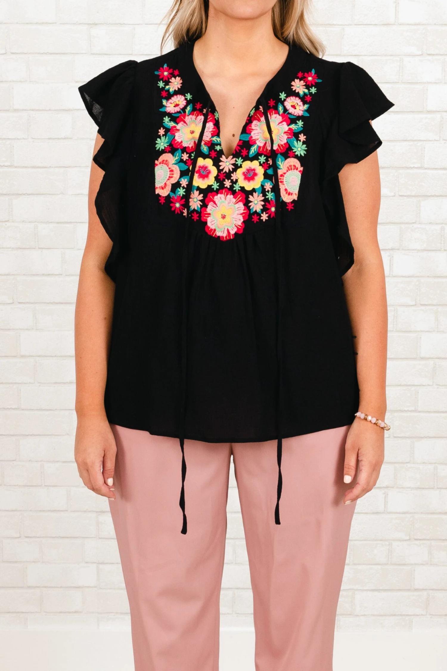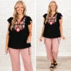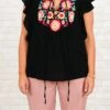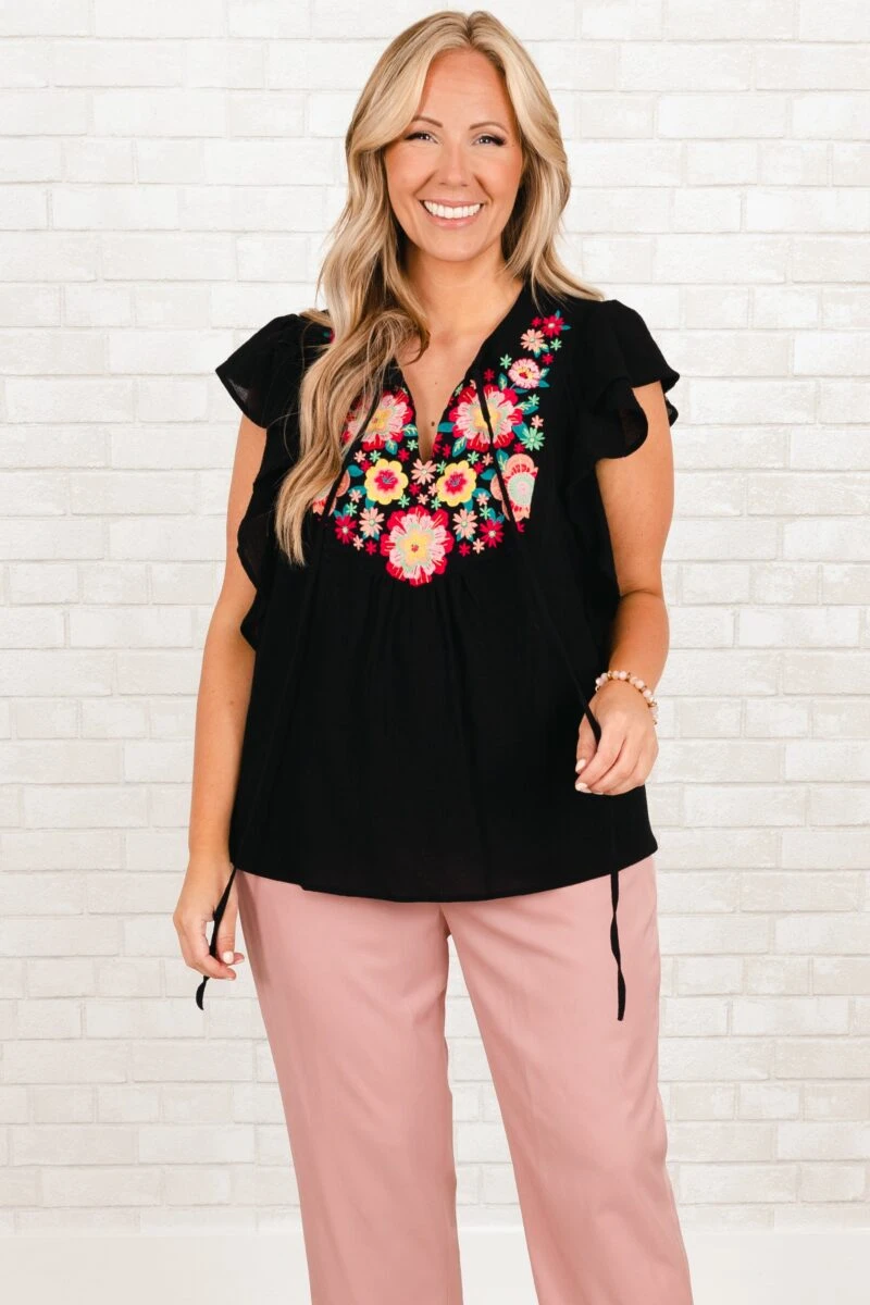 We are in LOVE with this adorable top! This top features an intricate embroidered design in a classic black hue! The feminine flutter sleeves add a touch of elegance to your look and help balance the bold design!