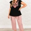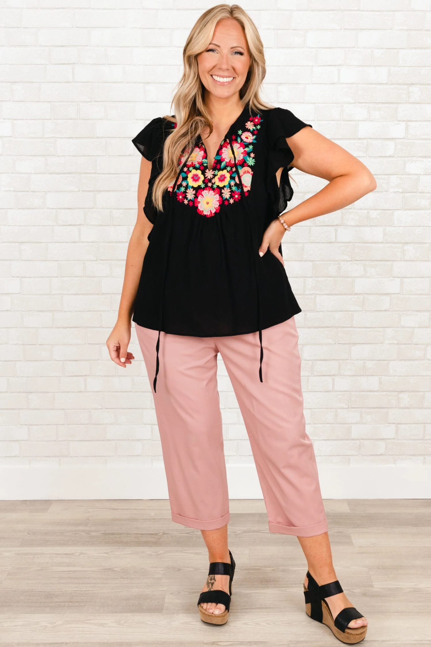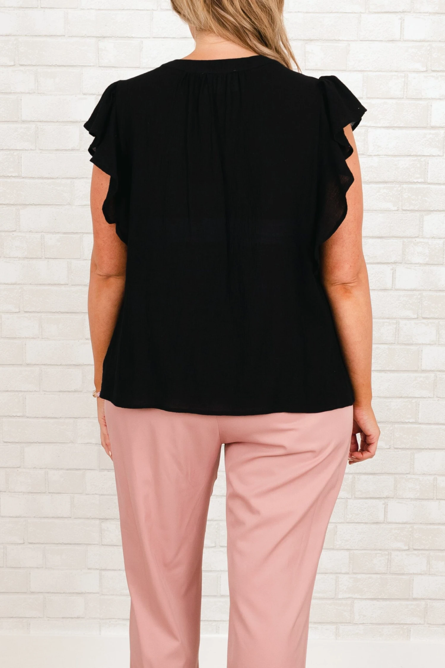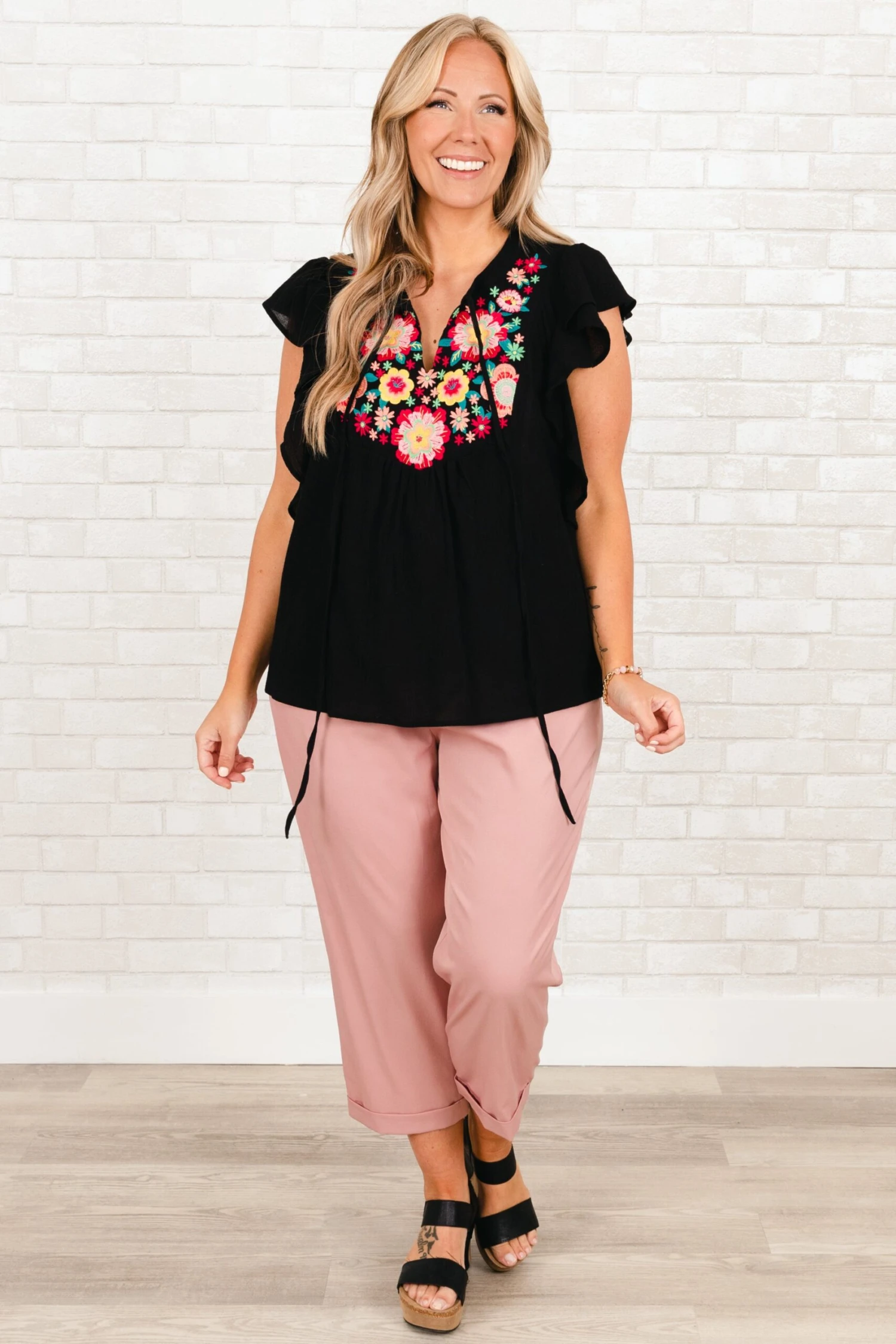 We are in LOVE with this adorable top! This top features an intricate embroidered design in a classic black hue! The feminine flutter sleeves add a touch of elegance to your look and help balance the bold design!