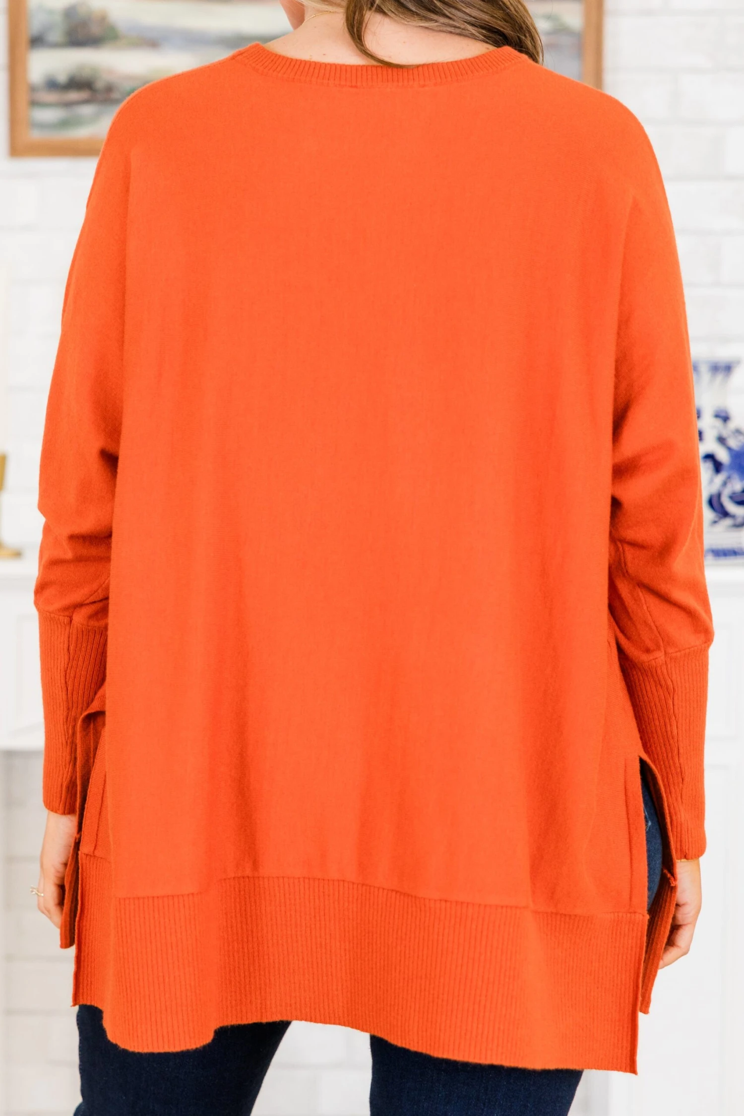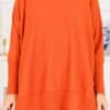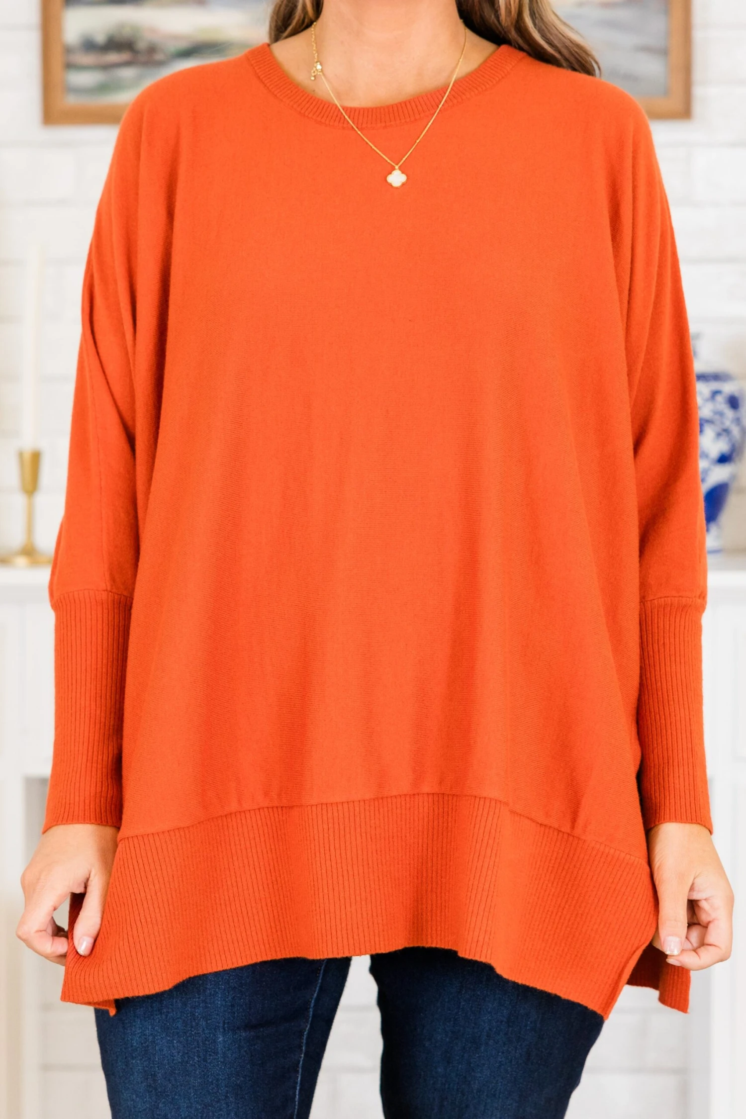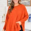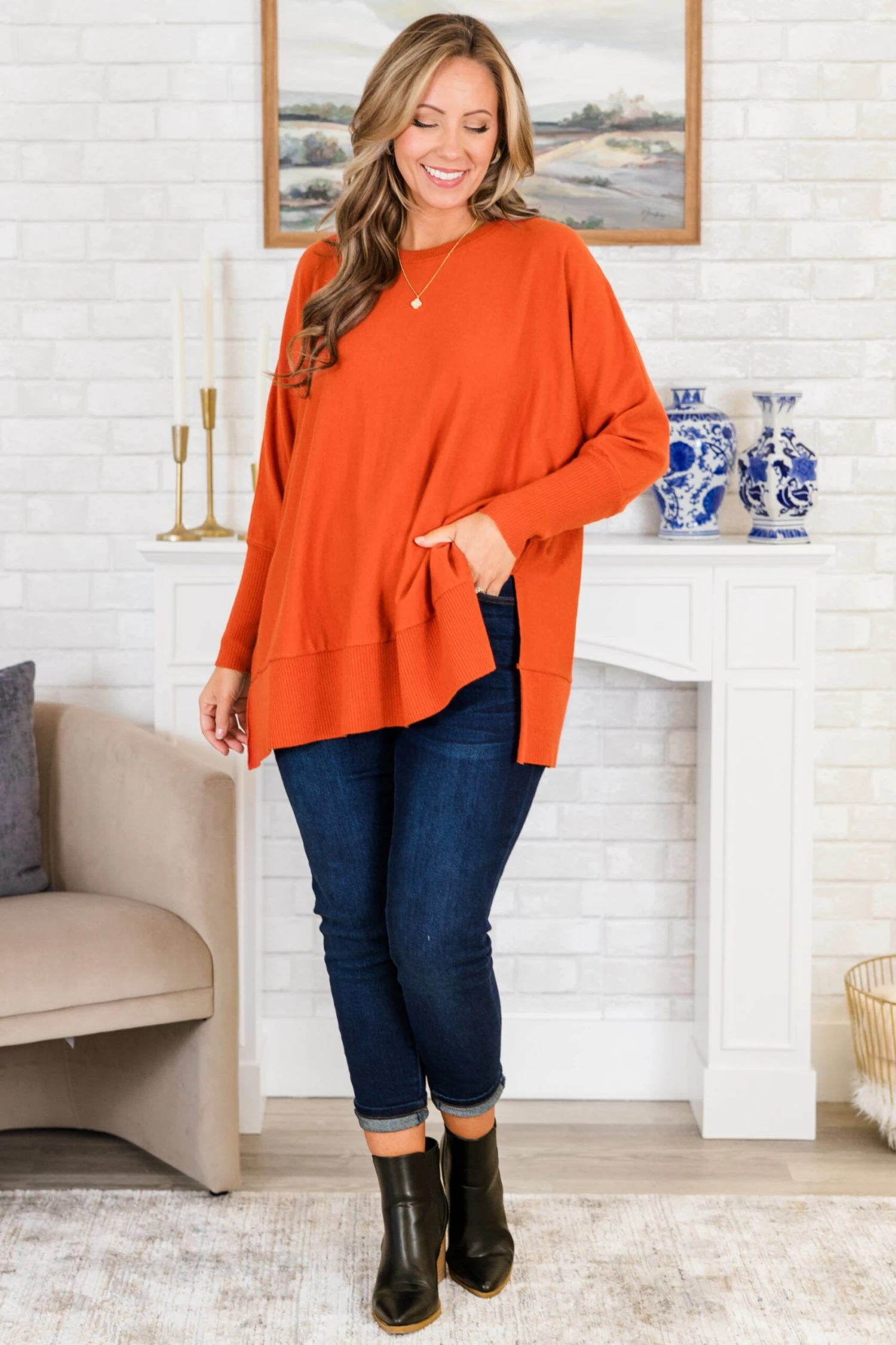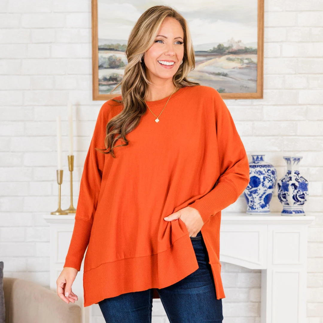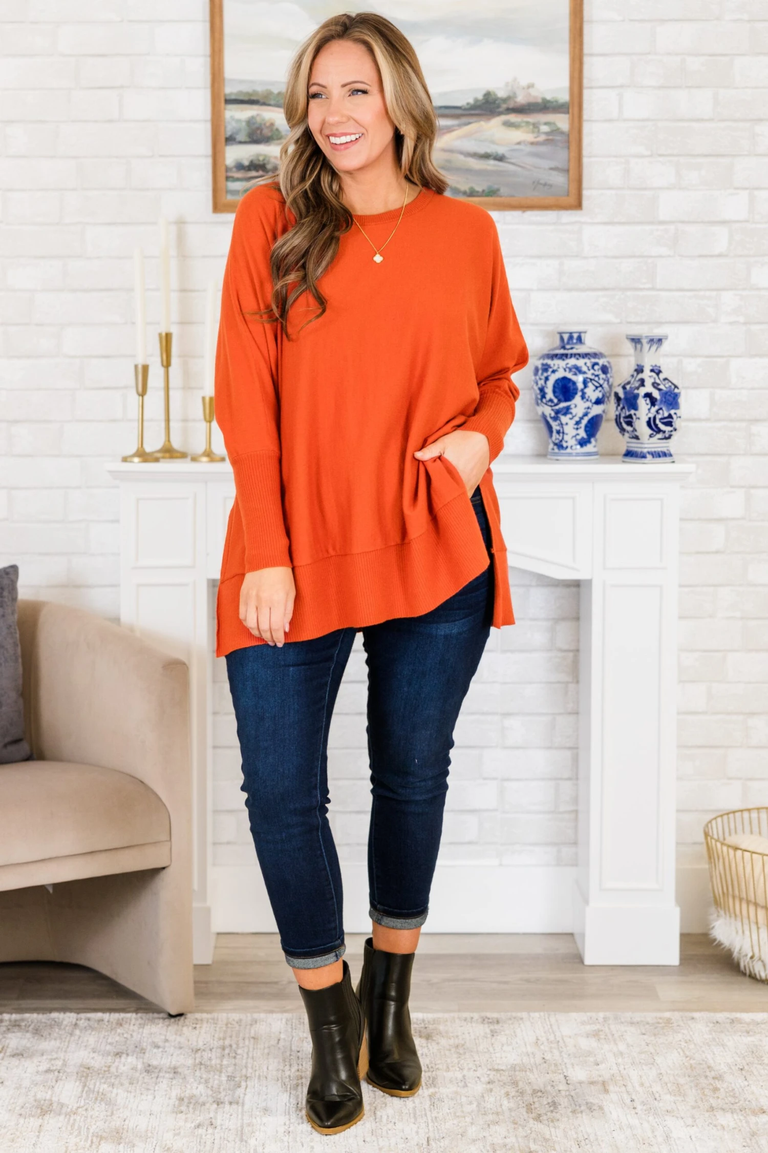 Adorn yourself in this top! With its drop shoulder sleeves, side slits, and rounded neckline, this top is both stylish and comfortable! The ribbed cuffs and hemline add a touch of sophistication to any outfit! Feel effortlessly chic and confident in this brick-colored top!