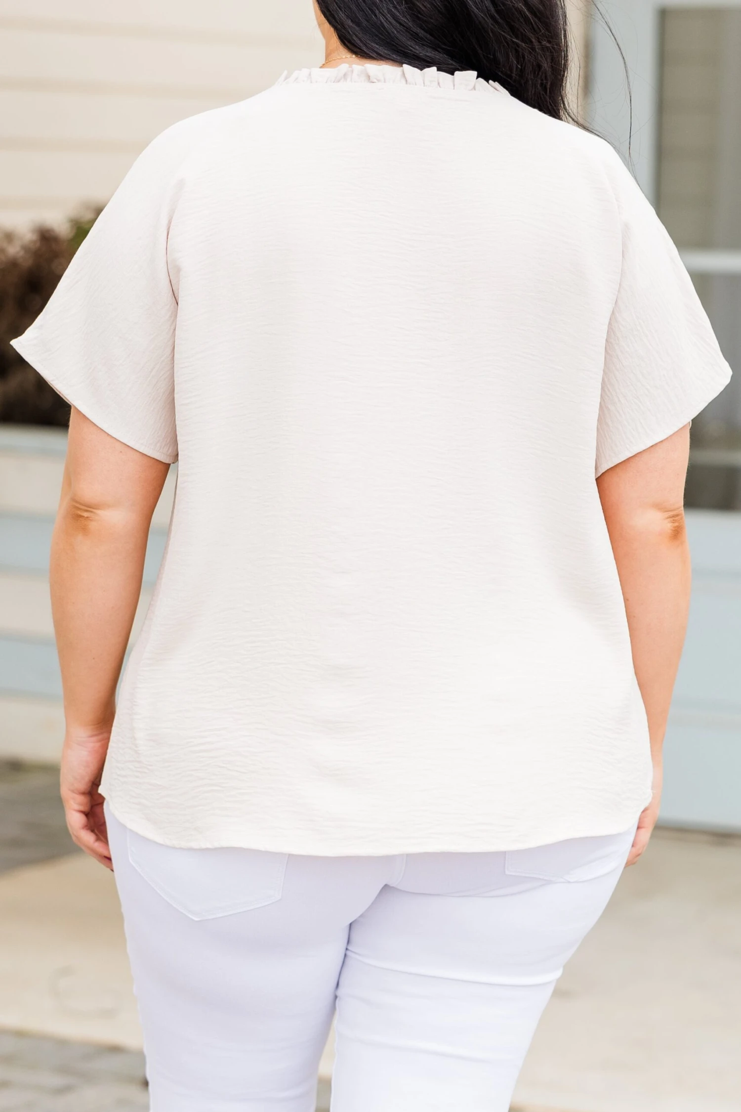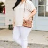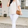 We simply adore this top! The top features a ruffled neckline and a classic oatmeal color that adds a touch of elegance, perfect for pairing with white denim or patterned pants! Elevate your style with this chic and versatile top!