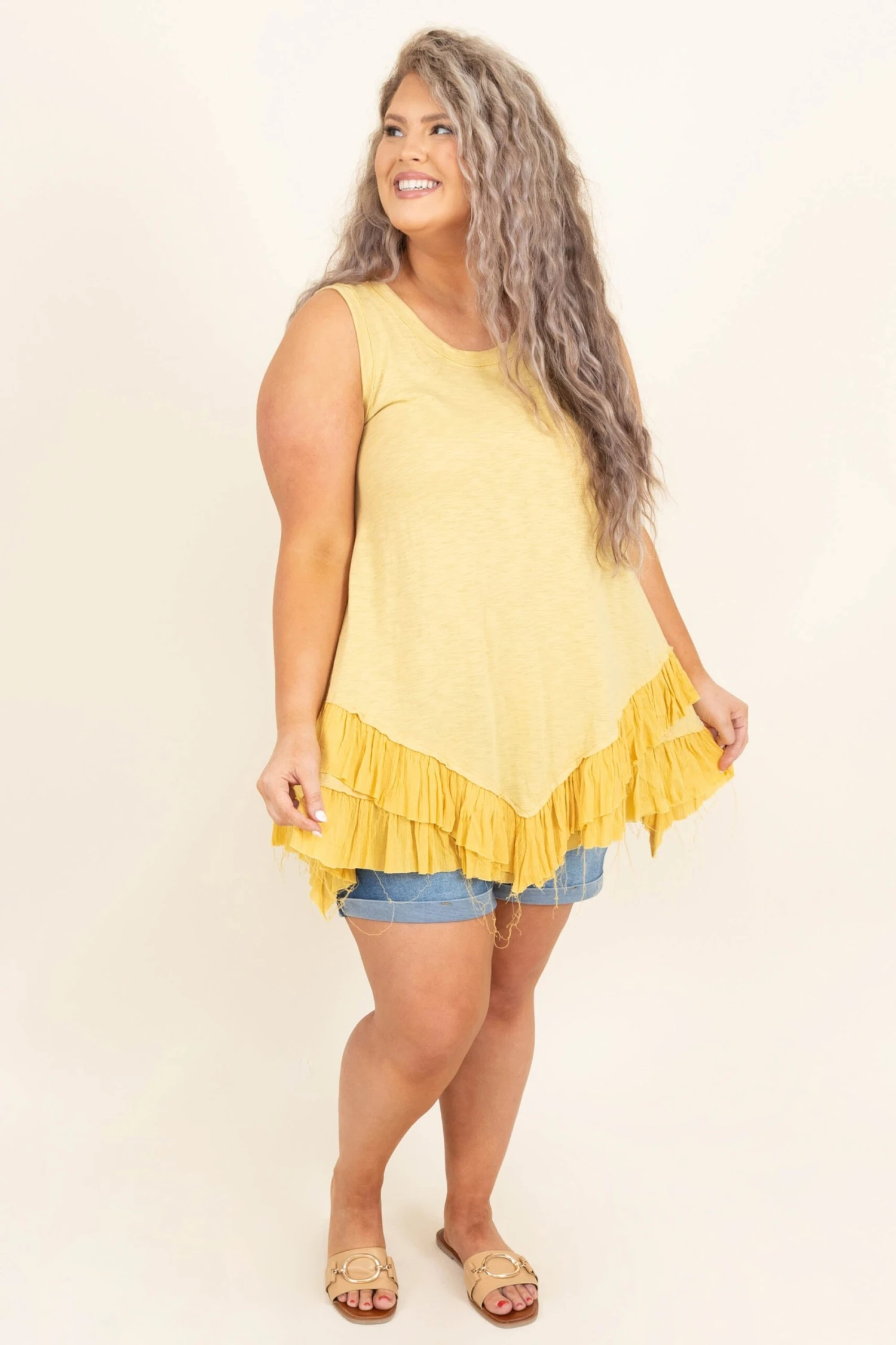 Go out for a walk and show off this cute top! The butter yellow color is oh so sweet and the ruffle hem is so cute! The basic style is so easy to dress up with some accessories or down with some shorts! We love it best with jean shorts and sandals for the perfect look!