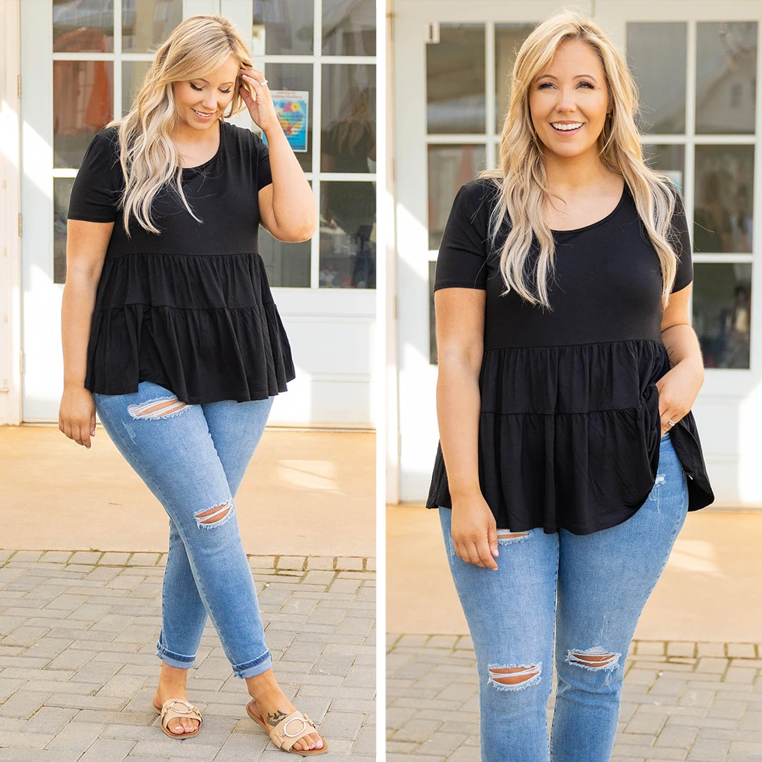 Put this fun top on and throw yourself a pacific coast party! The black color is so classically chic making such a fashion statement! The babydoll style is so flattering on all body types and the soft fabric makes this so easy to throw on for anything! Style this babe with some skinnies and sandals for a stylish look!