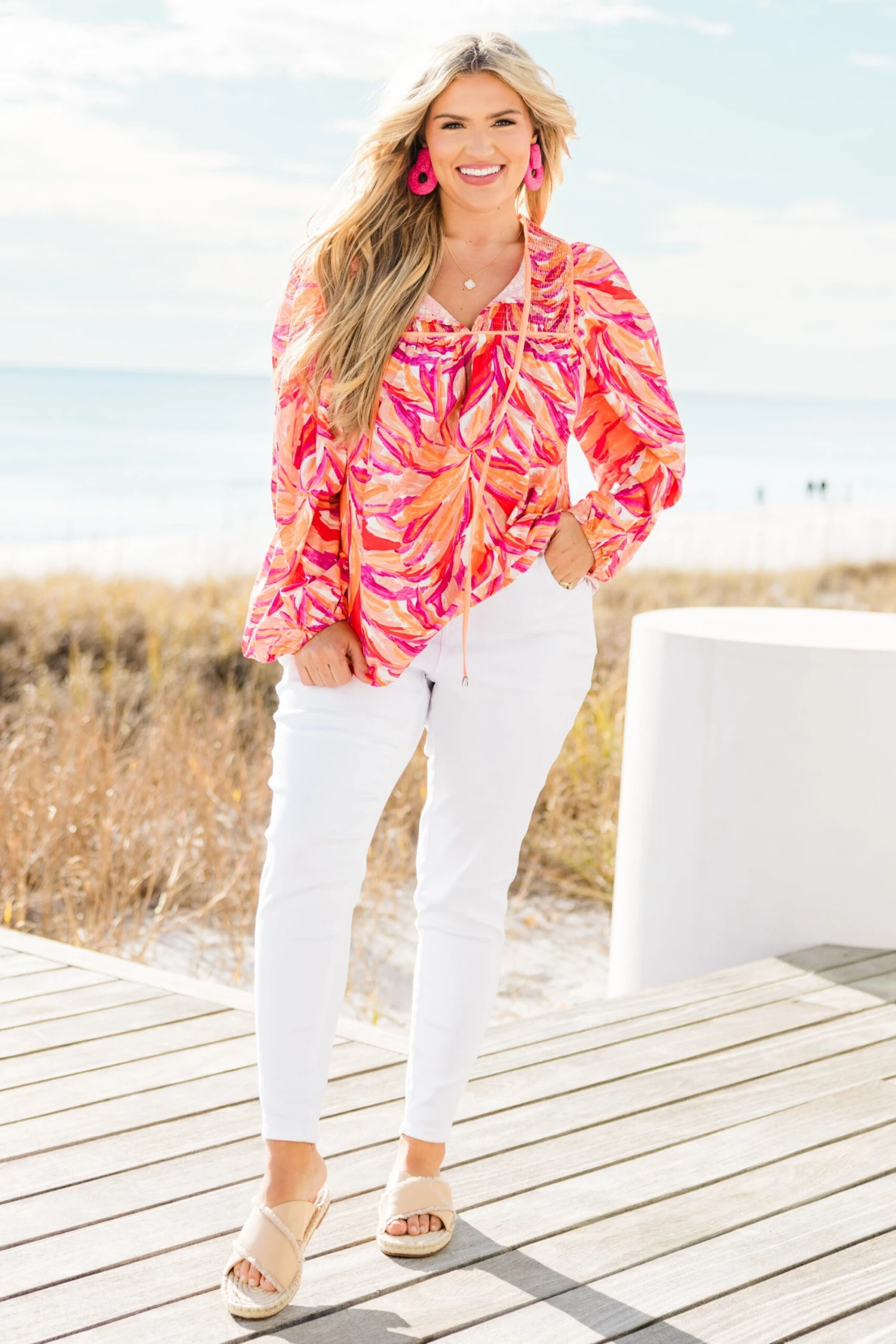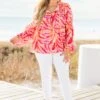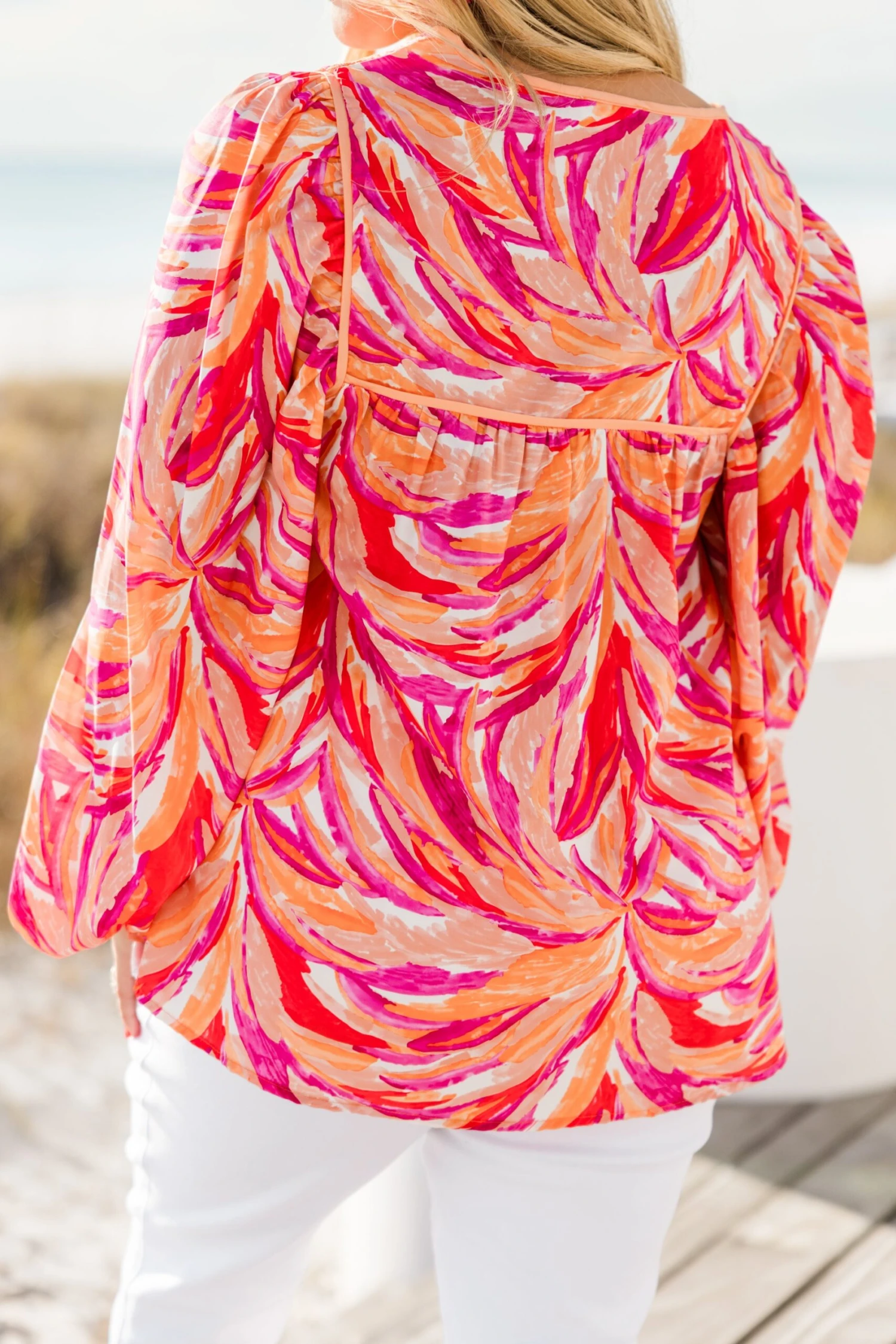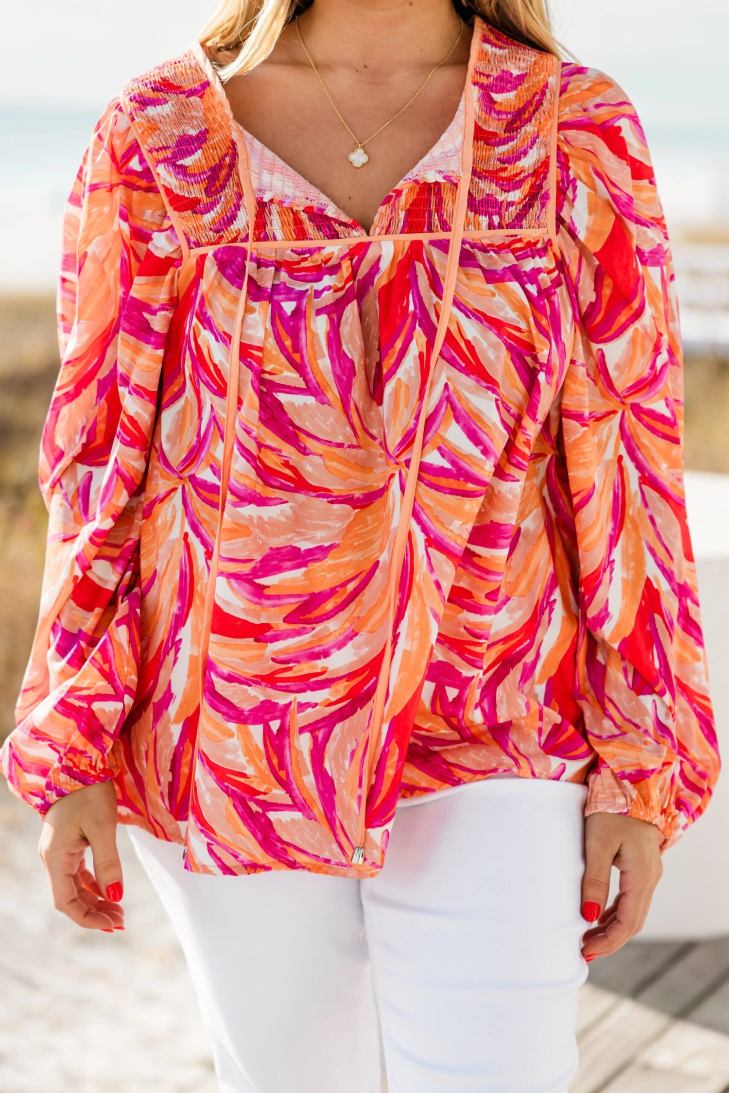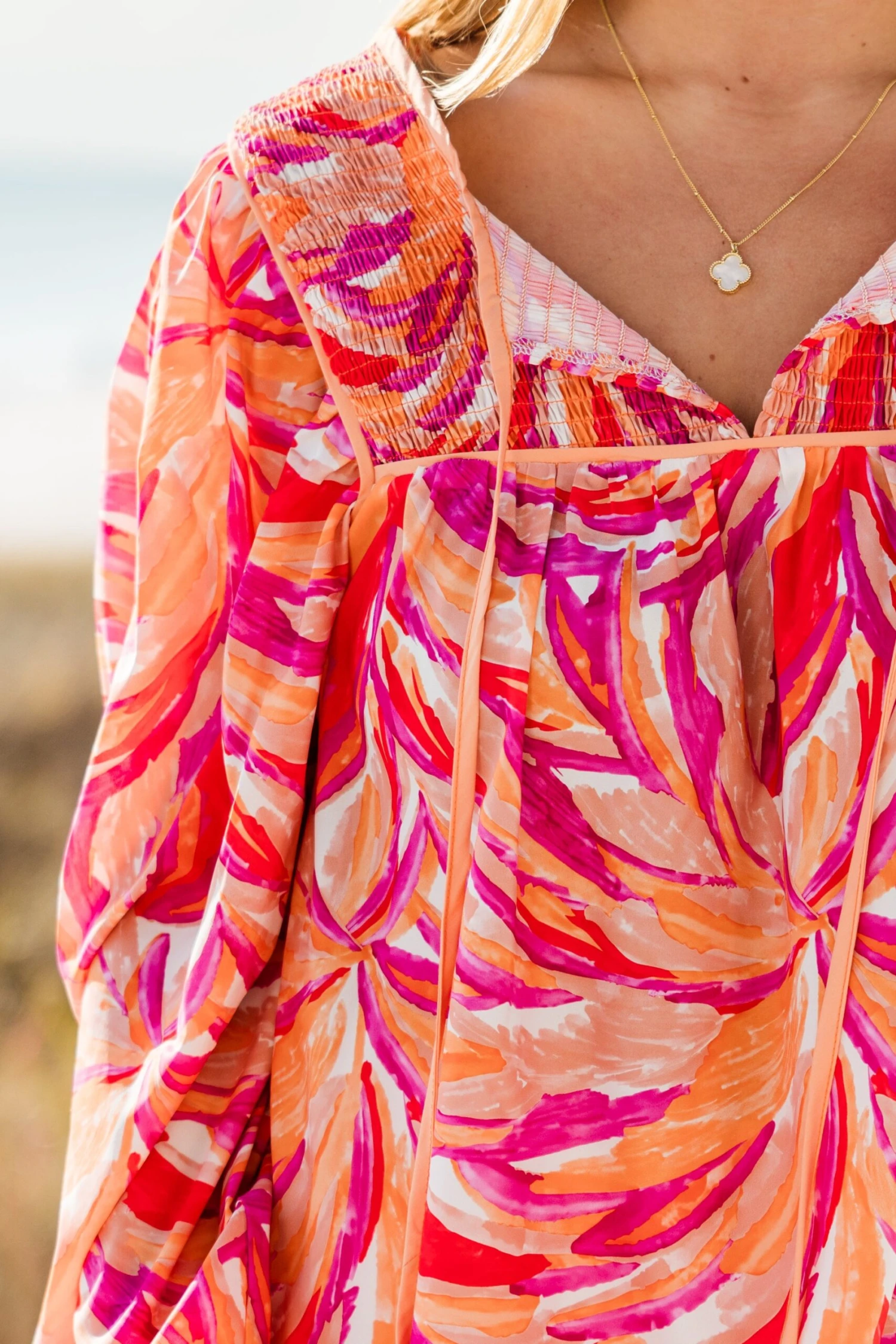Get ready to paint over the sky in this vibrant top! With a colorful watercolor abstract print, split v-neck, smocked detailing, tassels, and elastic cuffs, you’ll feel like a masterpiece! Brighten up any outfit with this playful and unique top!
