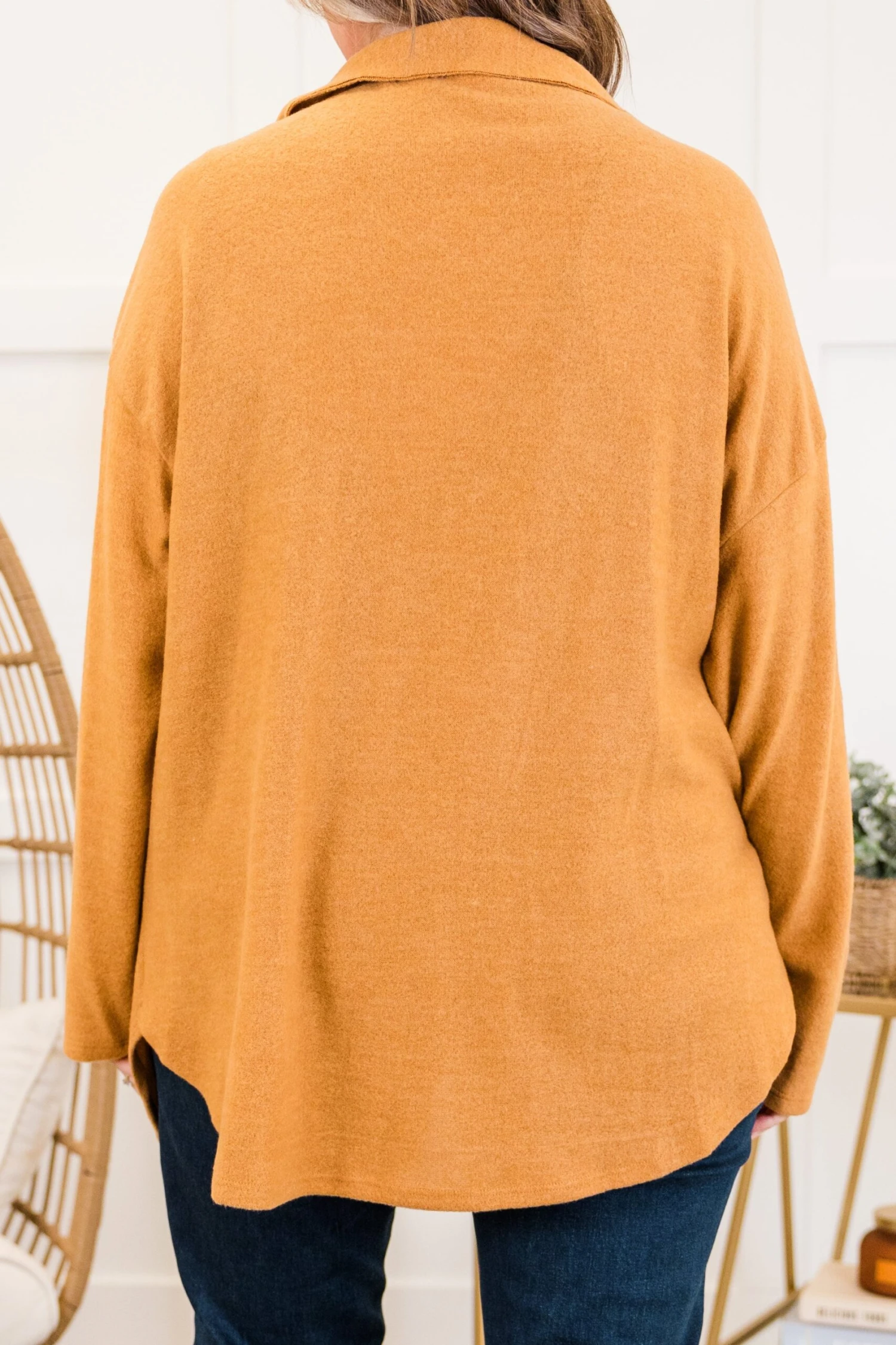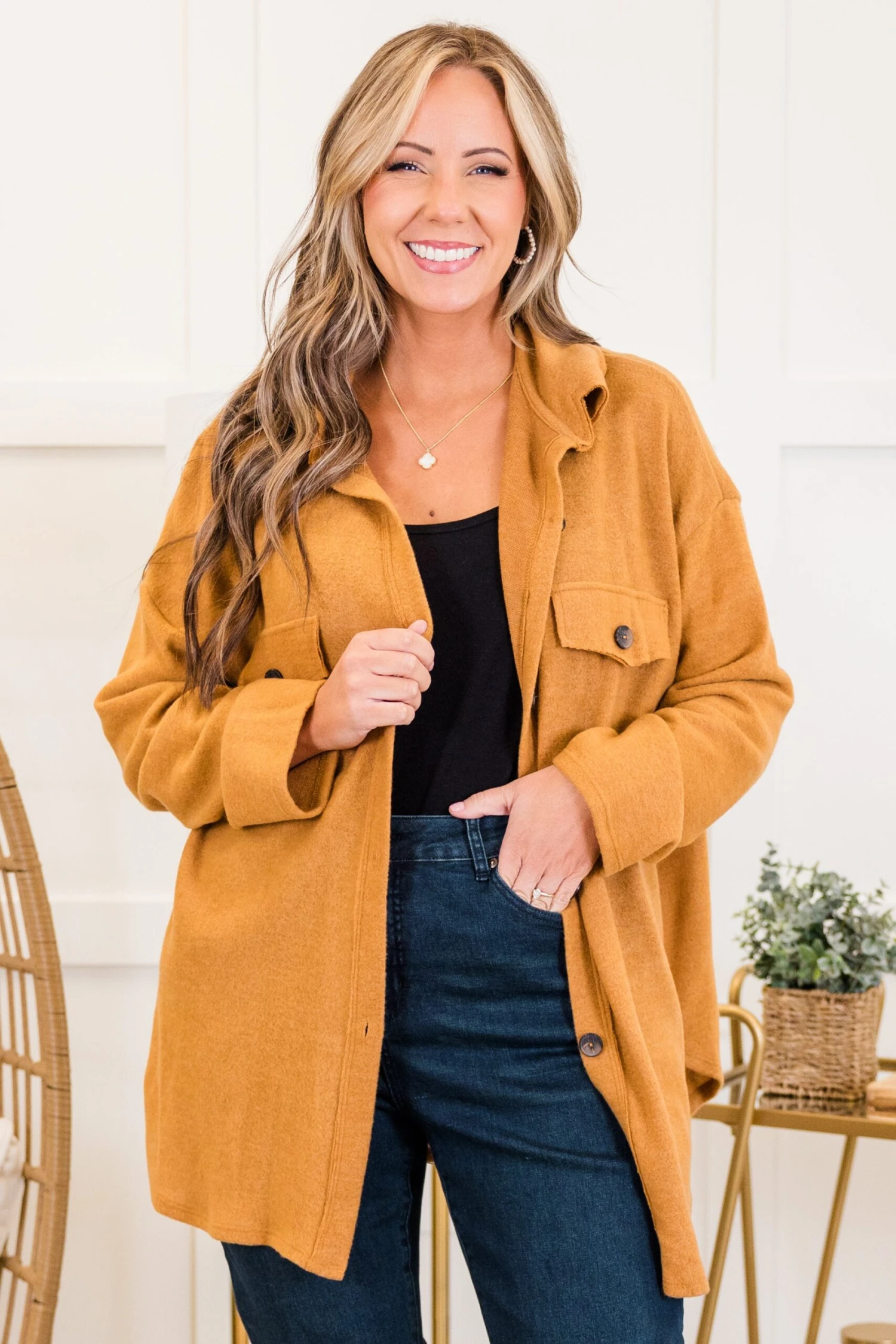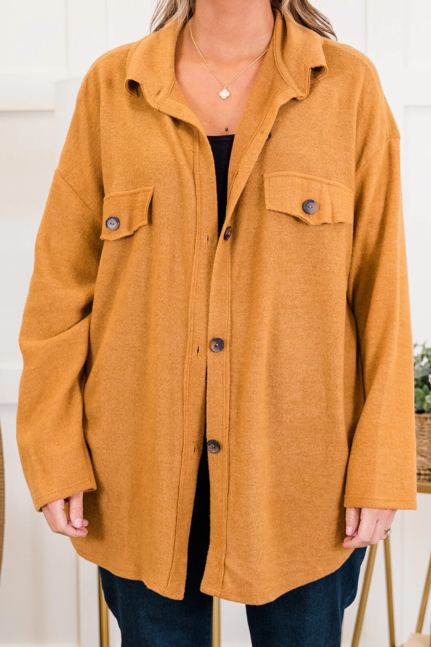 Introducing the Passing Glances Jacket in a luxurious caramel color! Made from brushed hacci material, this jacket offers both comfort and style! The functional buttons add a touch of sophistication to this versatile piece! Perfect for any occasion, stay cozy and chic in this must-have jacket!