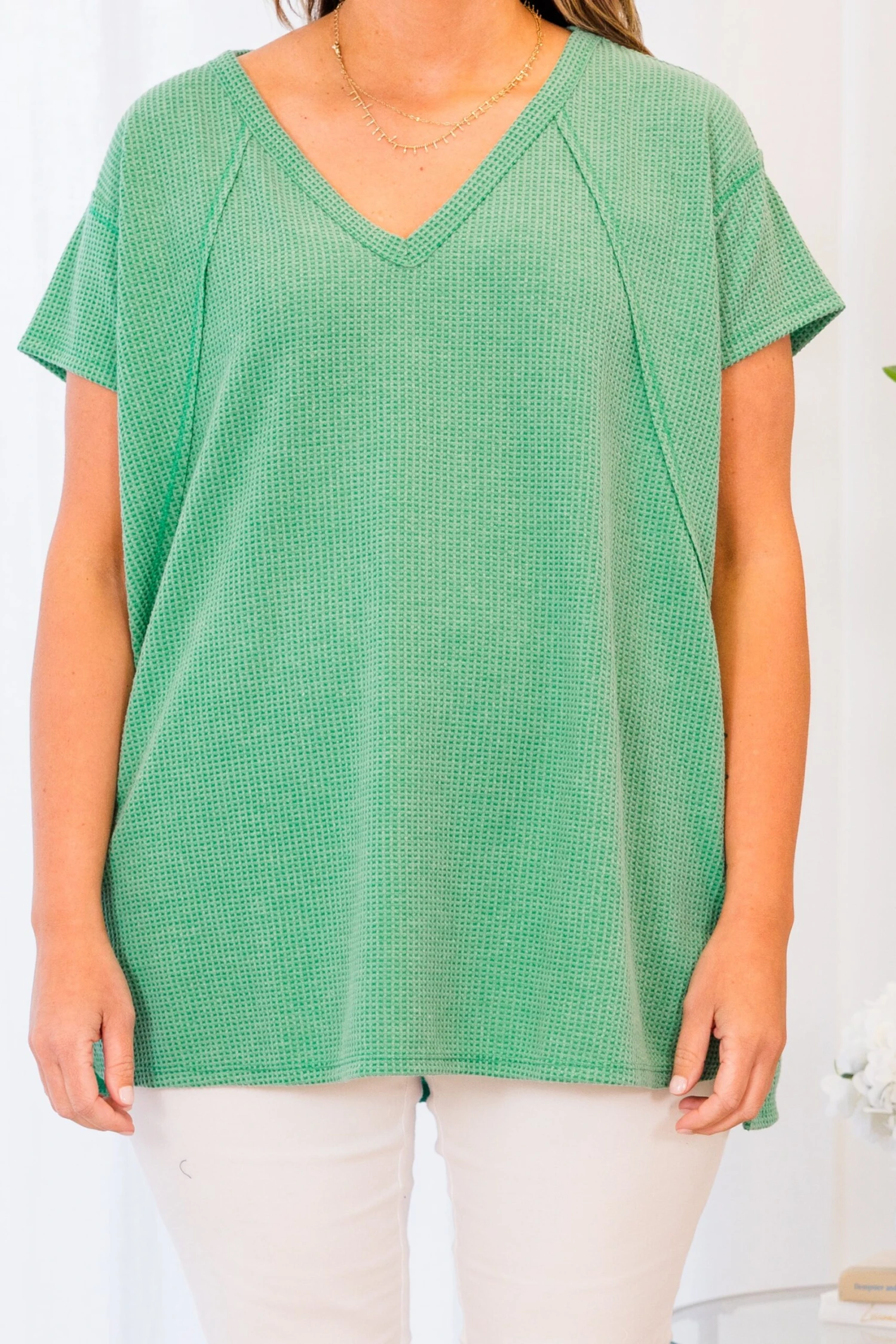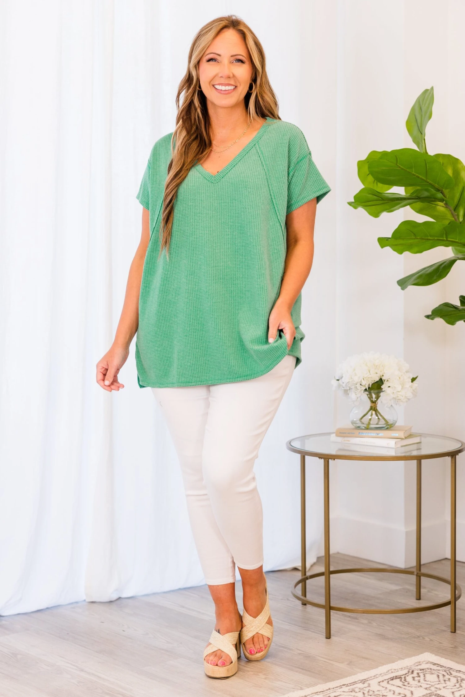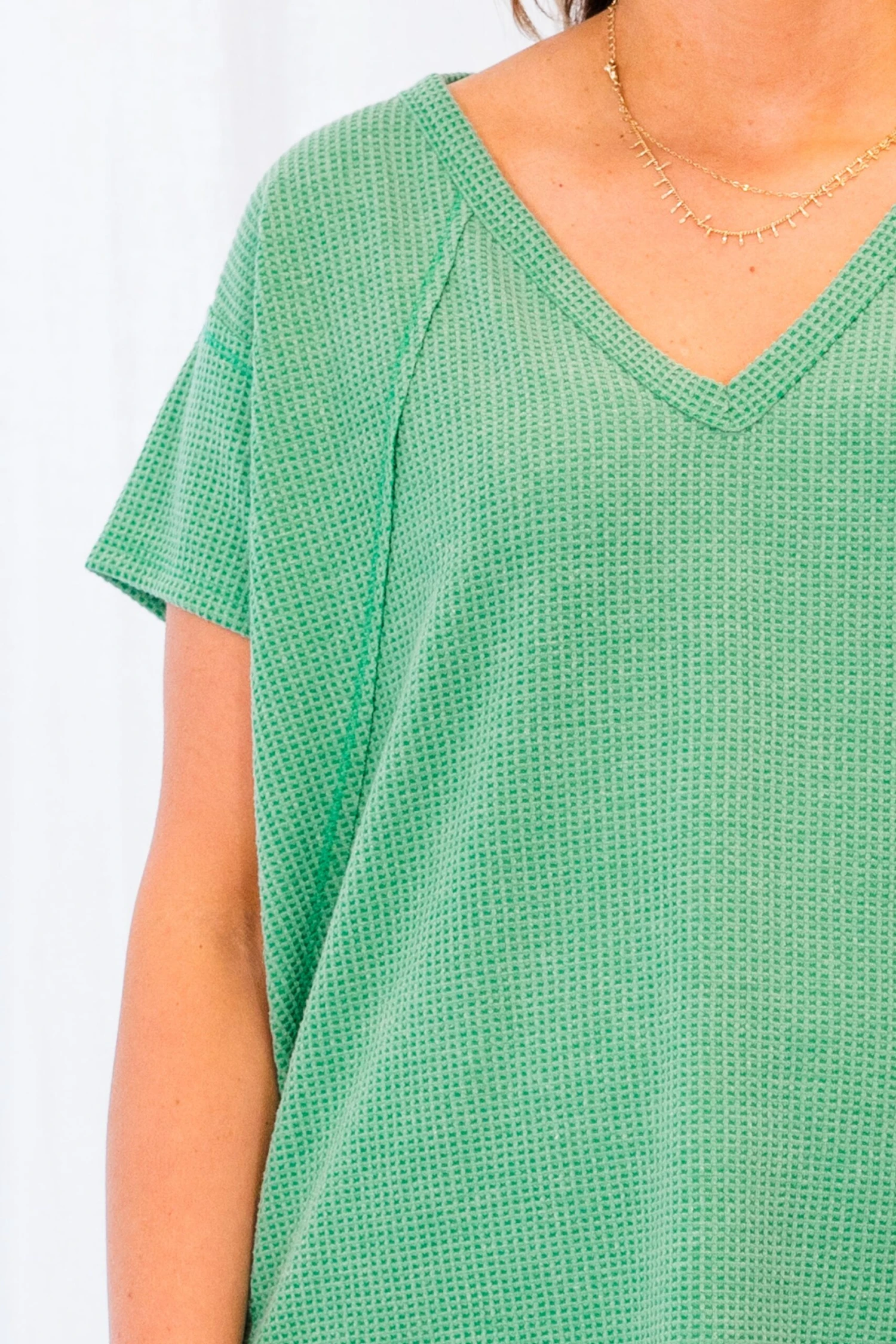 Stay comfortable and stylish in this adorable top! Featuring a pretty kelly green color and a unique textured design, this cutie is perfect for a casual day out! The exposed seams add a touch of edginess to this must-have piece!Â