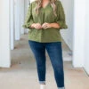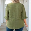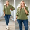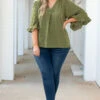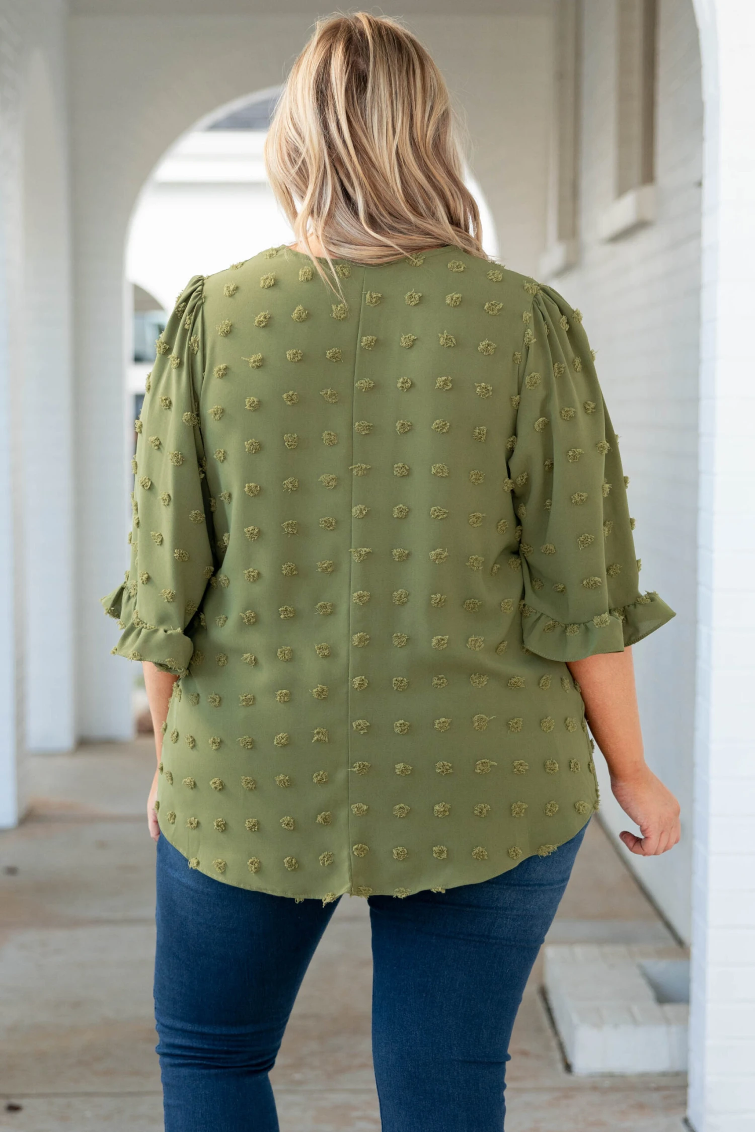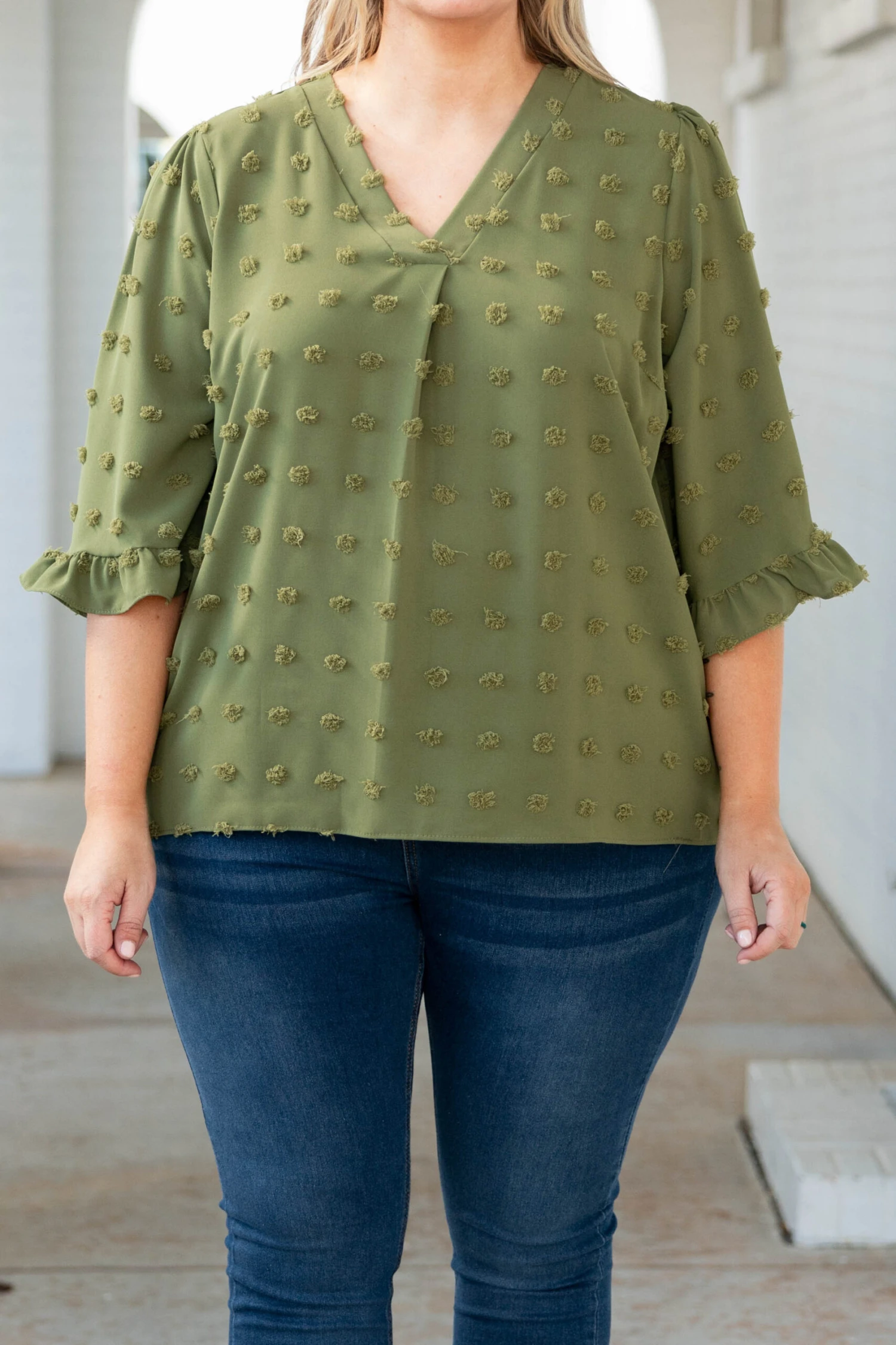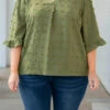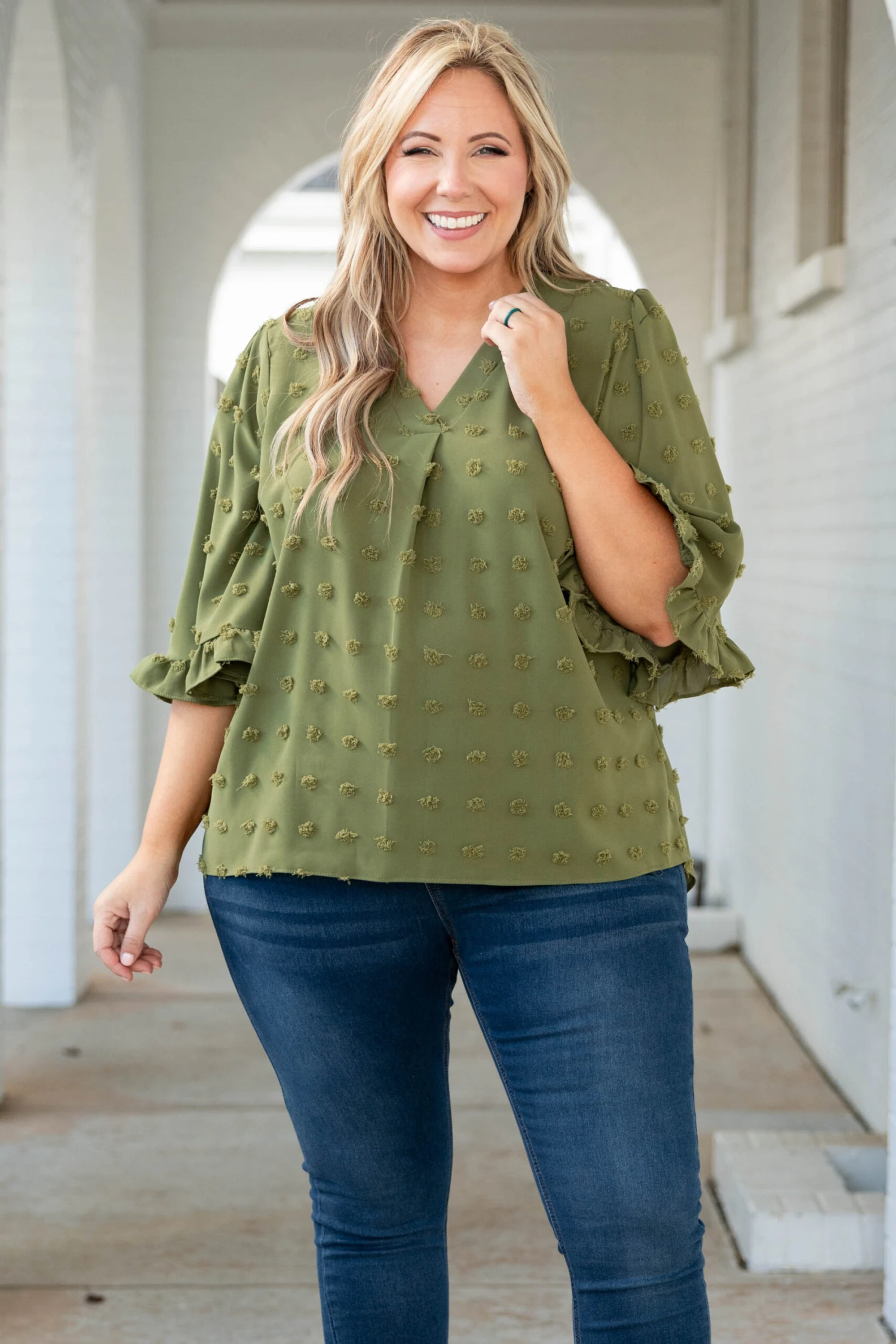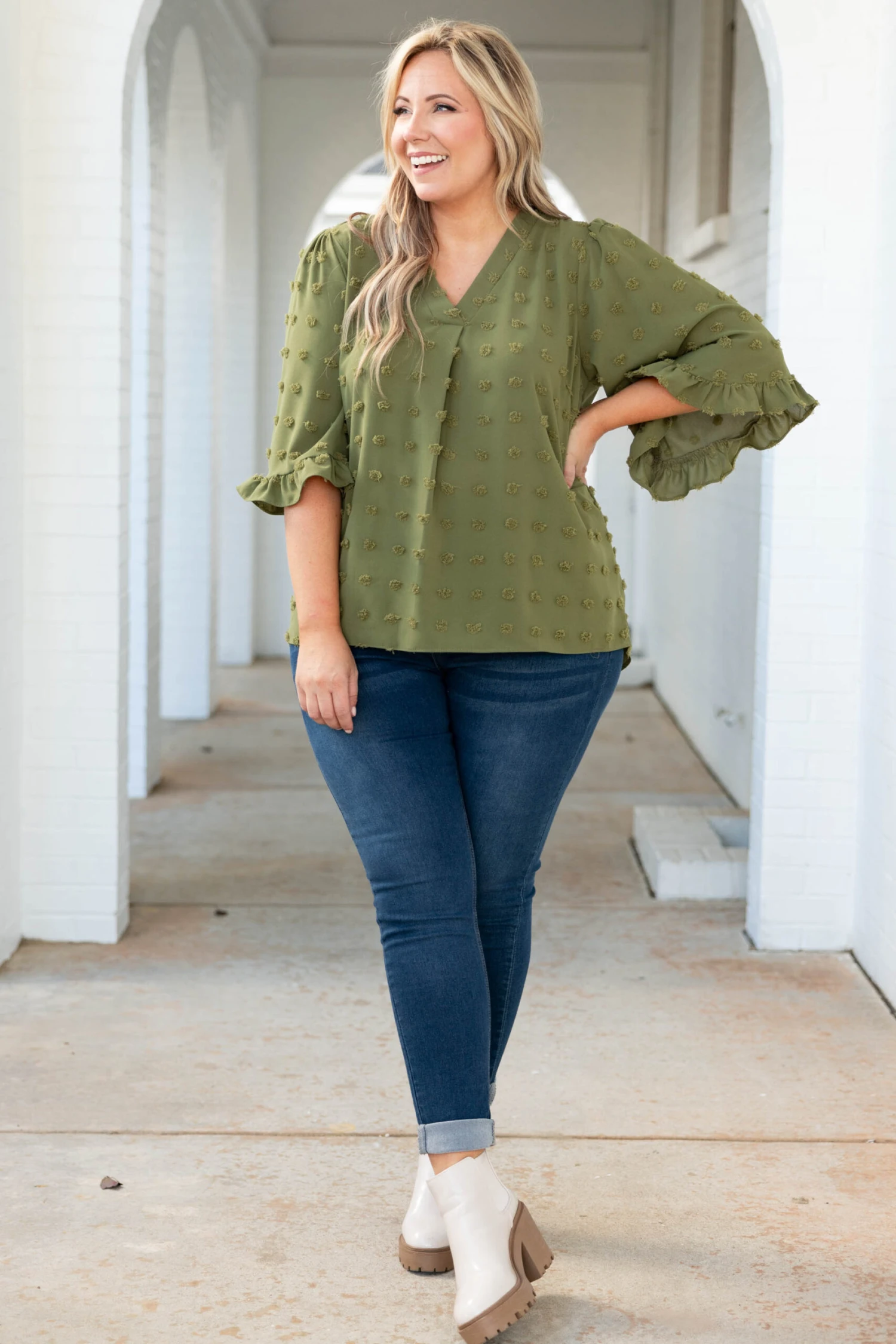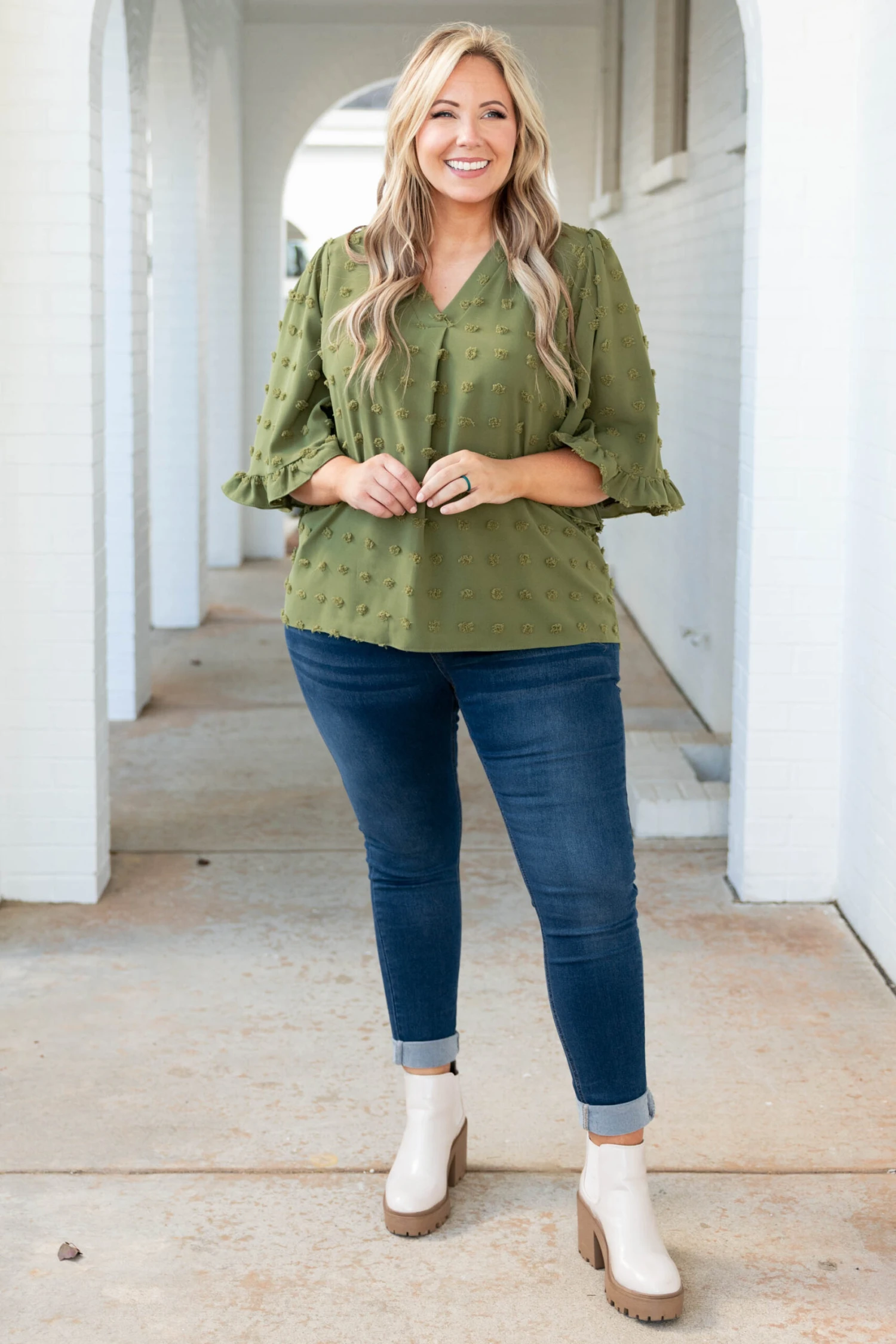 It’ll give you so much peace knowing you have this gorgeous top in your wardrobe! This top has an olive color with a raised polka-dot pattern that is so sweet! the ruffled sleeves and flowy fit are perfect for everyday wear! Style this top with some skinnies and boots for an everyday chic look!