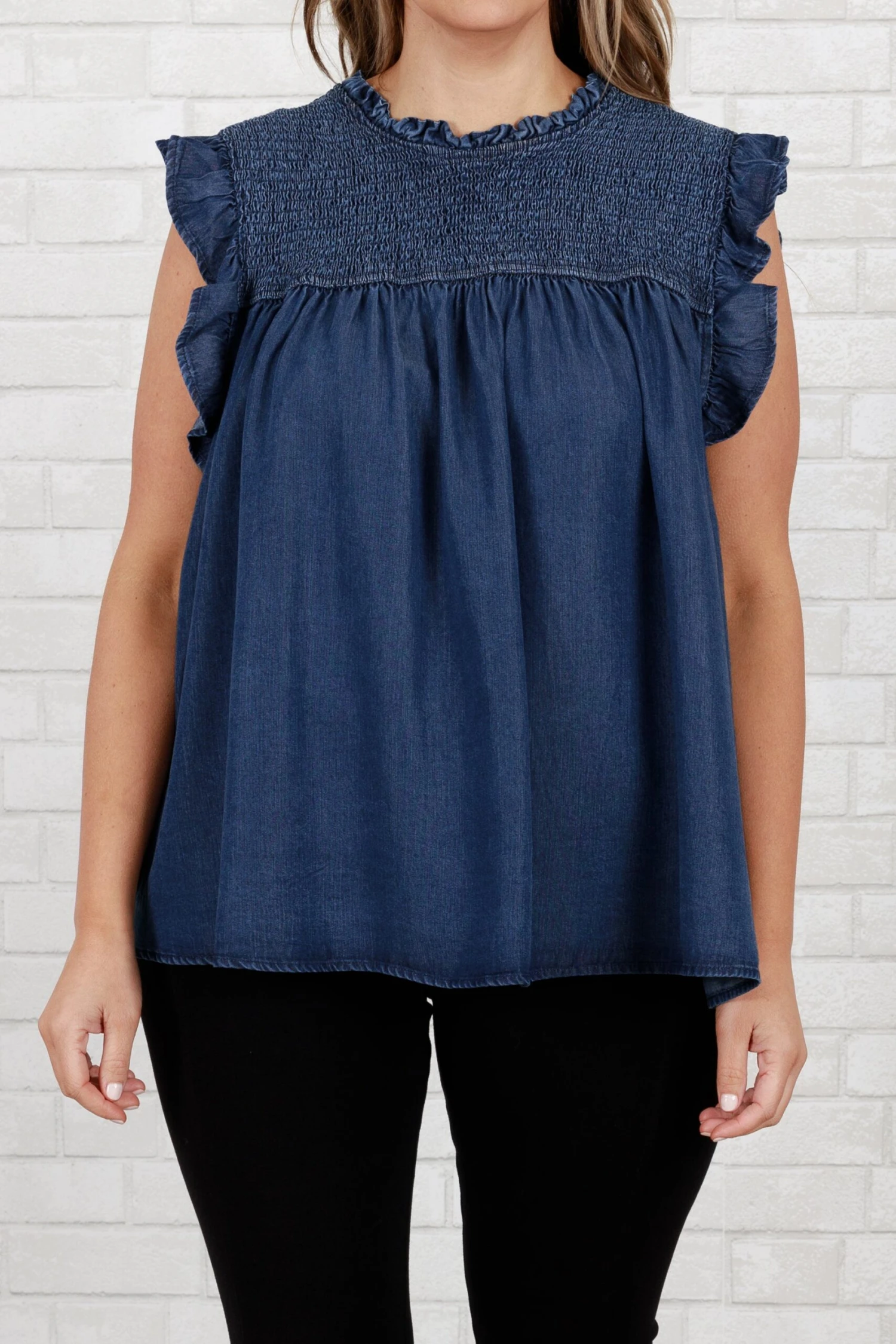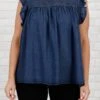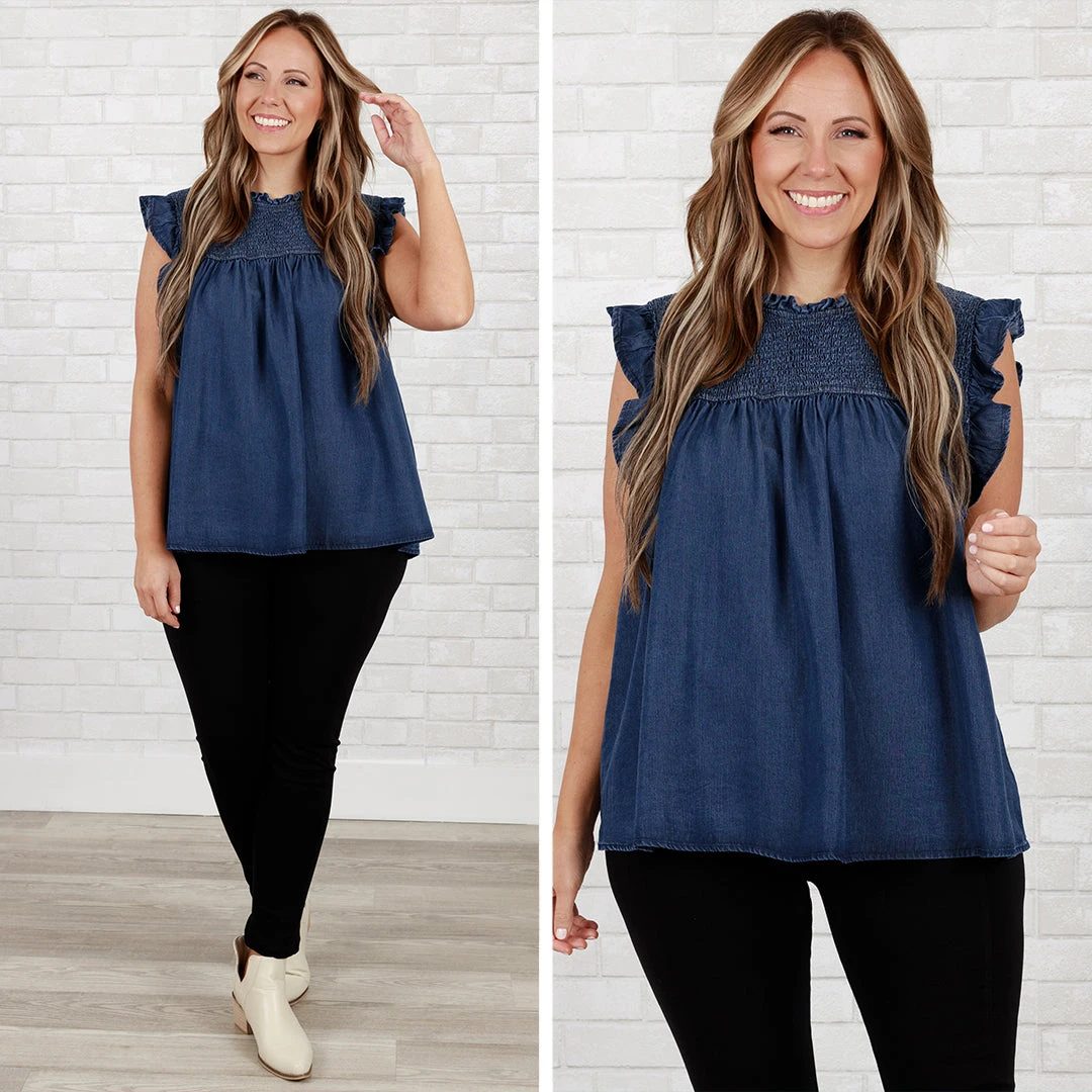 Adore the perfection of this top! The dark denim color is gorgeous and so trendy. And the ruffle sleeves are so darn sweet! Style this with jeans and boots for a chic everyday look!