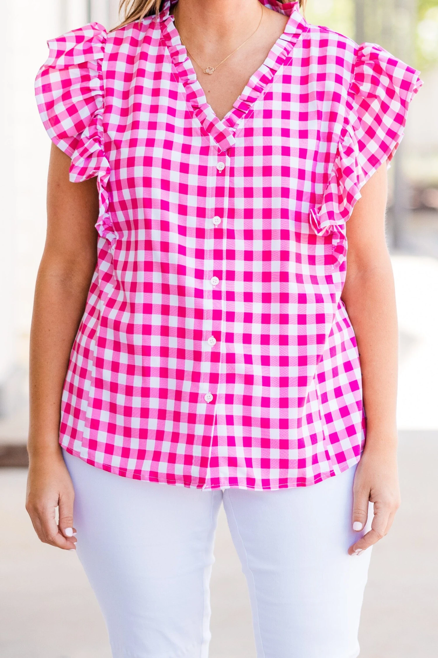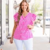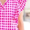 Embrace the sweetness of a sunny picnic day in this pink gingham top! The flutter sleeves add a touch of whimsy while the functional buttons allow for easy wear! Perfect for a casual yet chic look that will turn heads and lift your spirit!
