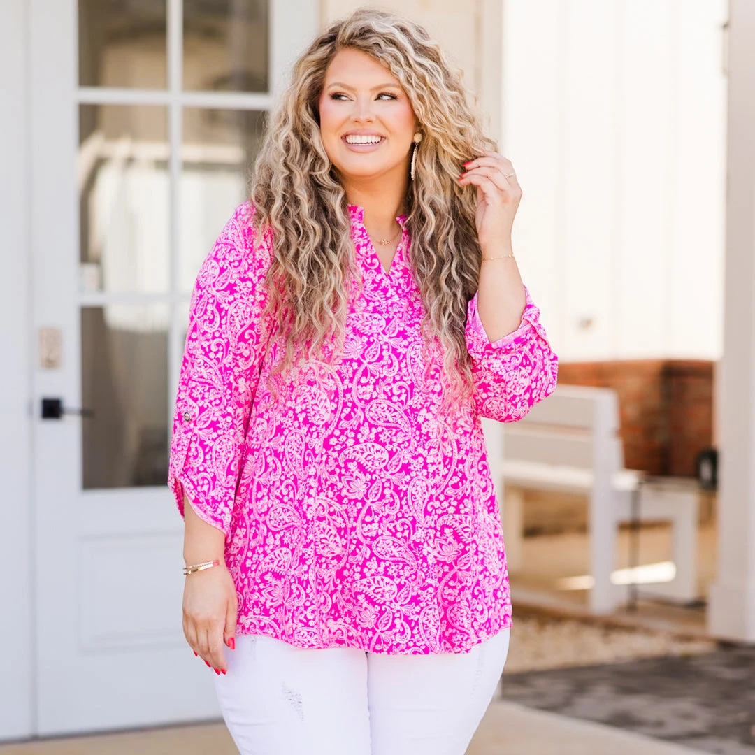 Make peace with your wardrobe this season! Grab this FAB top that has an easy care, wrinkle free design and a bold floral pattern that is just what your wardrobe needs! It features a bold hot pink color and will quickly become a go-to for all day wear! Pair with distressed skinnies and heels for a classy chic look!