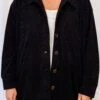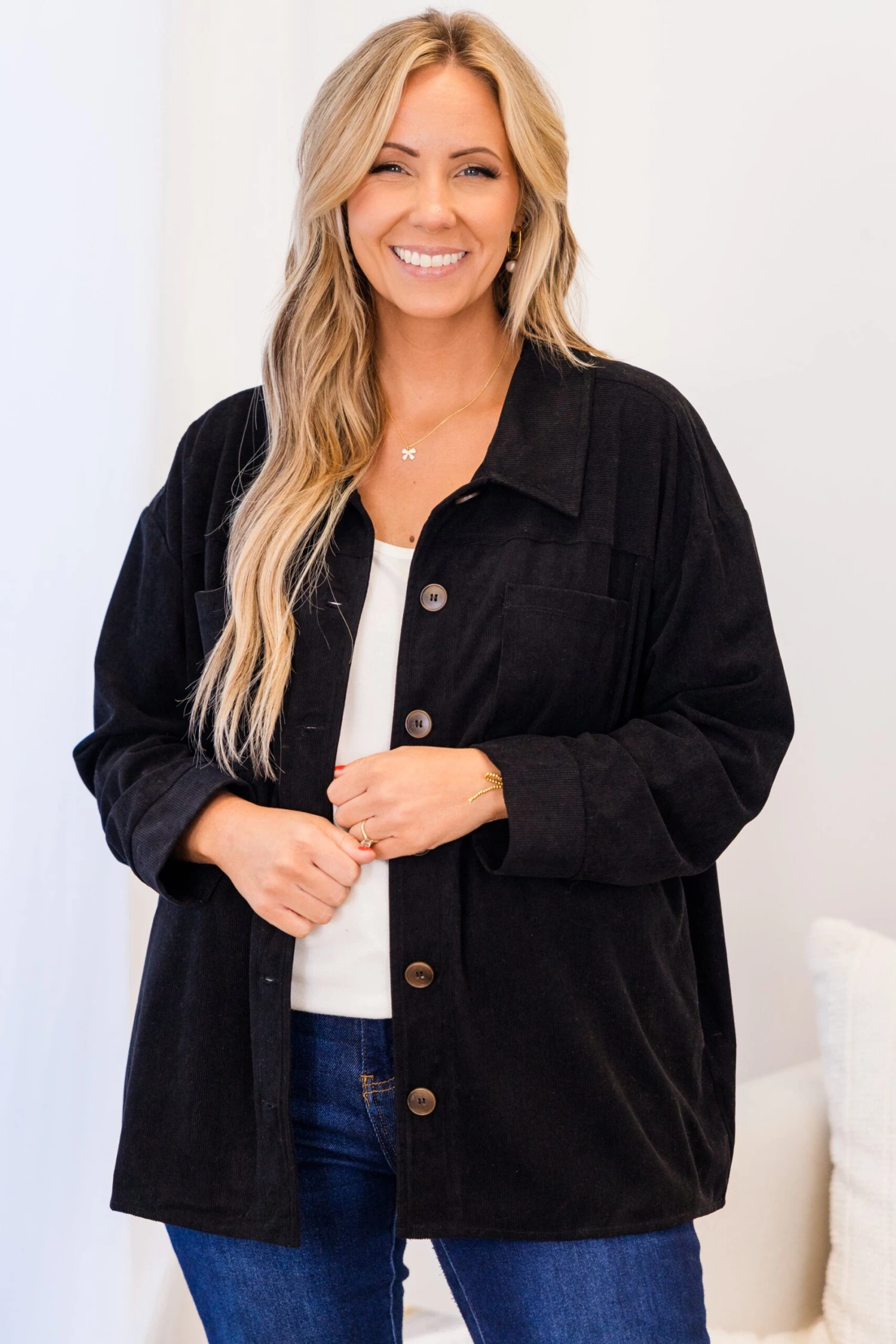 Stay stylish and comfortable with this jacket in black! This long-sleeve jacket features a collared ribbed design with light brown buttons and pockets on the bodice for a classic look! The trendy crochet detail on the back adds a touch of uniqueness! Perfect for cozy season, this jacket is a versatile addition to your wardrobe!