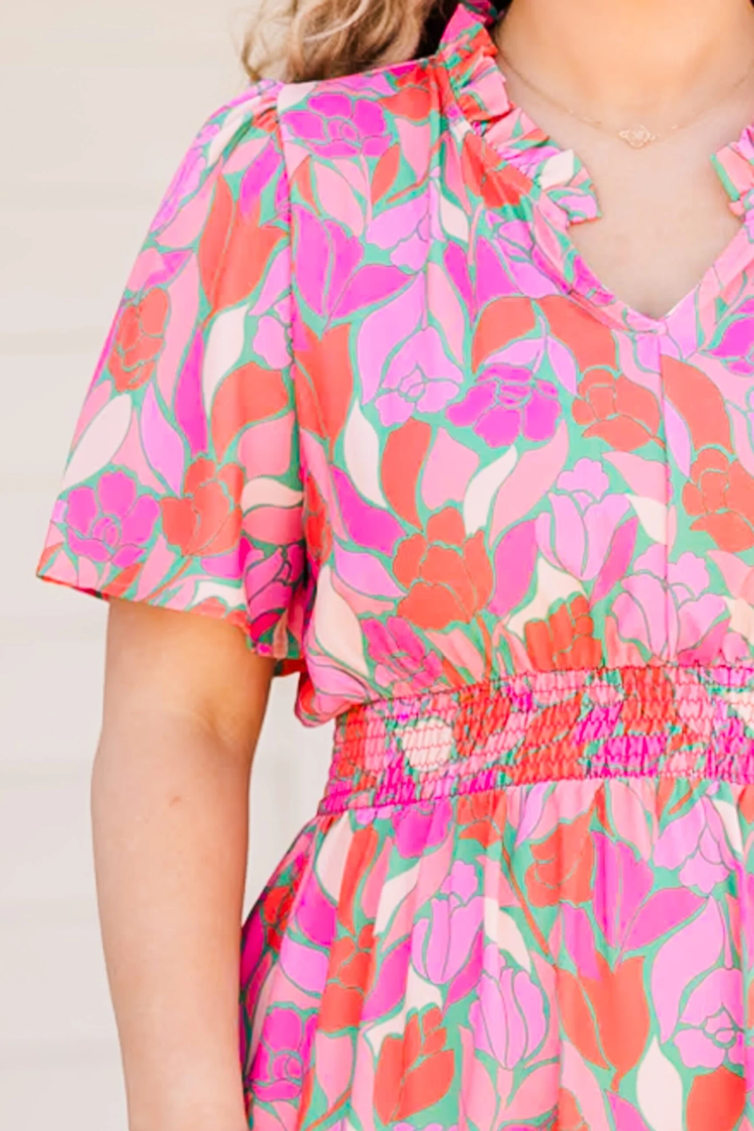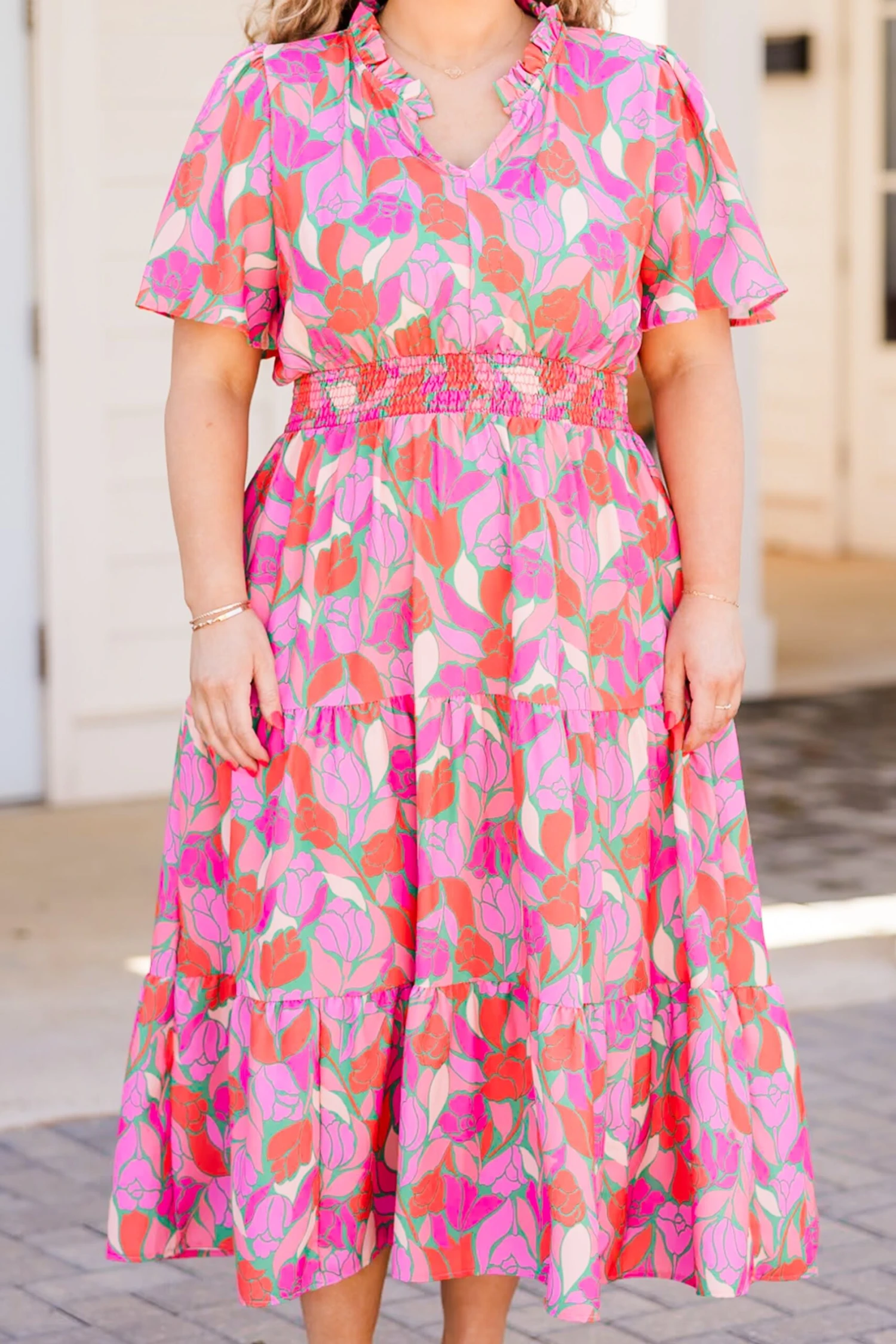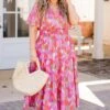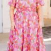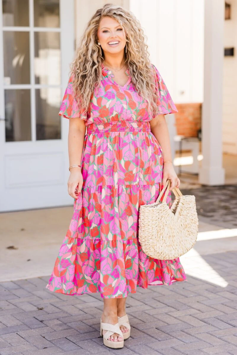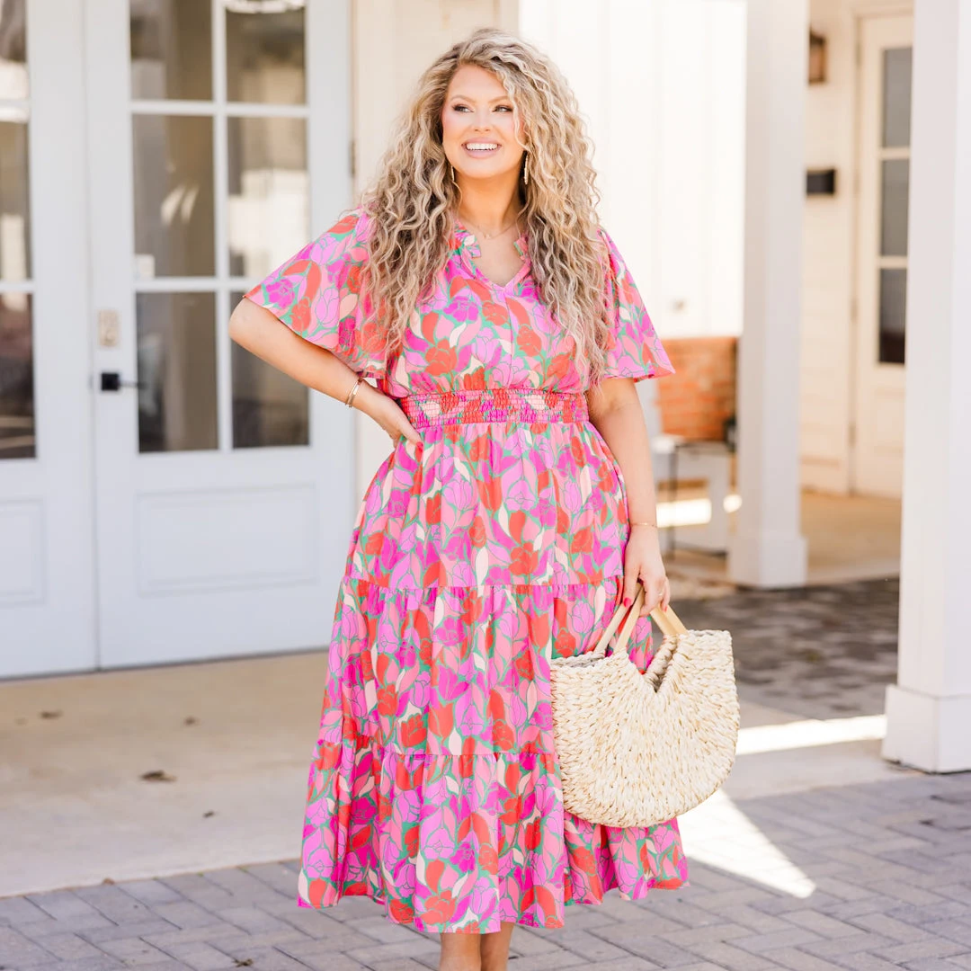 This dress truly makes us smile! With a cinched waistline, this flowy dress provides the perfect fit and length! The elegant floral pattern adds a touch of sophistication to your wardrobe! Style this dress with cute accessories and heels for an unforgettable chic look!
