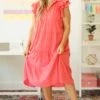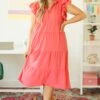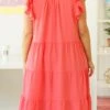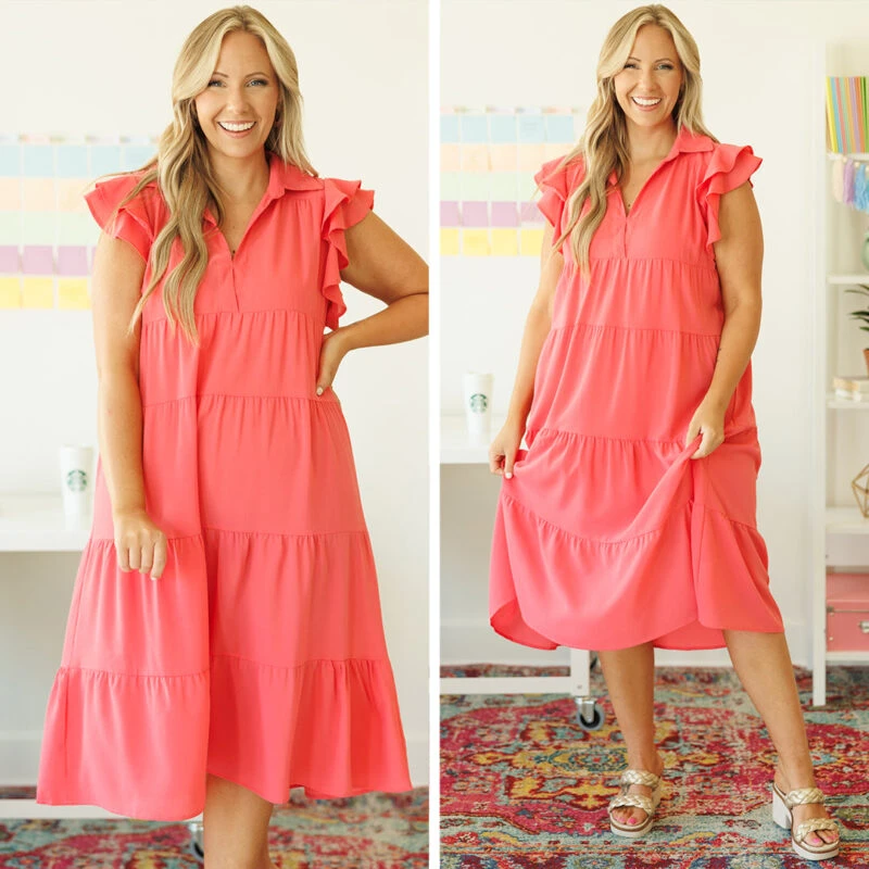 This dress is so stunning! The coral color will have all eyes on you and the midi length is so trendy! We love the ruffle sleeves that are so sweet and the babydoll style is flattering on everyone! Style this with some heels and fab accessories for a super chic look!