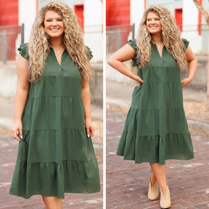 This dress is so stunning! The olive color will have all eyes on you and the midi length is so trendy! We love the ruffle sleeves that are so sweet and the babydoll style is flattering on everyone! Style this with some heels and fab accessories for a super chic look!