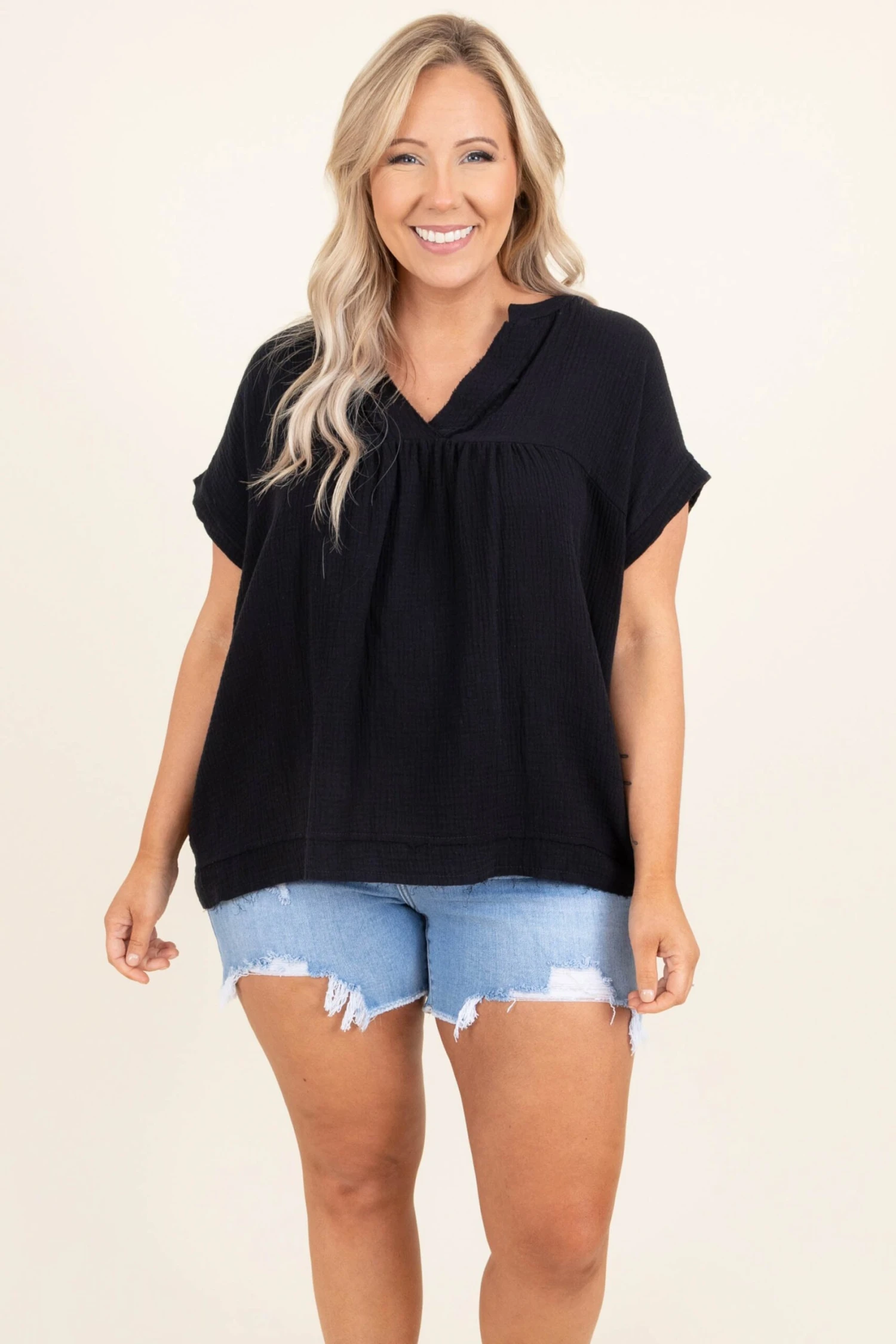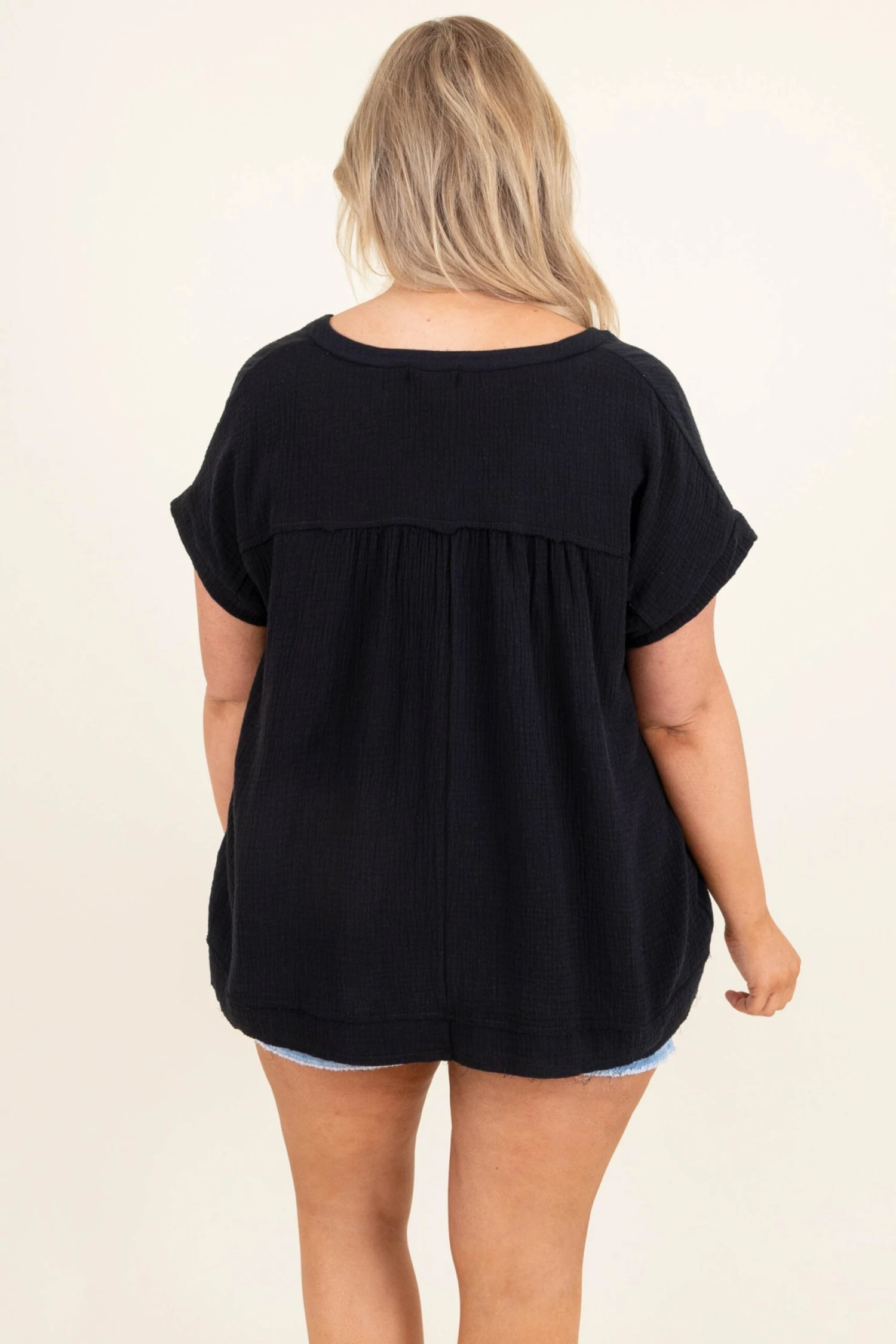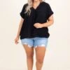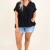 This top deserves a spot in your closet this season! The black color is classic and the linen feel of the fabric is so trendy! We love the basic style of this that looks so good with some denim shorts and some sandals!
