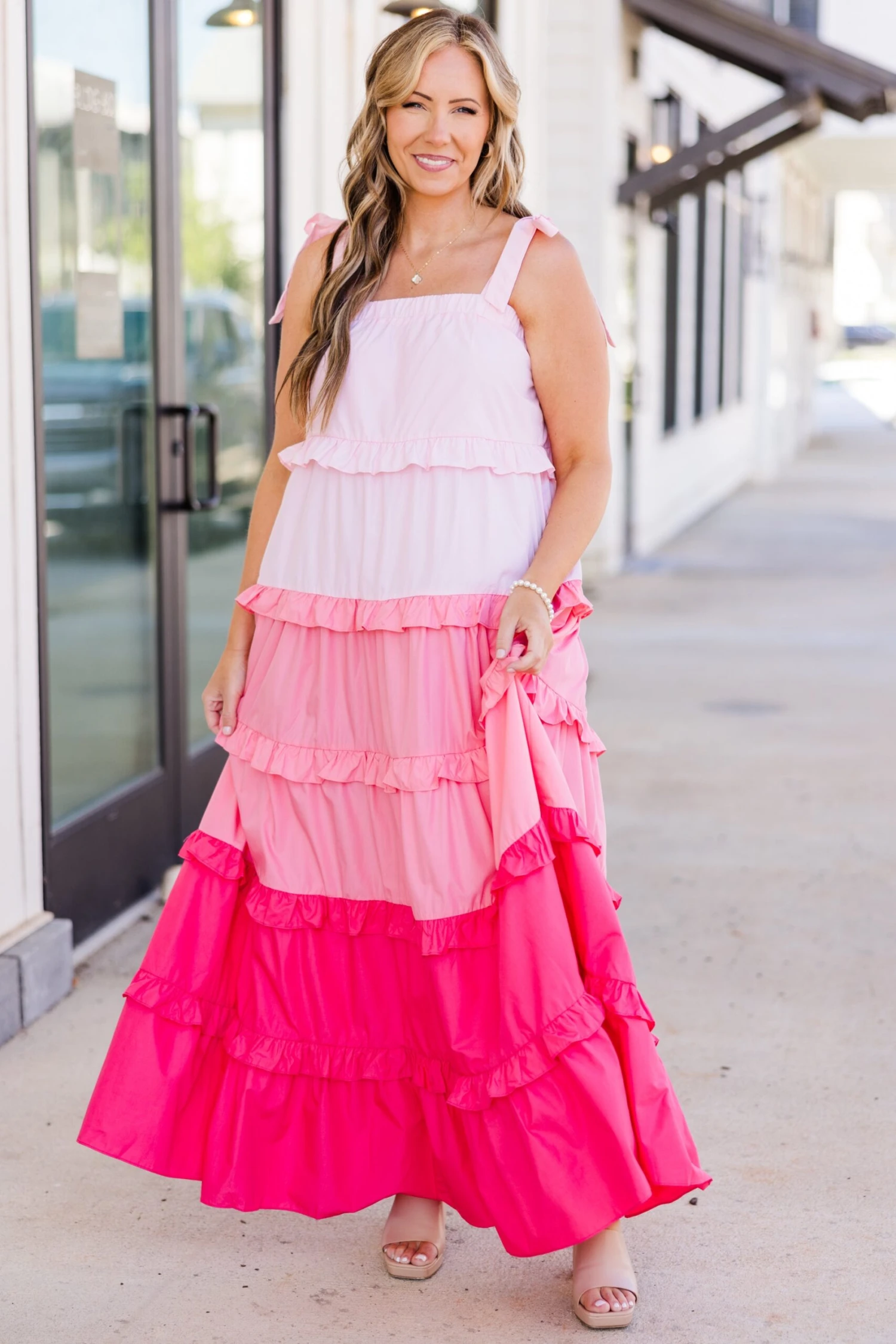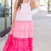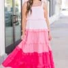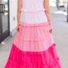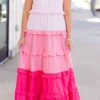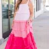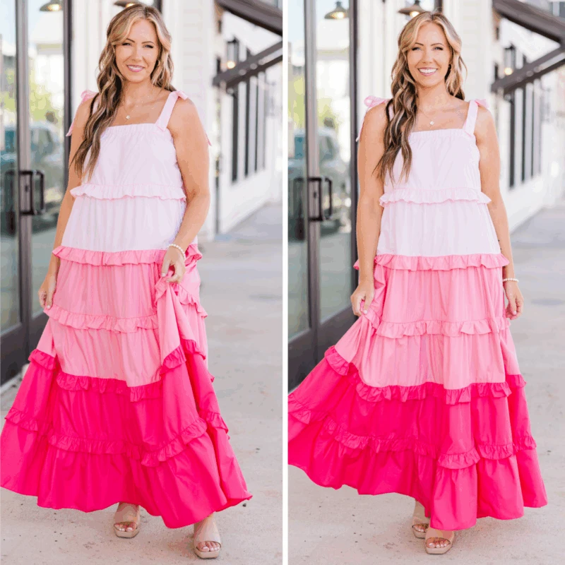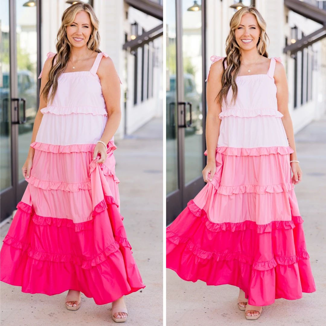 Introducing your new summer favorite: the Pocket Full of Roses Maxi Dress in pink multi! With adjustable tie straps and an elastic top, this dress is perfect for any occasion! The pink ombre ruffle adds a touch of playfulness to this must-have dress!