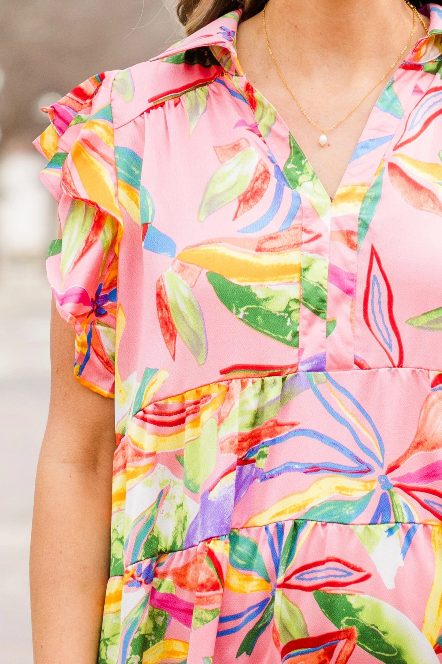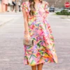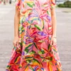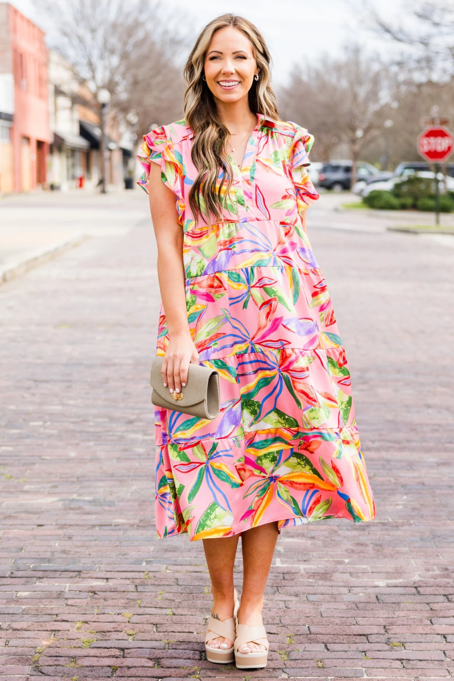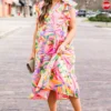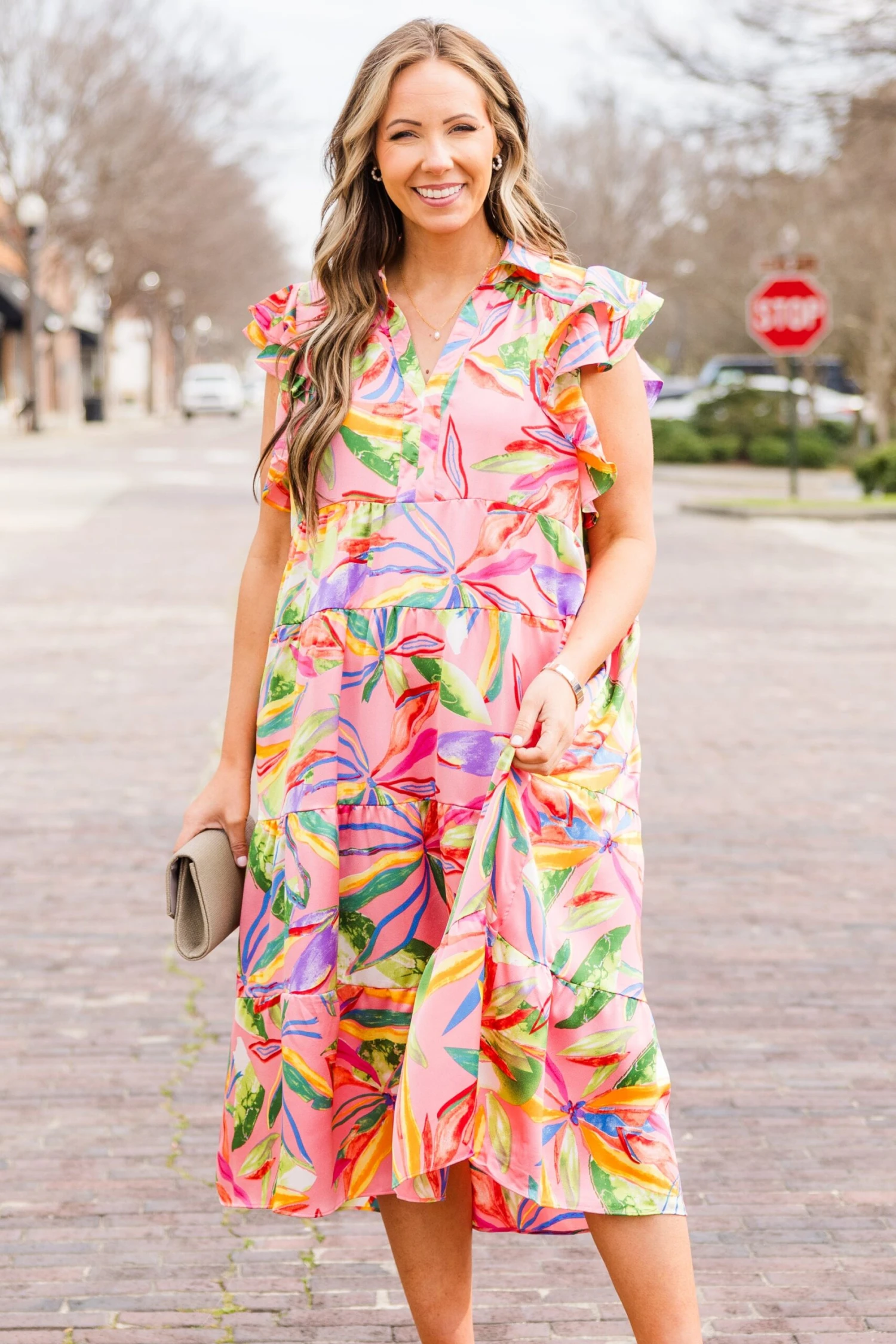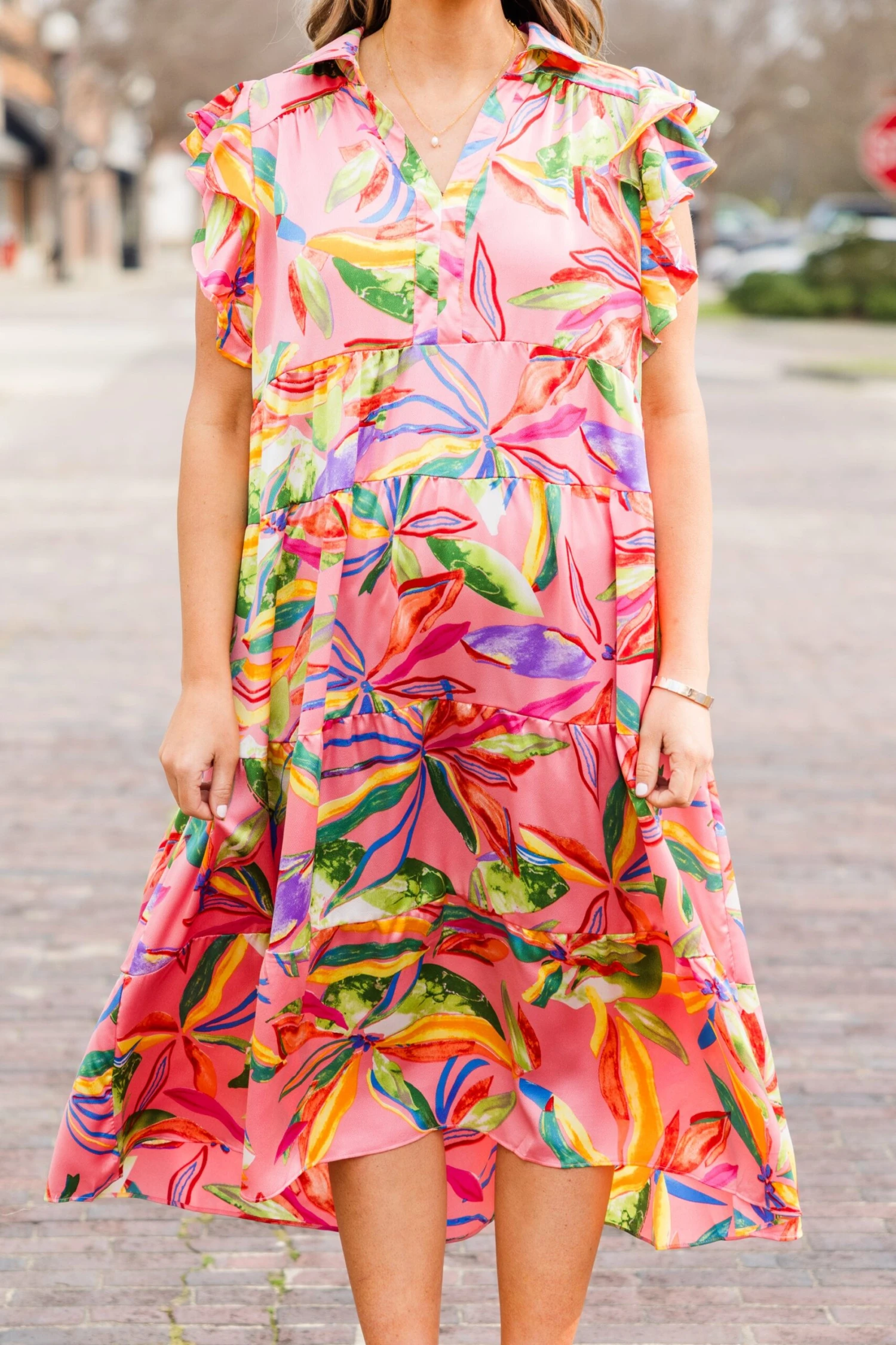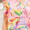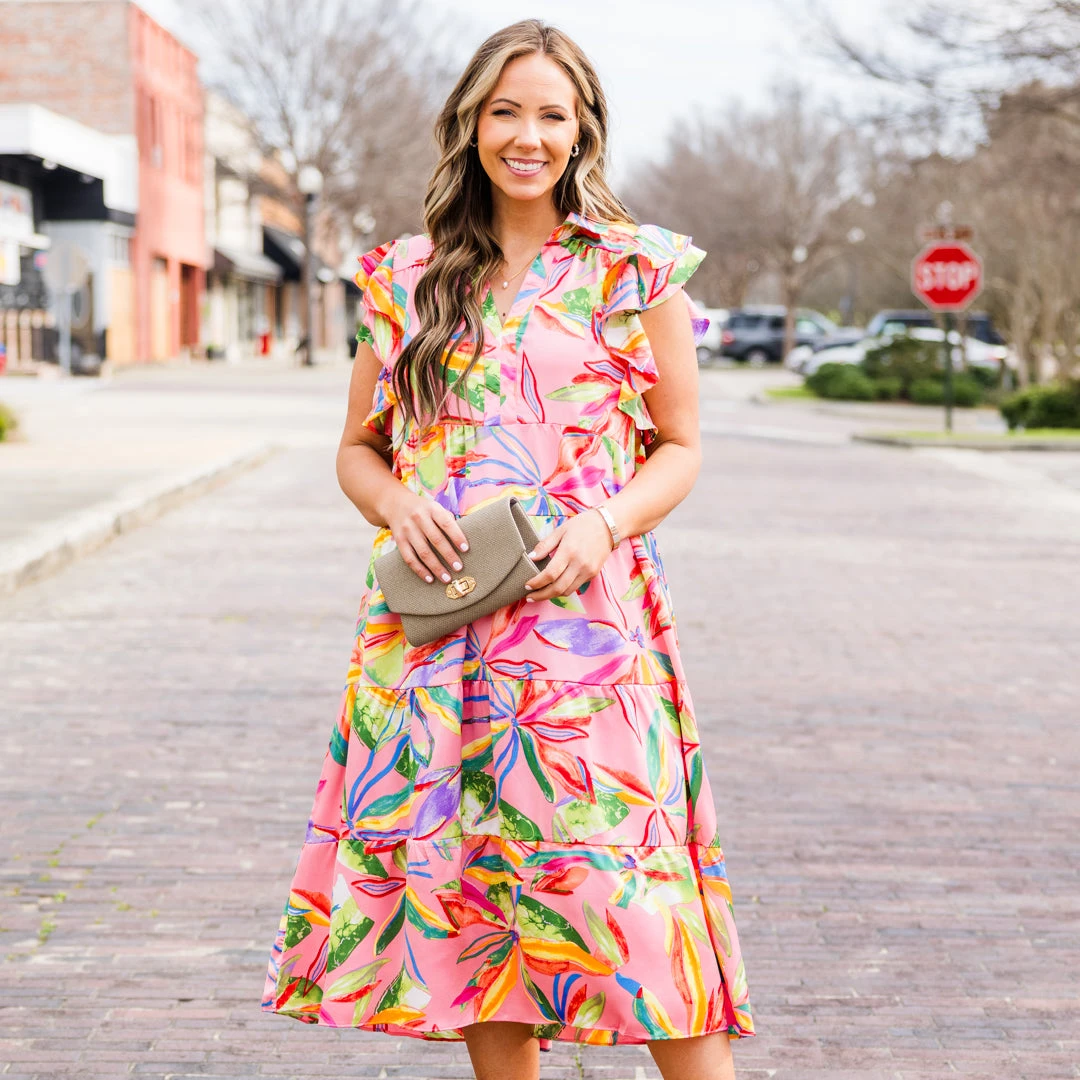 Blossom into the new season with this beauty! This dress features flutter sleeves and a flowy fit, exuding a delicate and feminine vibe! The pretty pink color and vibrant floral pattern add a touch of romance to any occasion!Â