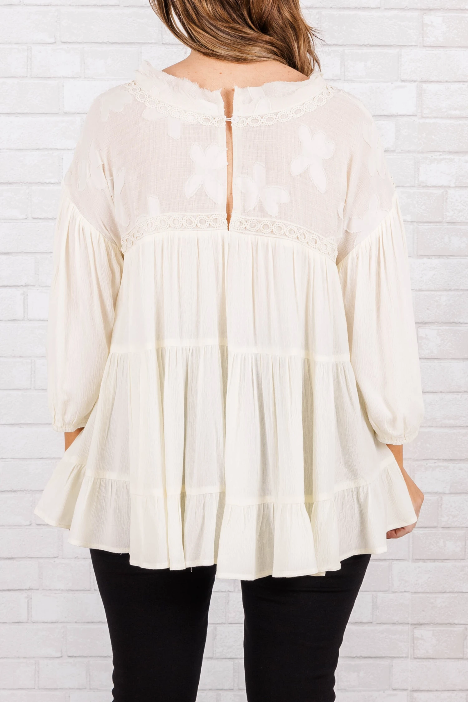 You’ll look and feel amazing in this fabulous top! Its babydoll silhouette has a flowy fit and beautiful cream color, enhancing any outfit! Adorned with delicate embroidery detailing and a high neckline, this top is both classy and timeless!