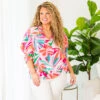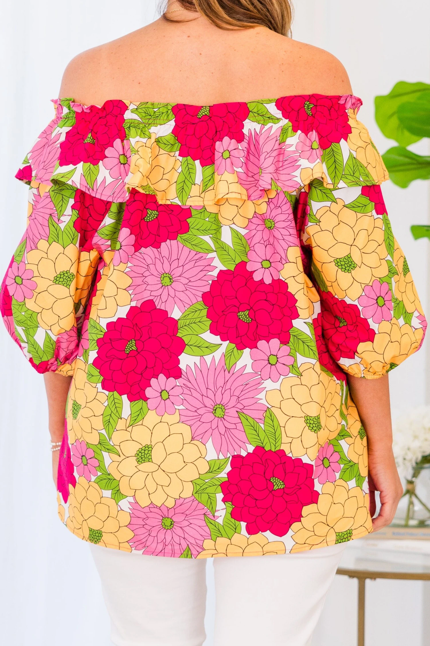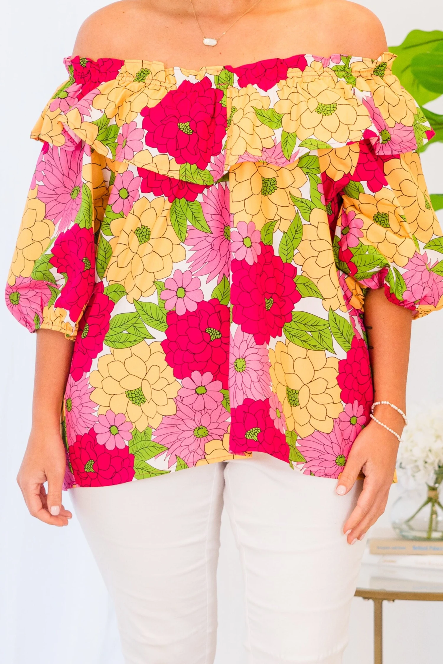 Effortlessly chic and feminine, our Promise It To Me Top in pink will be your new go-to piece! Featuring an off the shoulder neckline and elastic bubble sleeves, this top offers a flirty and comfortable fit! The ruffle detailing adds a touch of elegance while the bold floral print makes a statement!