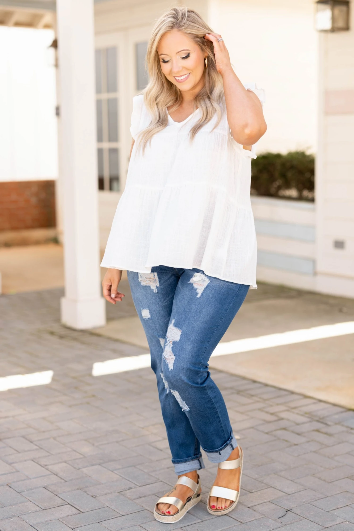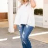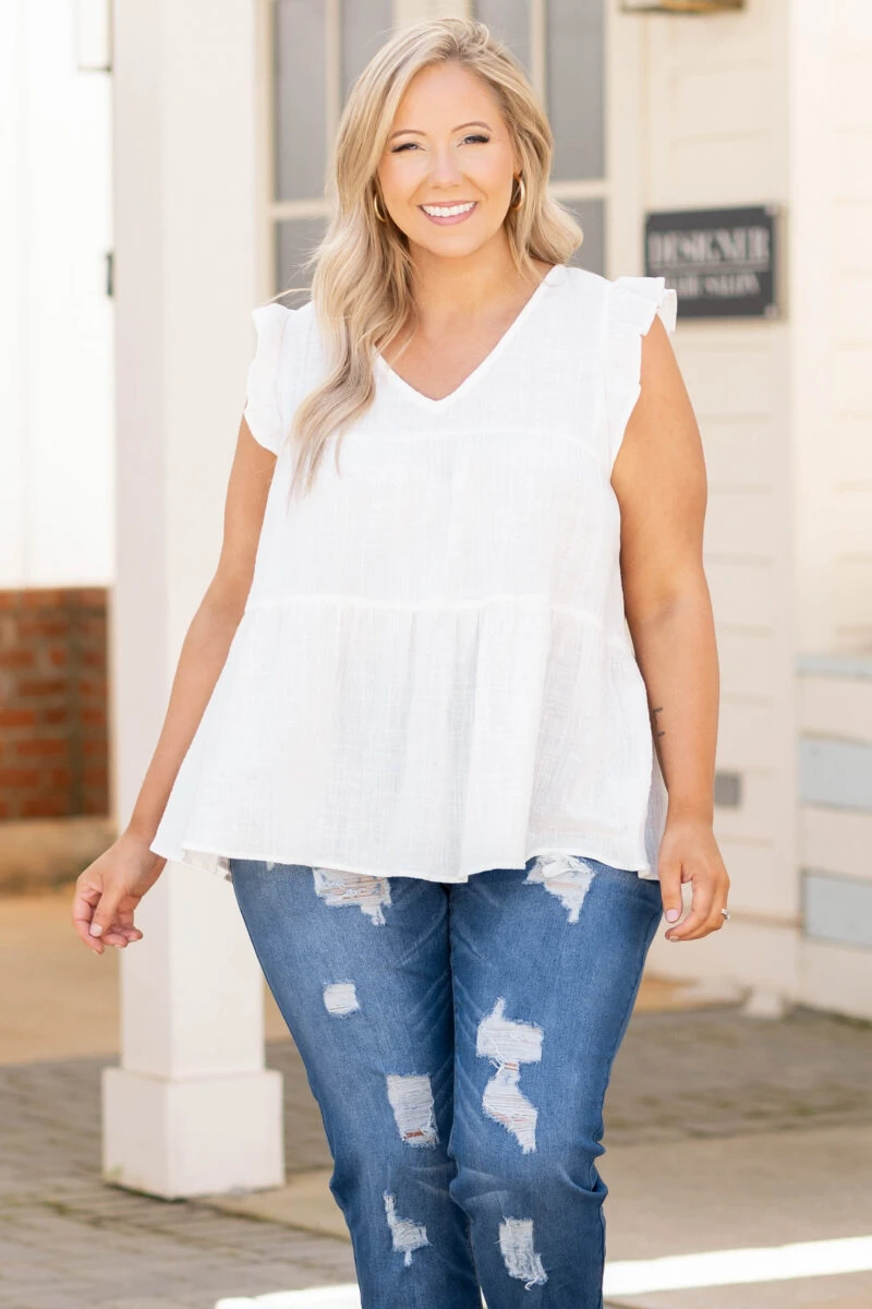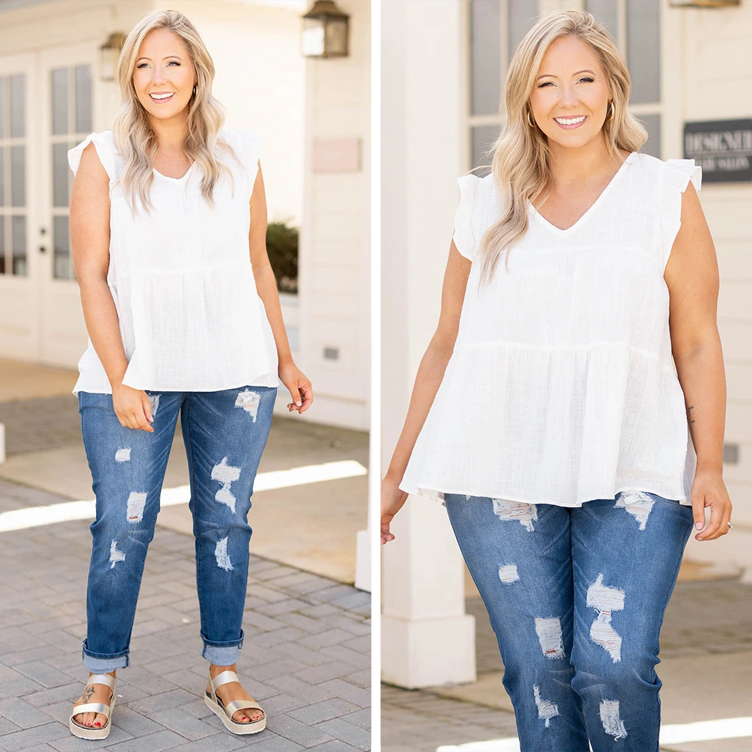 We are obsessing over this sweet top! The white color is perfect for warm weather and the babydoll style is our favorite because it flatters everyone! The flutter sleeves are so sweet too! Style this with some fun jeans and bold accessories for the perfect look!