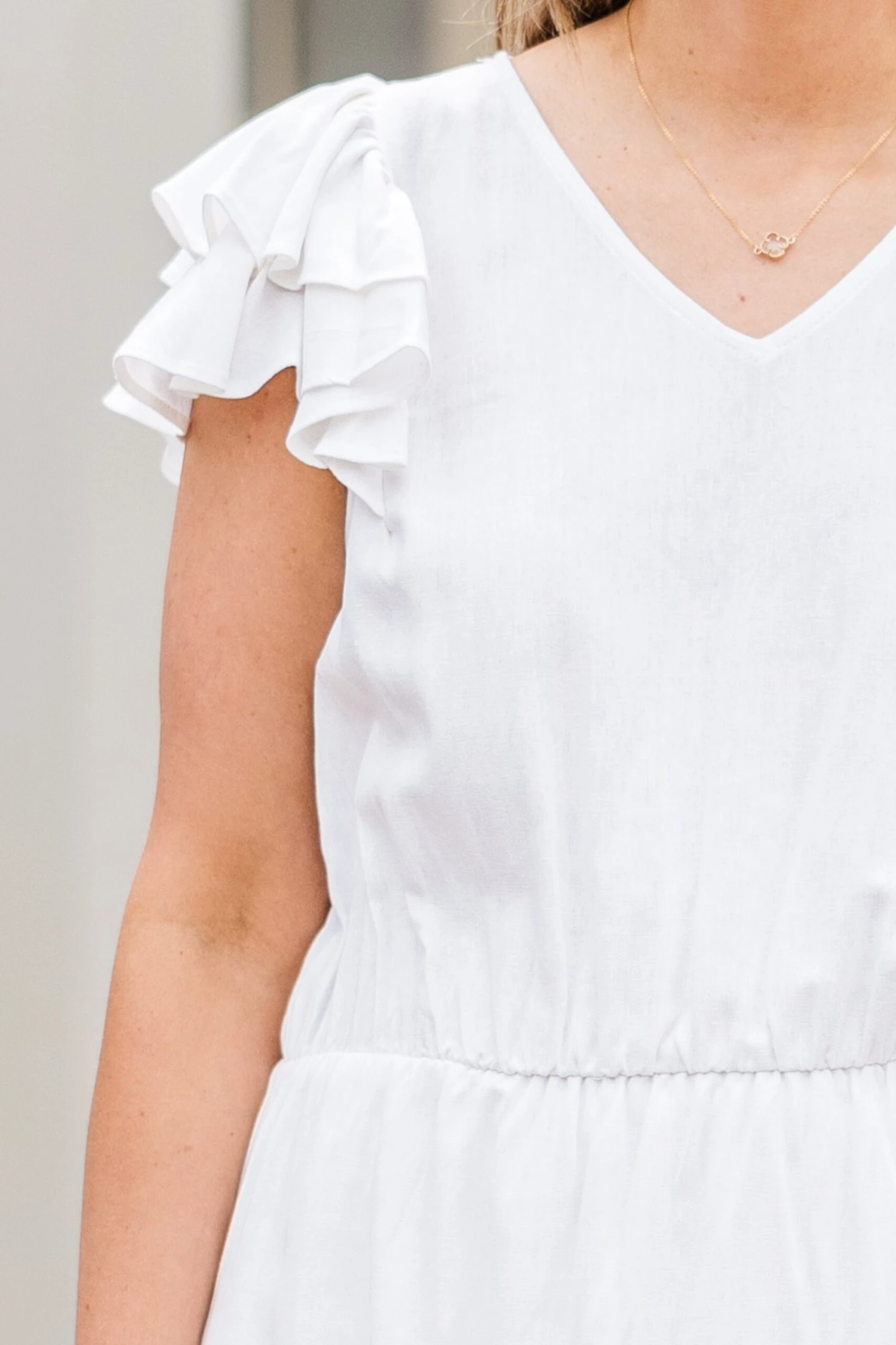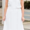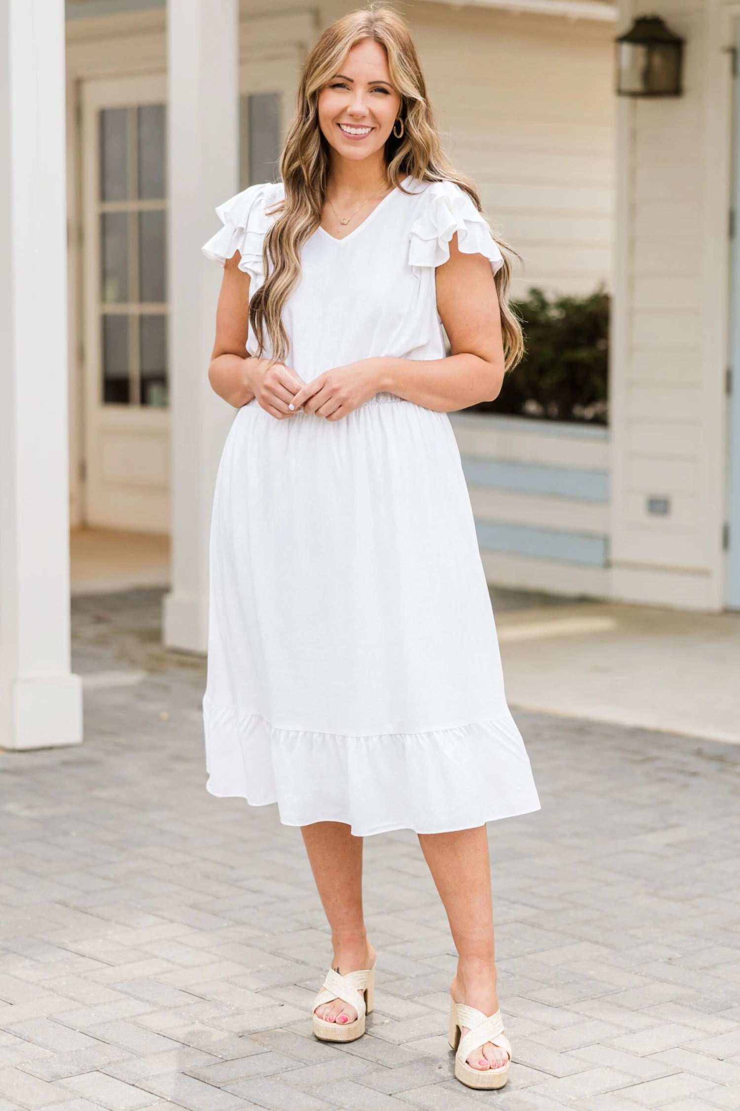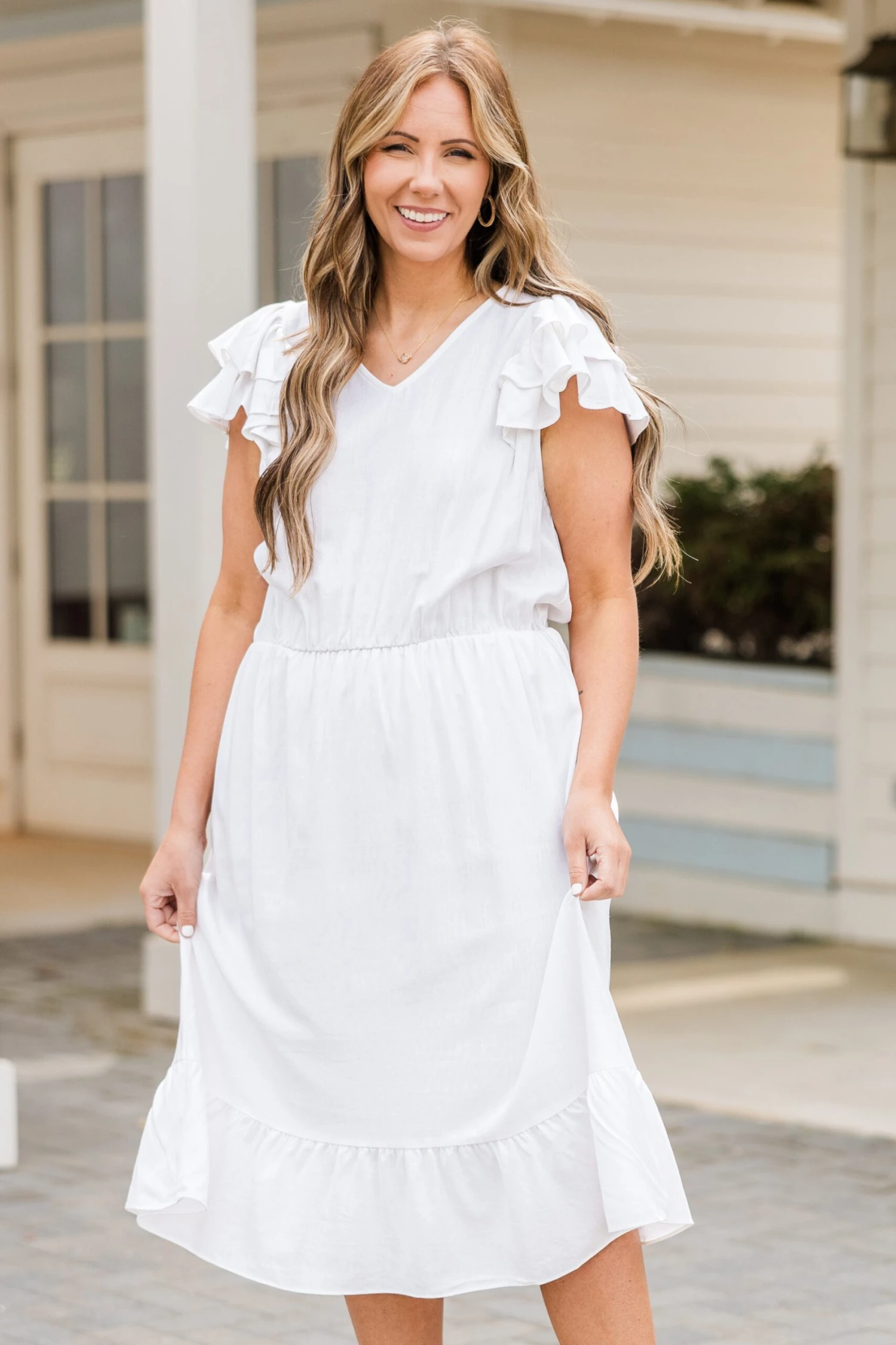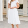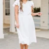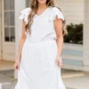 Effortlessly elegant, the Pure Radiance Dress in white features flutter sleeves and an elastic waistline for a comfortable yet flattering fit! The v-neckline adds a touch of sophistication to this versatile piece! Perfect for any occasion, this dress will make you feel confident and stylish!
